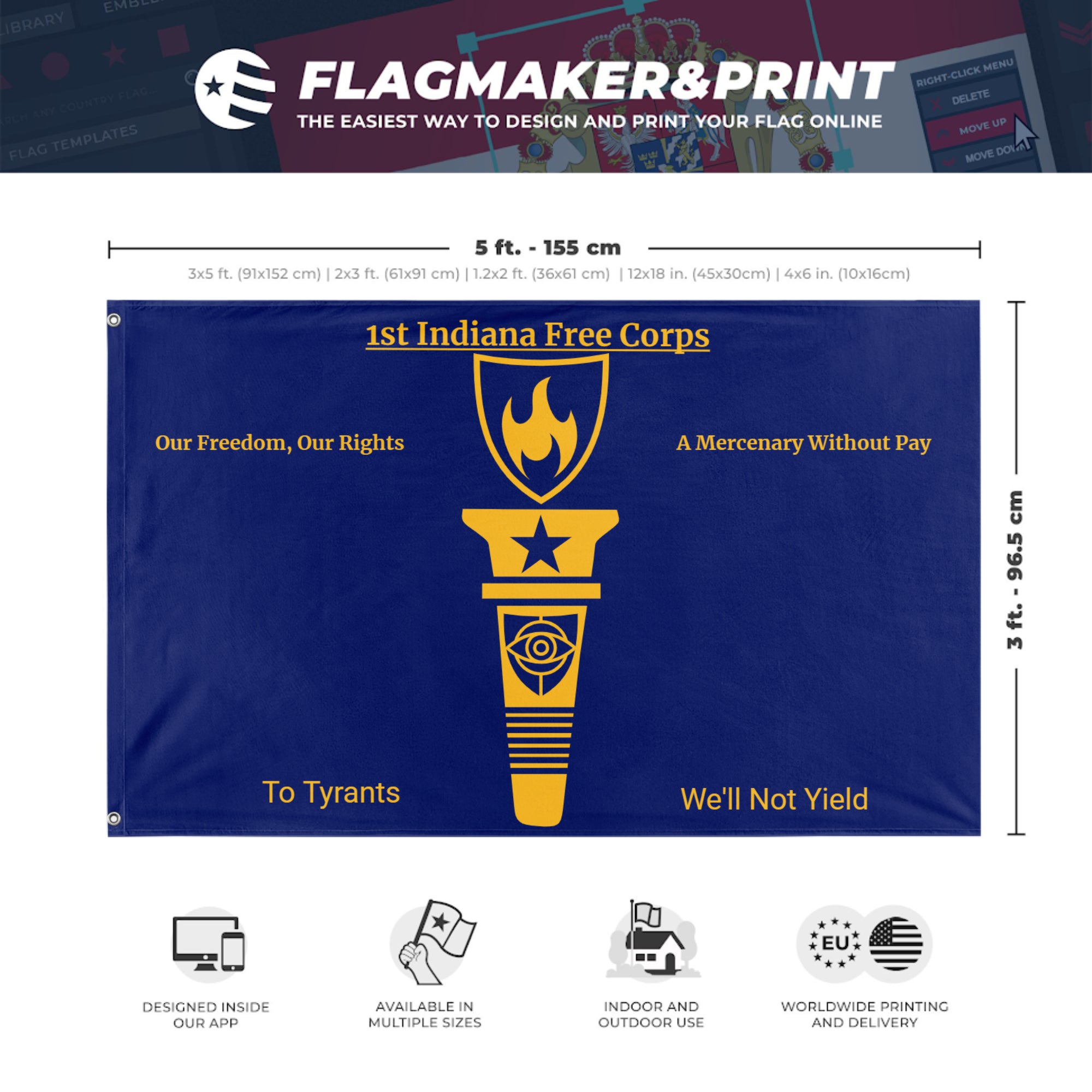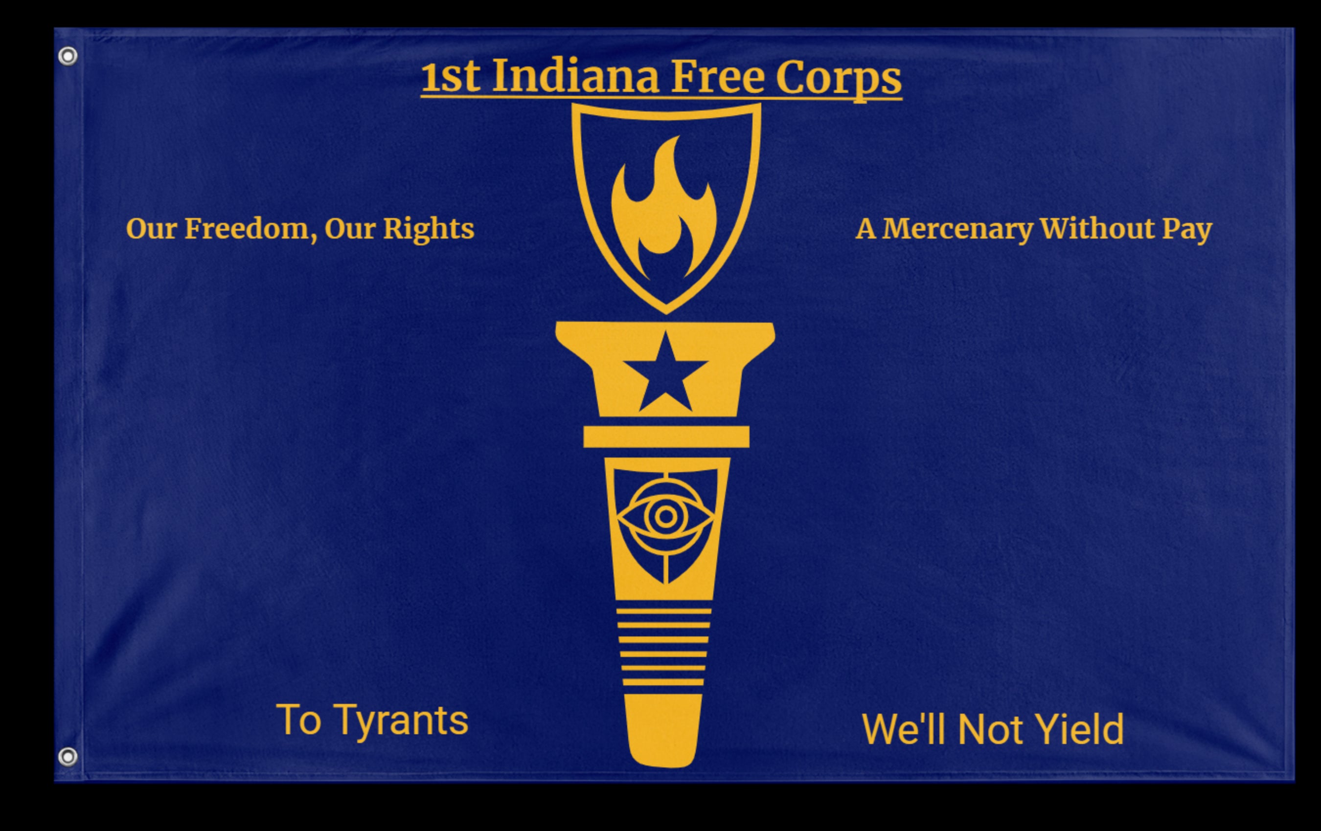 ✒️ The 1st Indiana Free Corps is a Black (anarchist) Militia regiment formed to defend the rights of people in Indiana from all powers, foreign and domestic, often being recruited for building security, political protection, and event security. The flame in the shield represents the protection of the people of the state, and the lone star in the torch represents independence. The security shield with the eye is a representation of vigilance and security. The 13 stripes (alternating navy blue and gold) represent the original 13 colonies from which the regiment's beliefs are based: life, Liberty, and the pursuit of Happiness. "A Mercenary Without Pay" comes from the 1920s song "Freikorps Voran" where the Regiment gets their inspiration from the German Freikorps (minus the fascism). "Our Freedom, Our Rights" is rooted in the American Revolution. "To Tyrants We'll Not Yield" Originated in the Bacon Rebellion, however was quickly picked up by the Confederacy. And now is used as a rallying cry to protect Indiana.