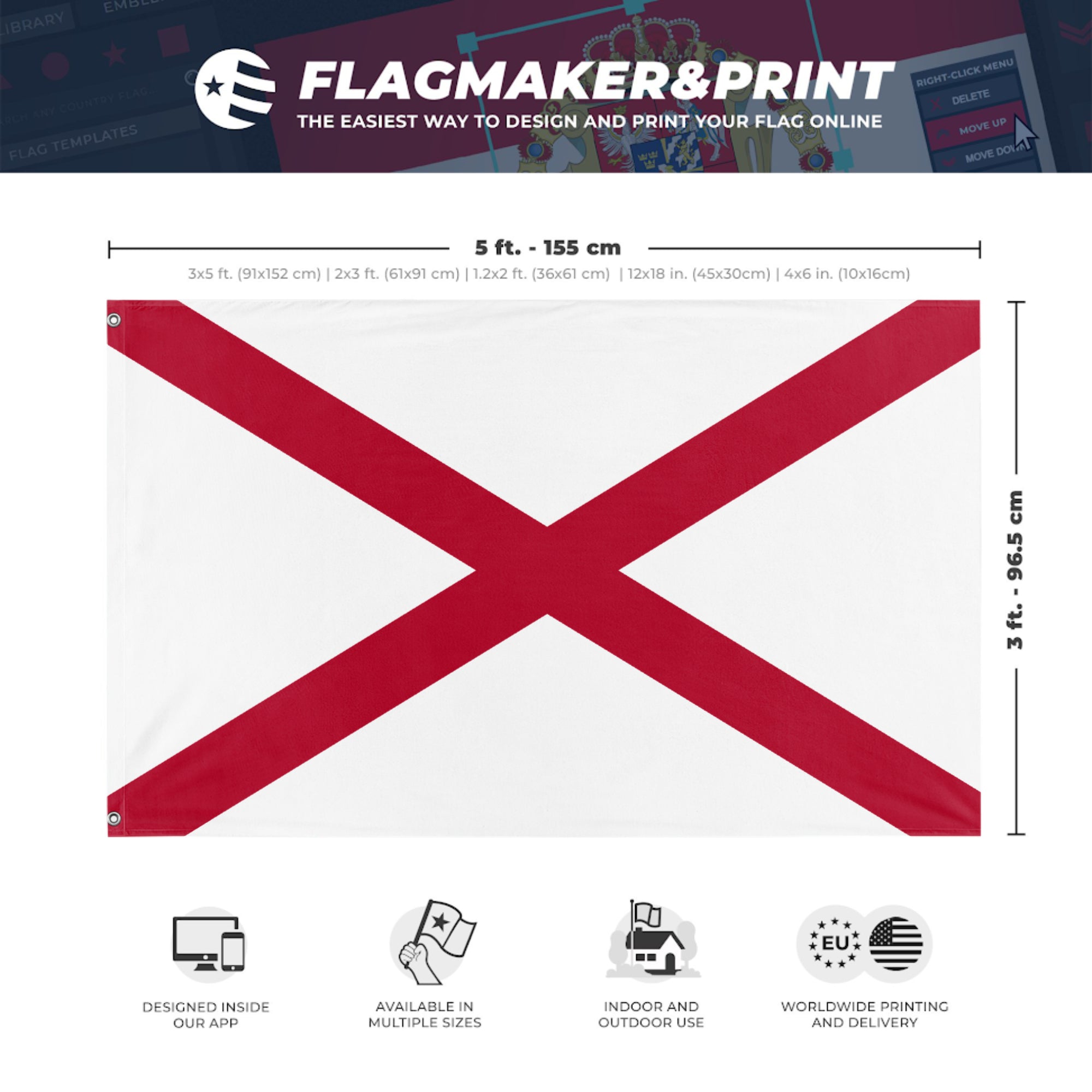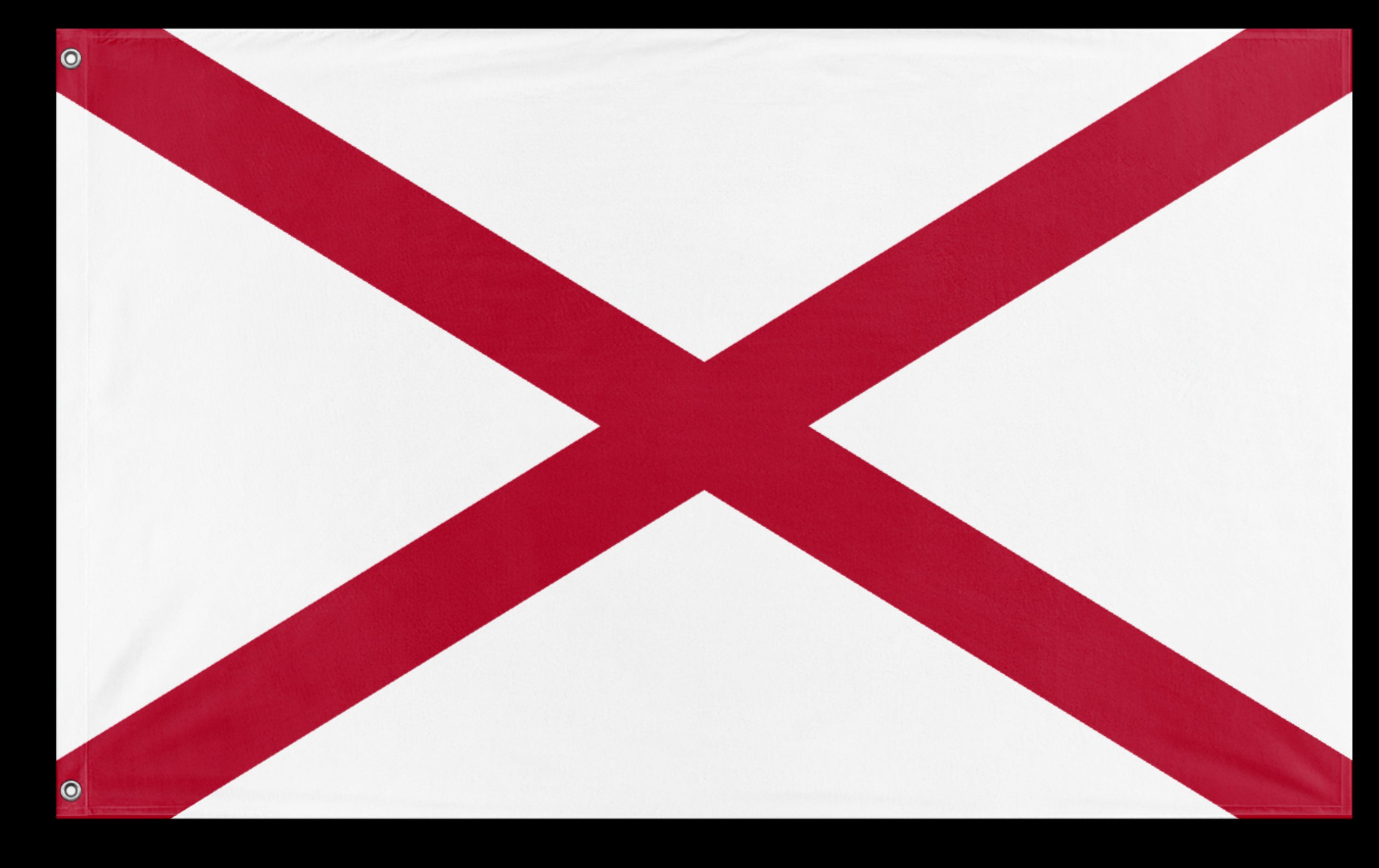 ✒️ The state flag of Alabama consists of a crimson St. Andrew’s cross, also known as a saltire, on a white field. Officially adopted by the Alabama state legislature on February 16, 1895, the design is simple and bears resemblance to the Confederate Battle Flag, reflecting the state’s historical ties to the Confederacy. The flag's proportions are to be a cross of a width not less than one-sixth the width of the flag itself, extending diagonally across the flag from corner to corner. There are no additional symbols or emblems on the flag, making it one of the simplest U.S. state flags in terms of design.