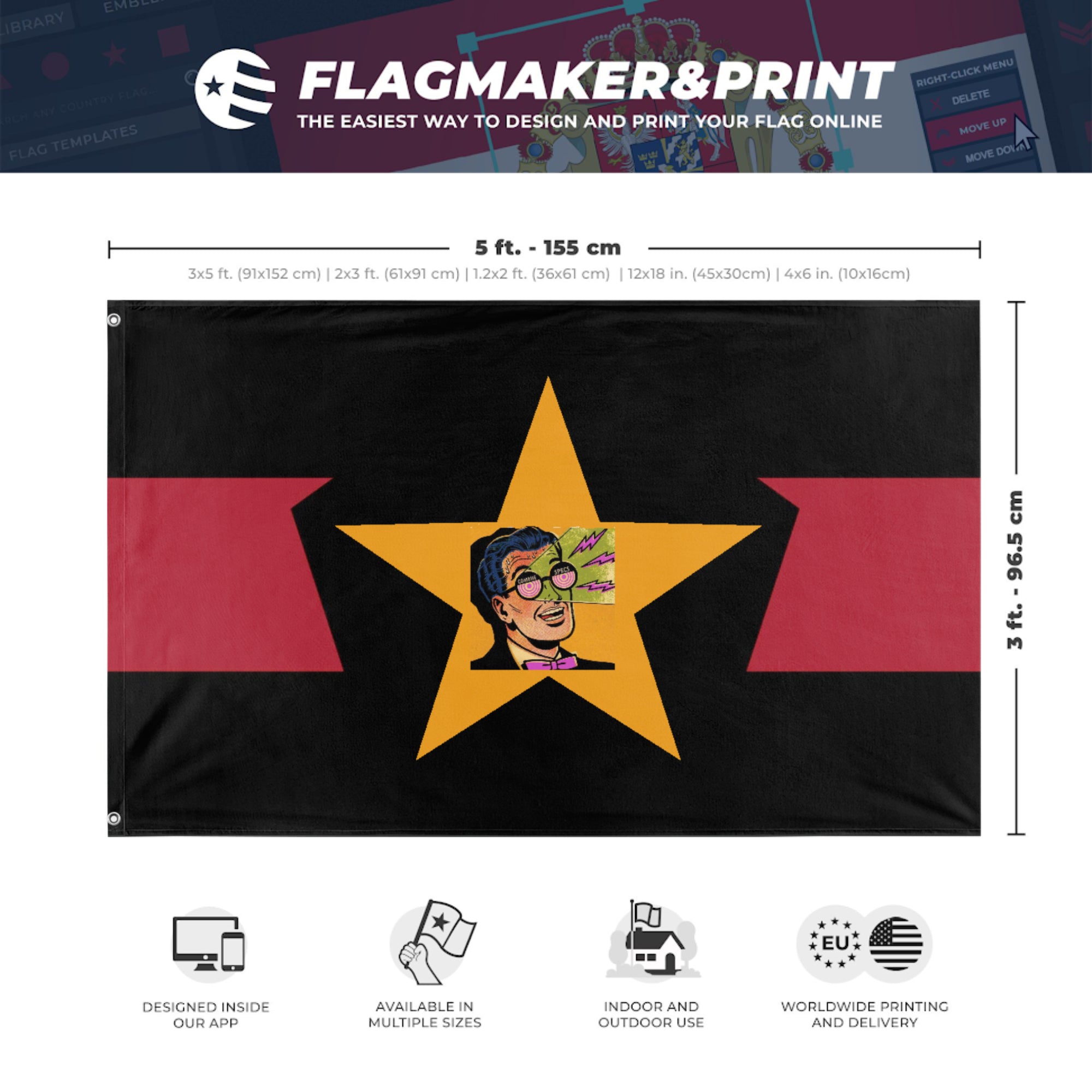 Our integrated flag maker app allows anyone to design and print their own flag. After finishing your design, you can print your flag in three easy steps.