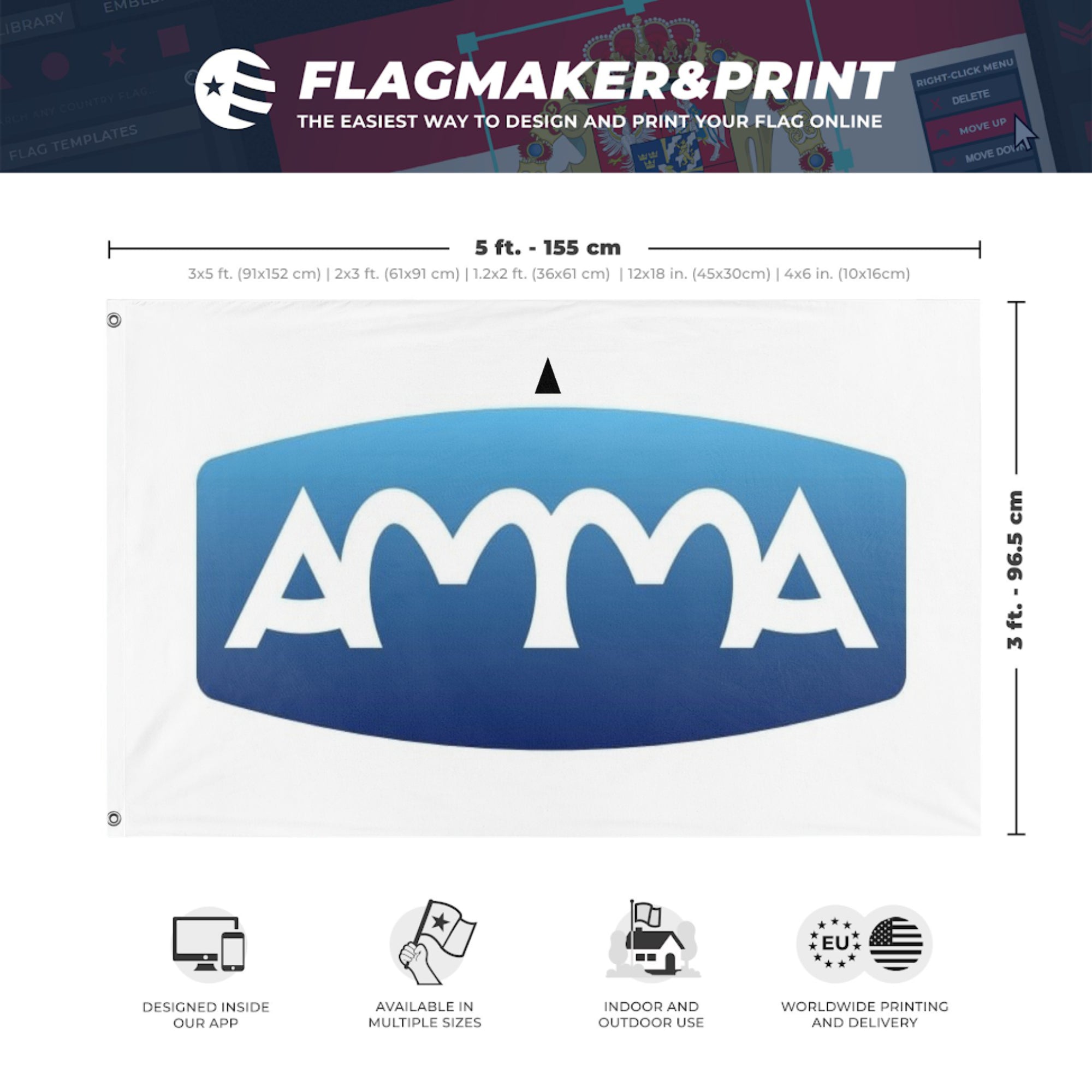 Our integrated flag maker app allows anyone to design and print their own flag. After finishing your design, you can print your flag in three easy steps.