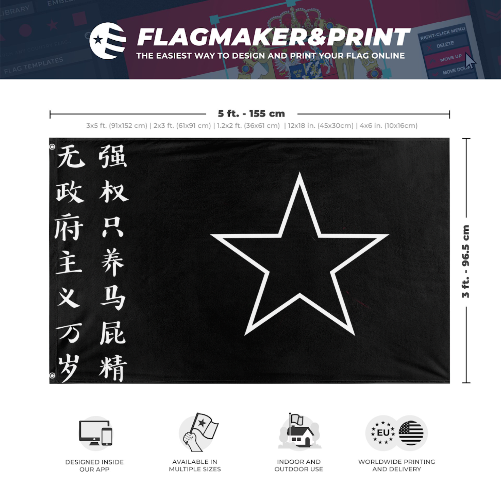 Our integrated flag maker app allows anyone to design and print their own flag. After finishing your design, you can print your flag in three easy steps.