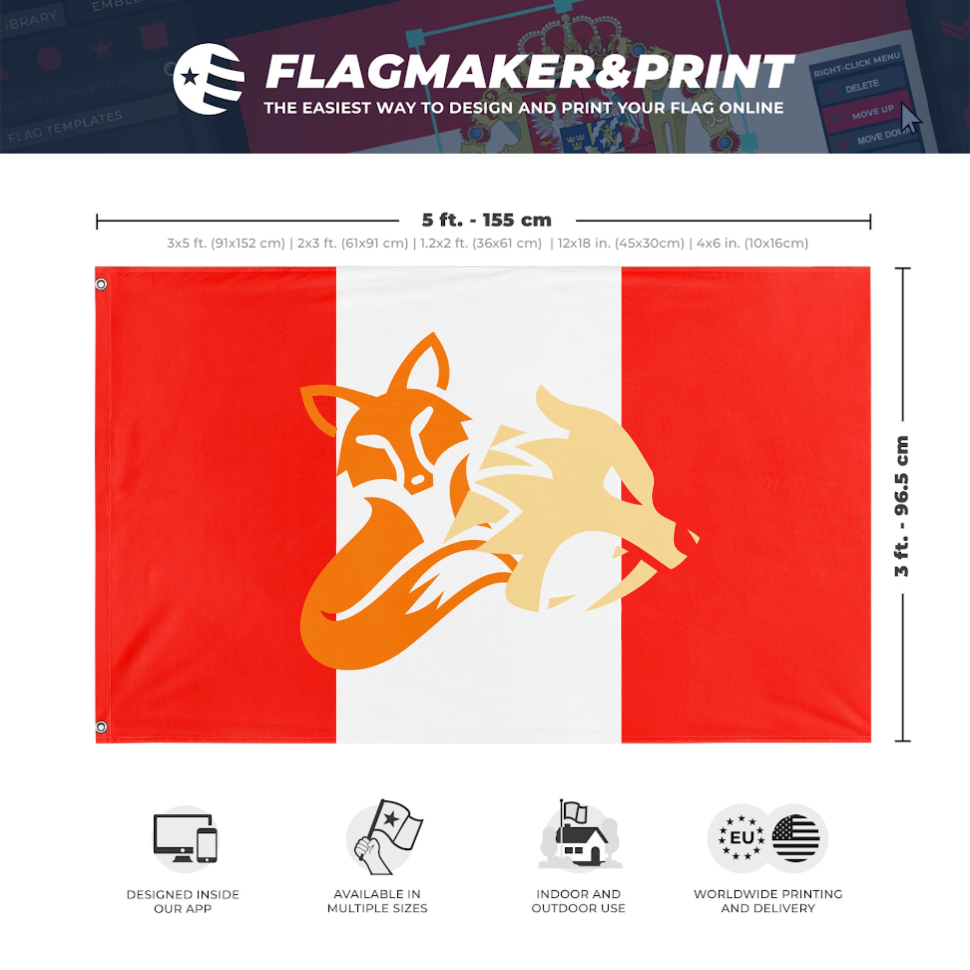 Our integrated flag maker app allows anyone to design and print their own flag. After finishing your design, you can print your flag in three easy steps.