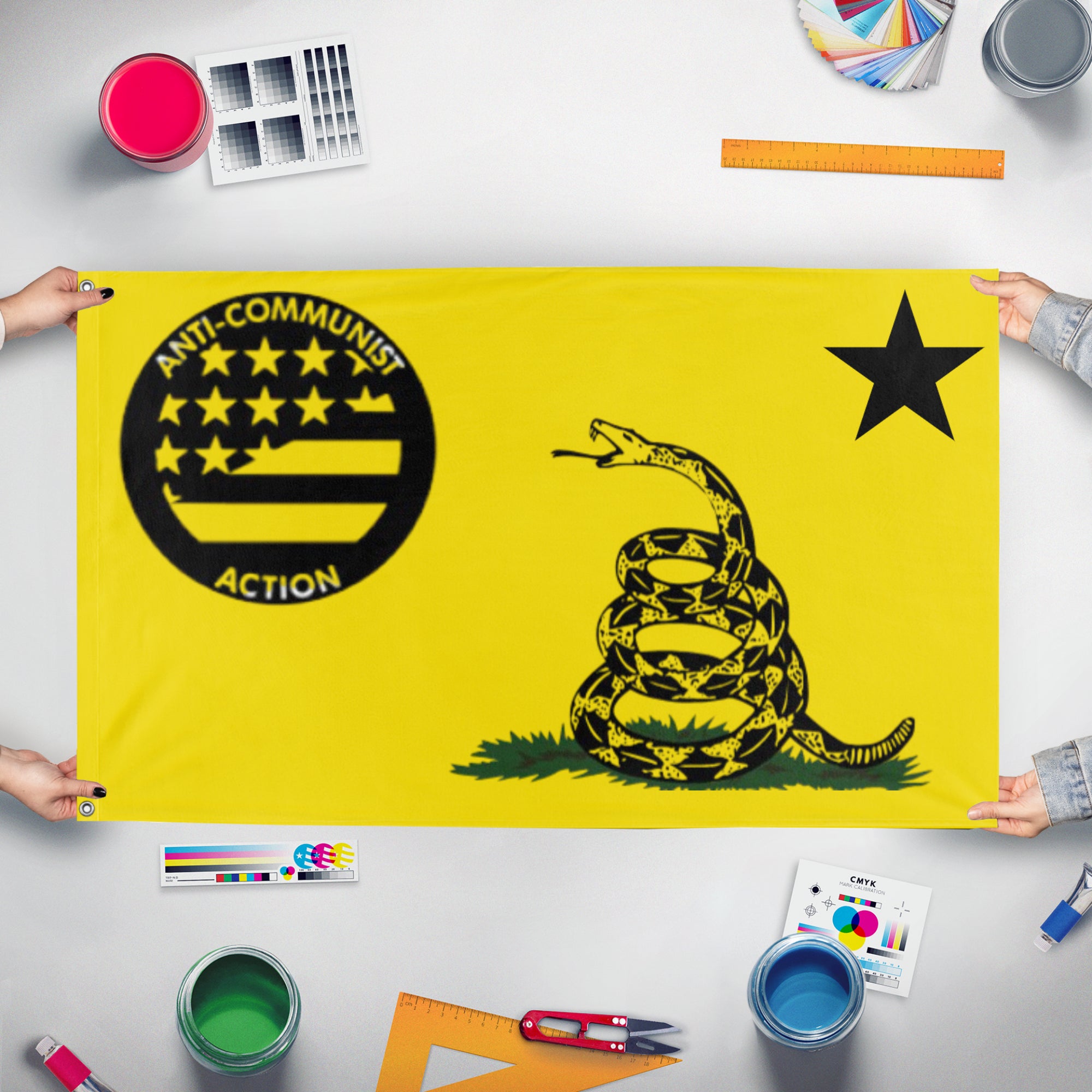 ✒️ The color yellow symbolizes Freedom. Communism does not support freedom. The color black symbolizes resistance. We resist Communism. The rattlesnake is a traditional symbol of liberty, as well as symbolizing our fight against communism. The star symbolizes Freedom from communism, as stars symbolize freedom and liberty.