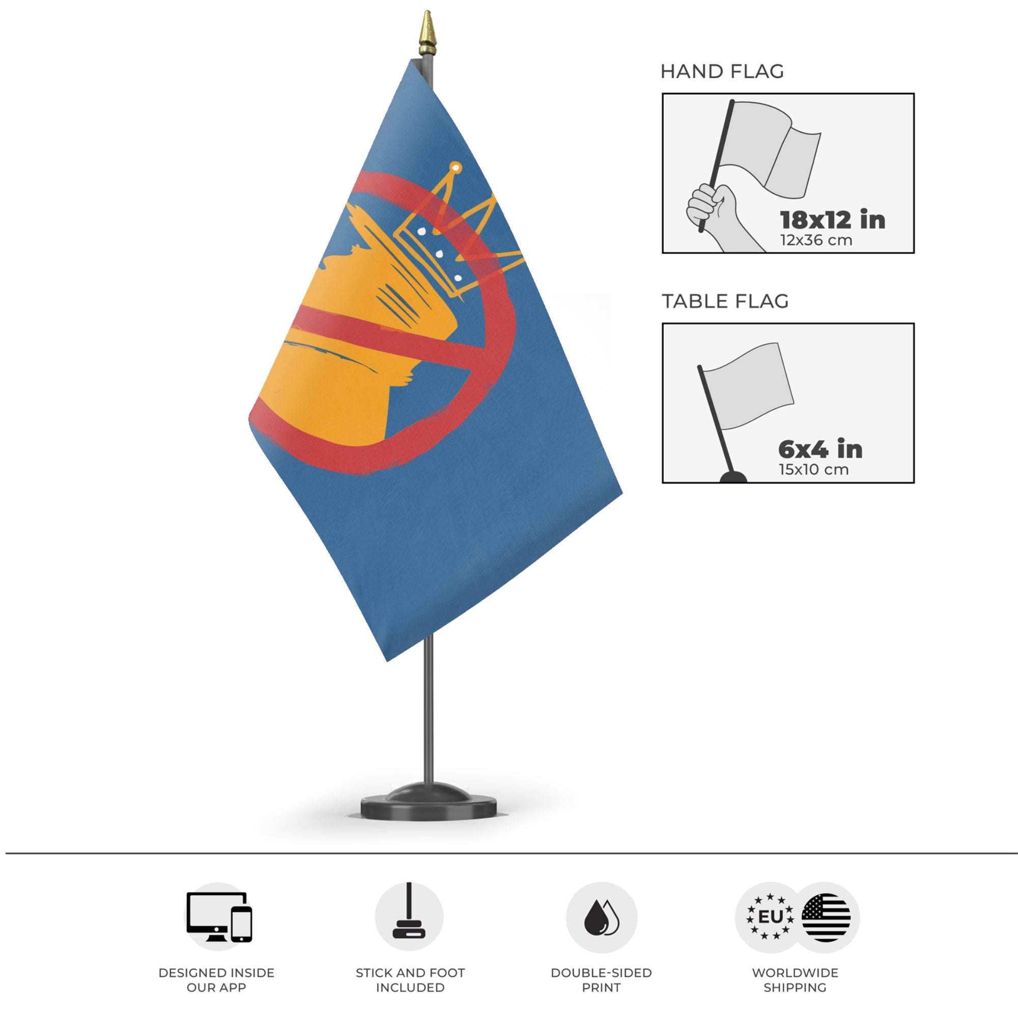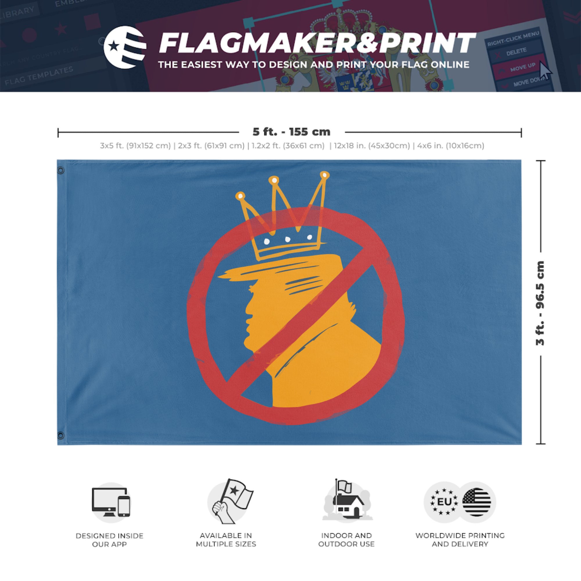 ✒️ The "No Kings In America" flag is a political protest banner that features a solid blue field. At its center is a graphic depicting an orange silhouette, identifiable as President Donald Trump, wearing a crown. This image is overlaid with a red "prohibited" or "no" symbol (a red circle with a diagonal slash). Below the graphic, the white, all-caps text "NO KINGS IN AMERICA" is displayed prominently. The flag's design directly communicates an anti-authoritarian message, equating the subject's political actions or aspirations with those of a monarch, which are fundamentally rejected. This flag is a key symbol of the "No Kings" movement, a series of large-scale, nationwide protests that emerged in the United States during 2025. Organized by a broad coalition of progressive groups, the movement protests what it describes as the authoritarian policies and democratic backsliding of the second Trump administration. The slogan and flag gained widespread visibility during major demonstrations, including the "No Kings Day" events on June 14, 2025. This date was chosen to contrast with a military parade and the president's 79th birthday, with organizers stating the protests served as a reminder that "America does not do kings."