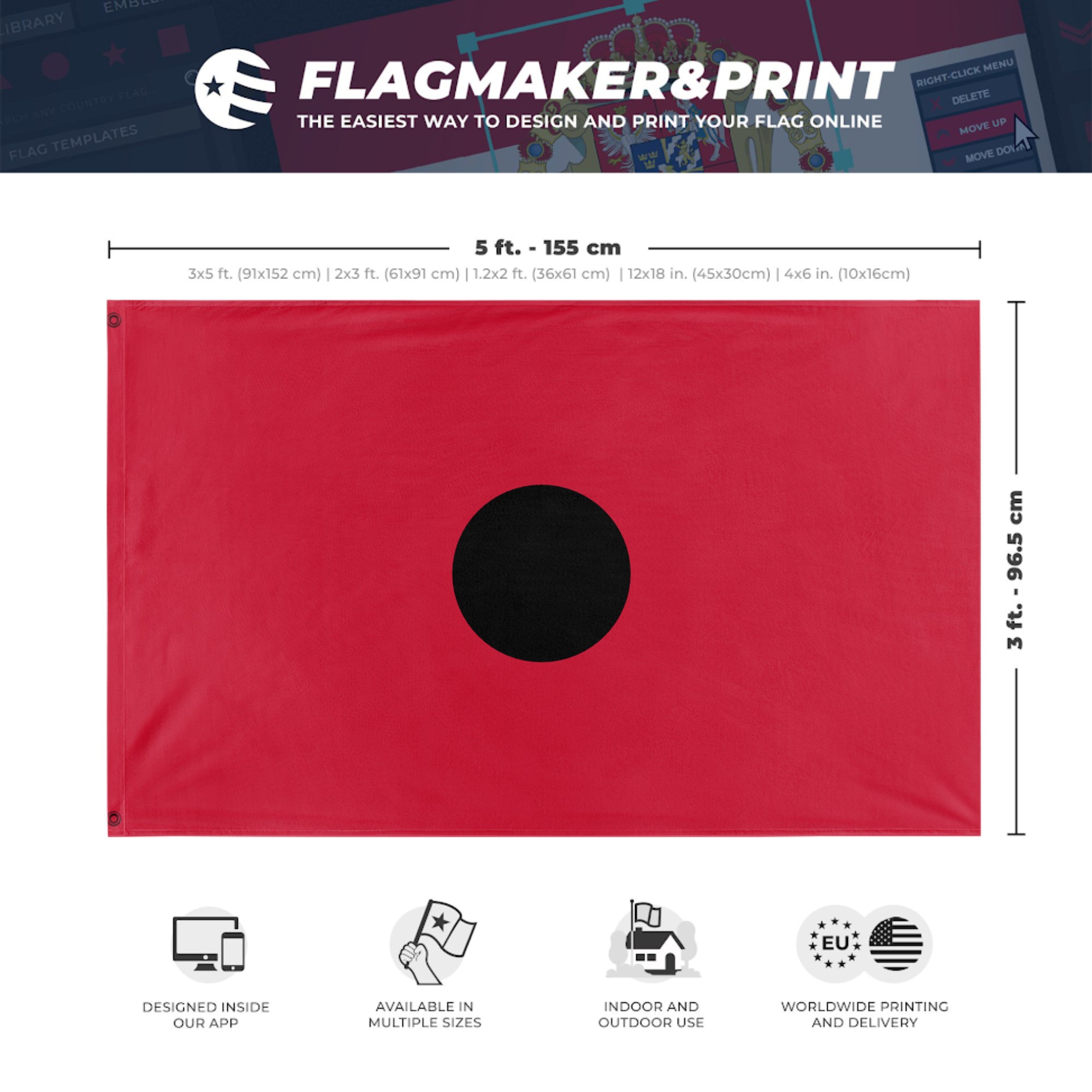 Our integrated flag maker app allows anyone to design and print their own flag. After finishing your design, you can print your flag in three easy steps.