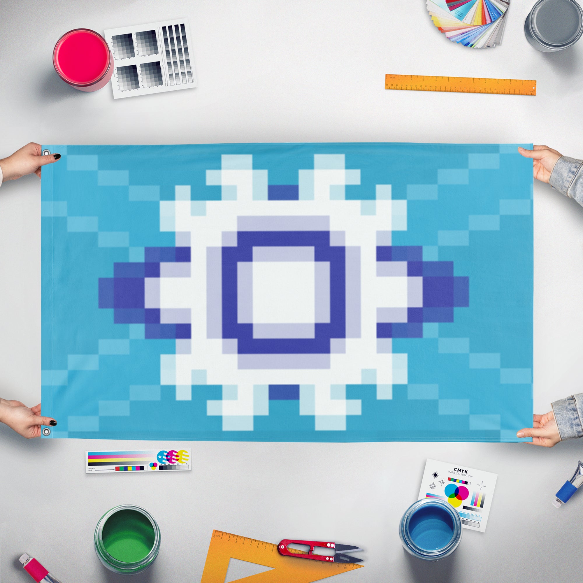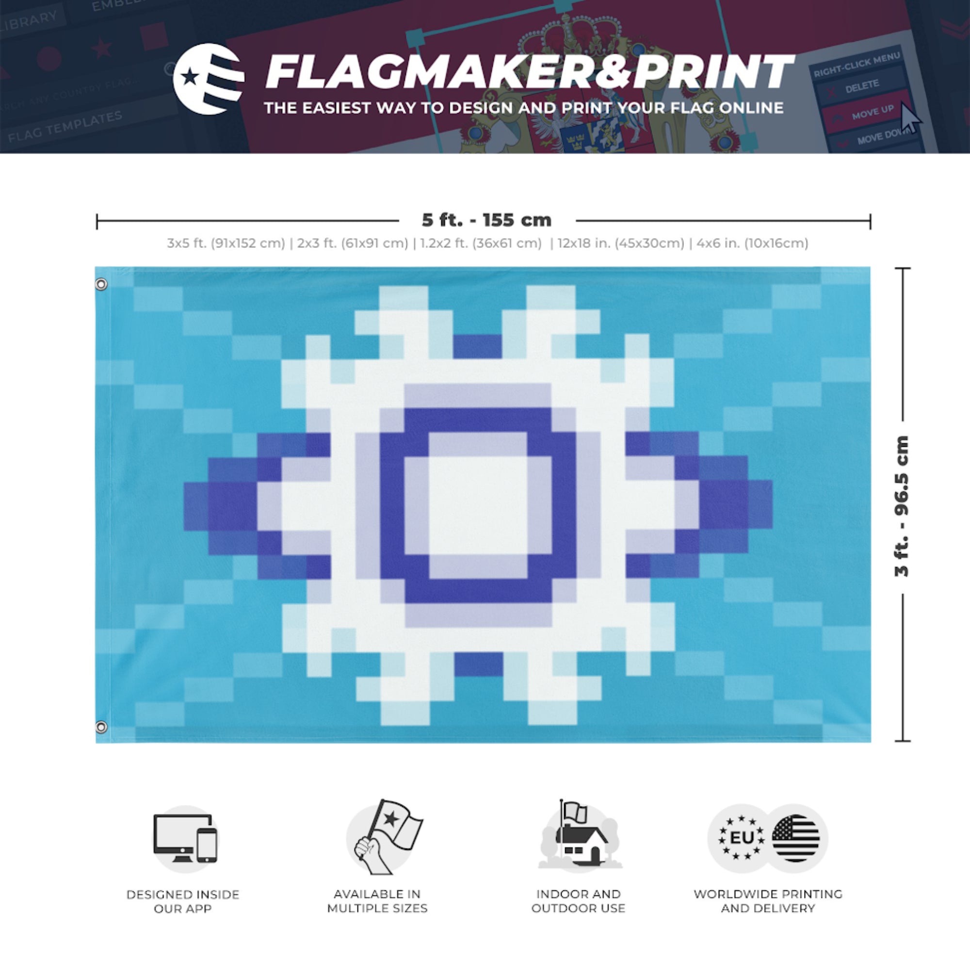 Our integrated flag maker app allows anyone to design and print their own flag. After finishing your design, you can print your flag in three easy steps.