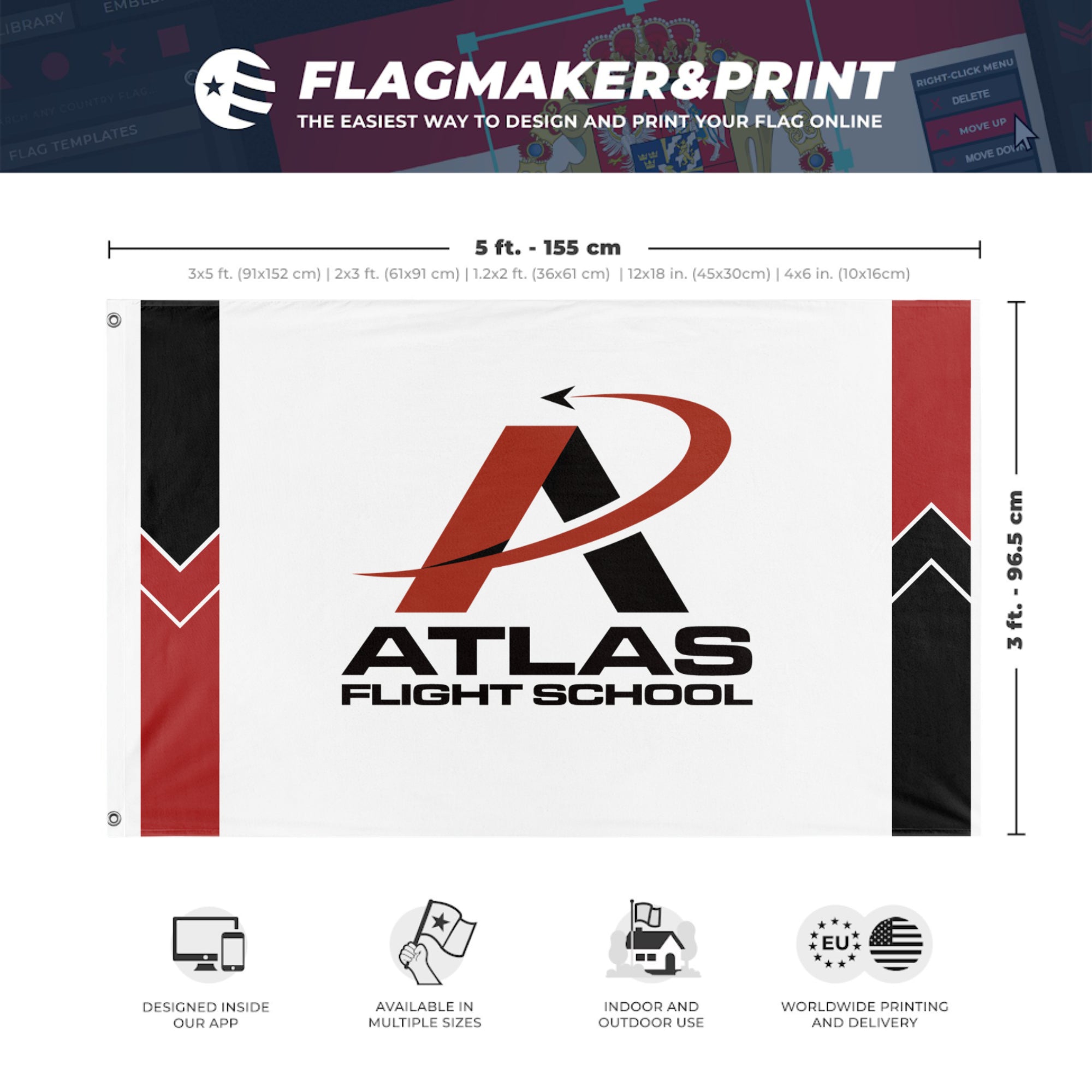 Our integrated flag maker app allows anyone to design and print their own flag. After finishing your design, you can print your flag in three easy steps.