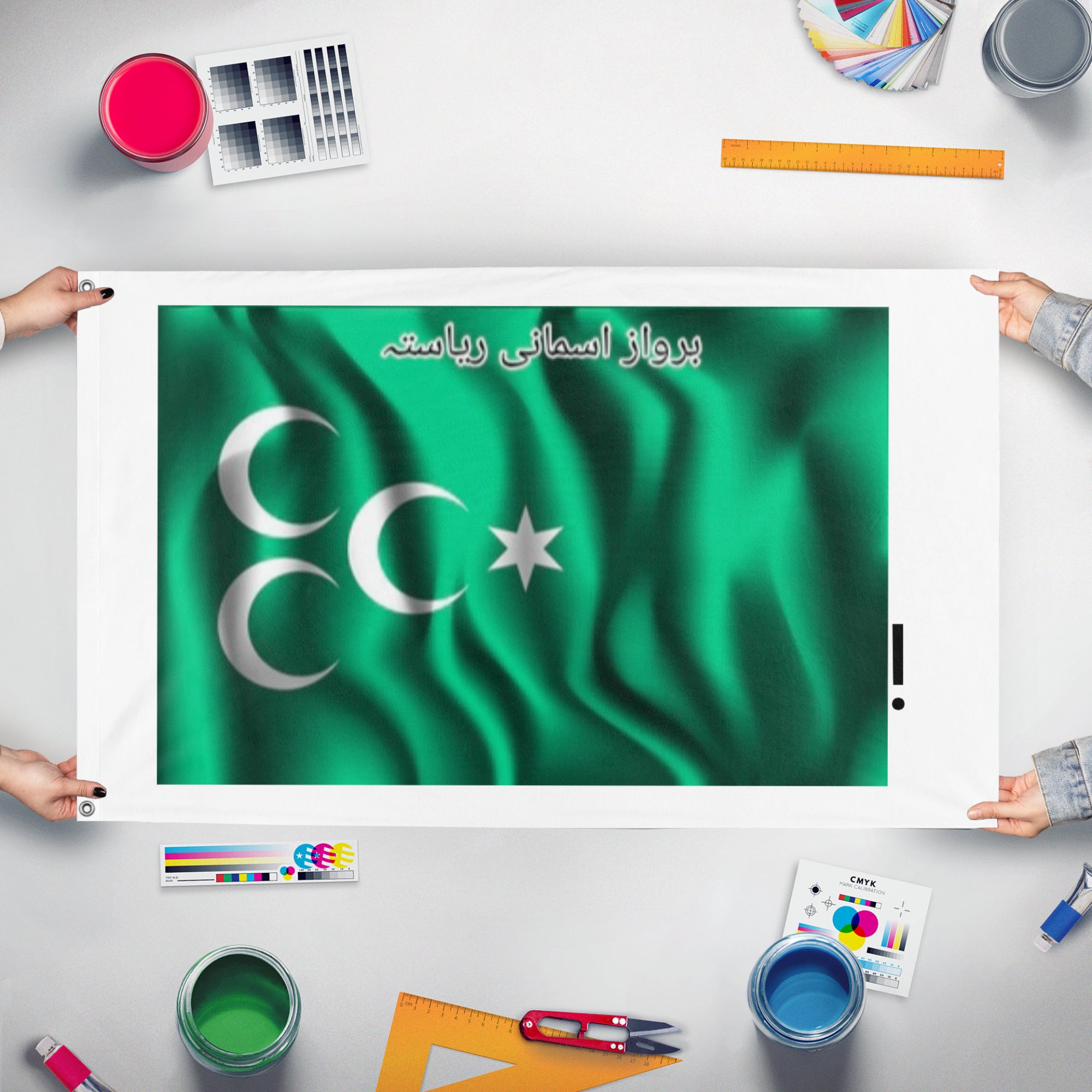 Our integrated flag maker app allows anyone to design and print their own flag. After finishing your design, you can print your flag in three easy steps.