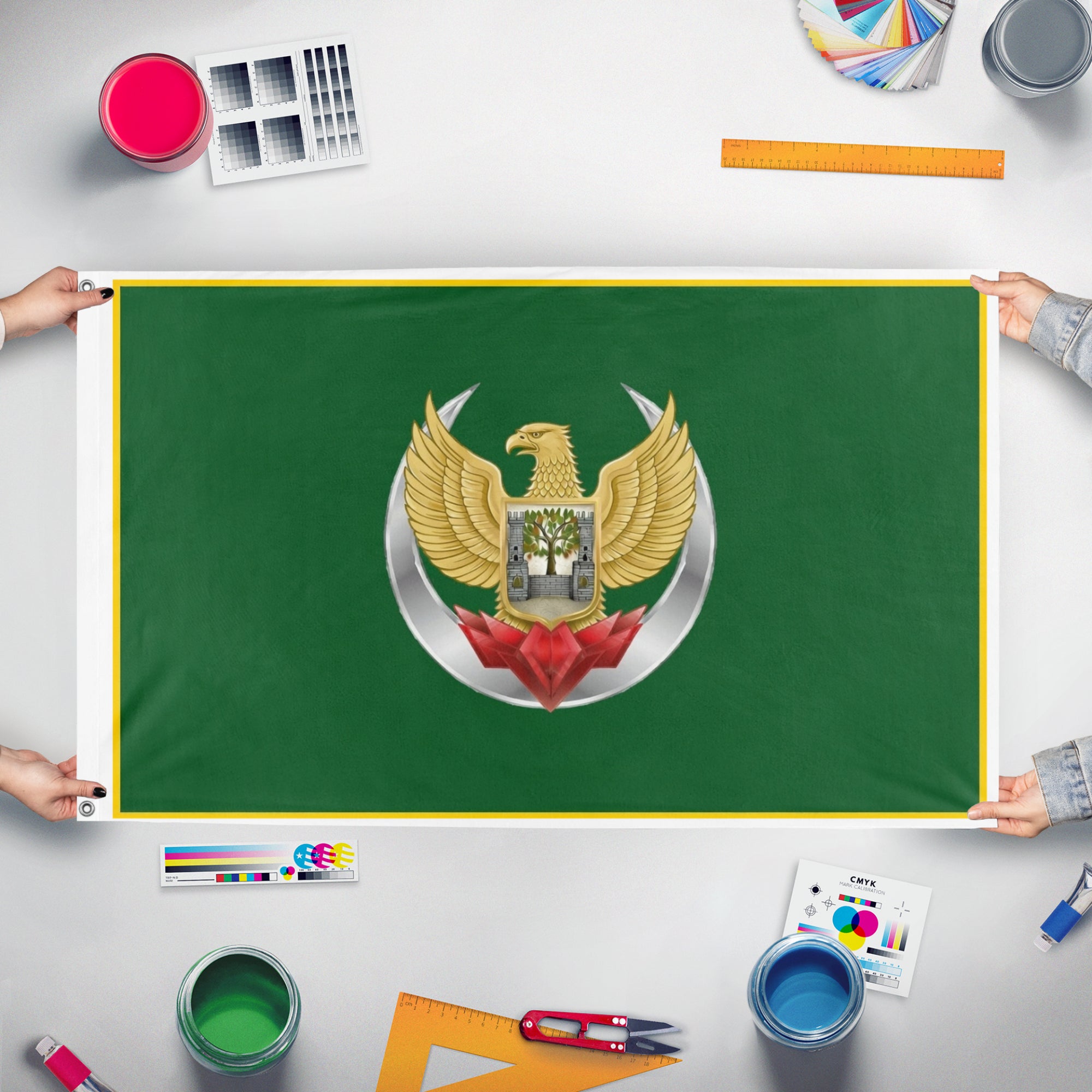 Our integrated flag maker app allows anyone to design and print their own flag. After finishing your design, you can print your flag in three easy steps.