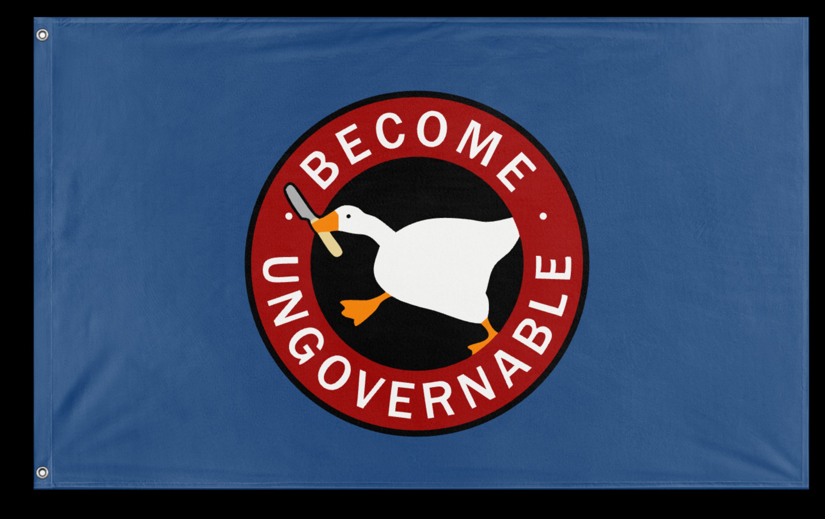 ✒️ “Become Ungovernable” is a political slogan and meme that has emerged prominently within activist and countercultural circles in the 21st century. Often appearing on flags, posters, and digital media, the phrase signifies resistance to authoritarianism, societal conformity, and institutional control. It is associated with anarchist, anti-capitalist, and radical leftist ideologies, and is used to express a commitment to autonomy, civil disobedience, and direct action. The slogan has gained traction in online communities and protest movements, serving both as a rallying cry and a symbol of defiance against perceived systemic oppression.