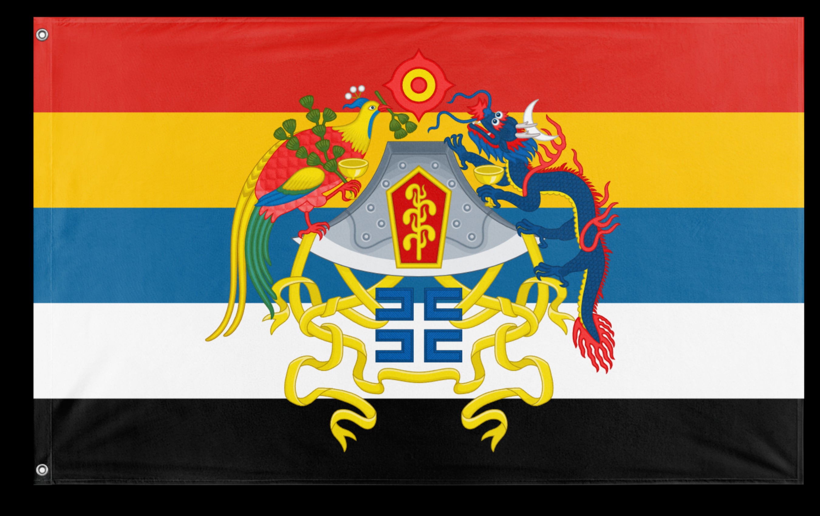 The Qing Empire Pride Flag is a fictional, alternative history (alt-history) flag design that combines the emblems of Imperial China with the modern LGBTQ+ pride flag. The design consists of the six-color rainbow pride flag (red, orange, yellow, green, blue, and violet) serving as the field. Superimposed over this background is a large, traditional Chinese dragon, a potent symbol of imperial power, particularly associated with the Qing dynasty. The heraldic dragon is depicted in vibrant colors, coiling around a central red pearl, creating a synthesis of contemporary political identity and historical Chinese heraldry.
