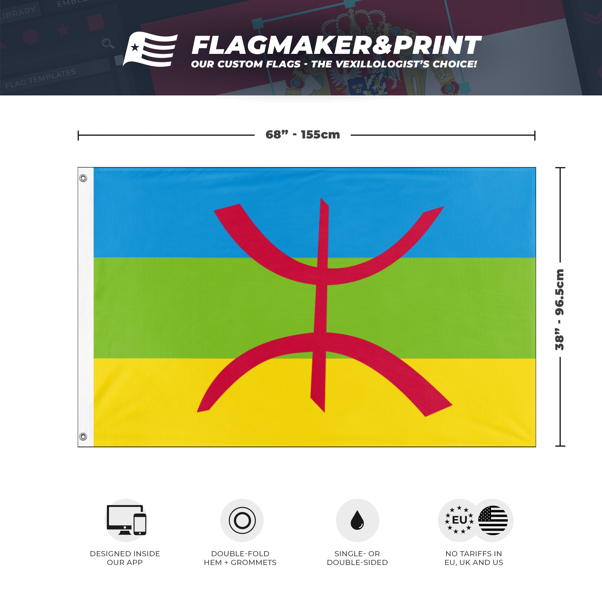 Our integrated flag maker app allows anyone to design and print their own flag. After finishing your design, you can print your flag in three easy steps.
