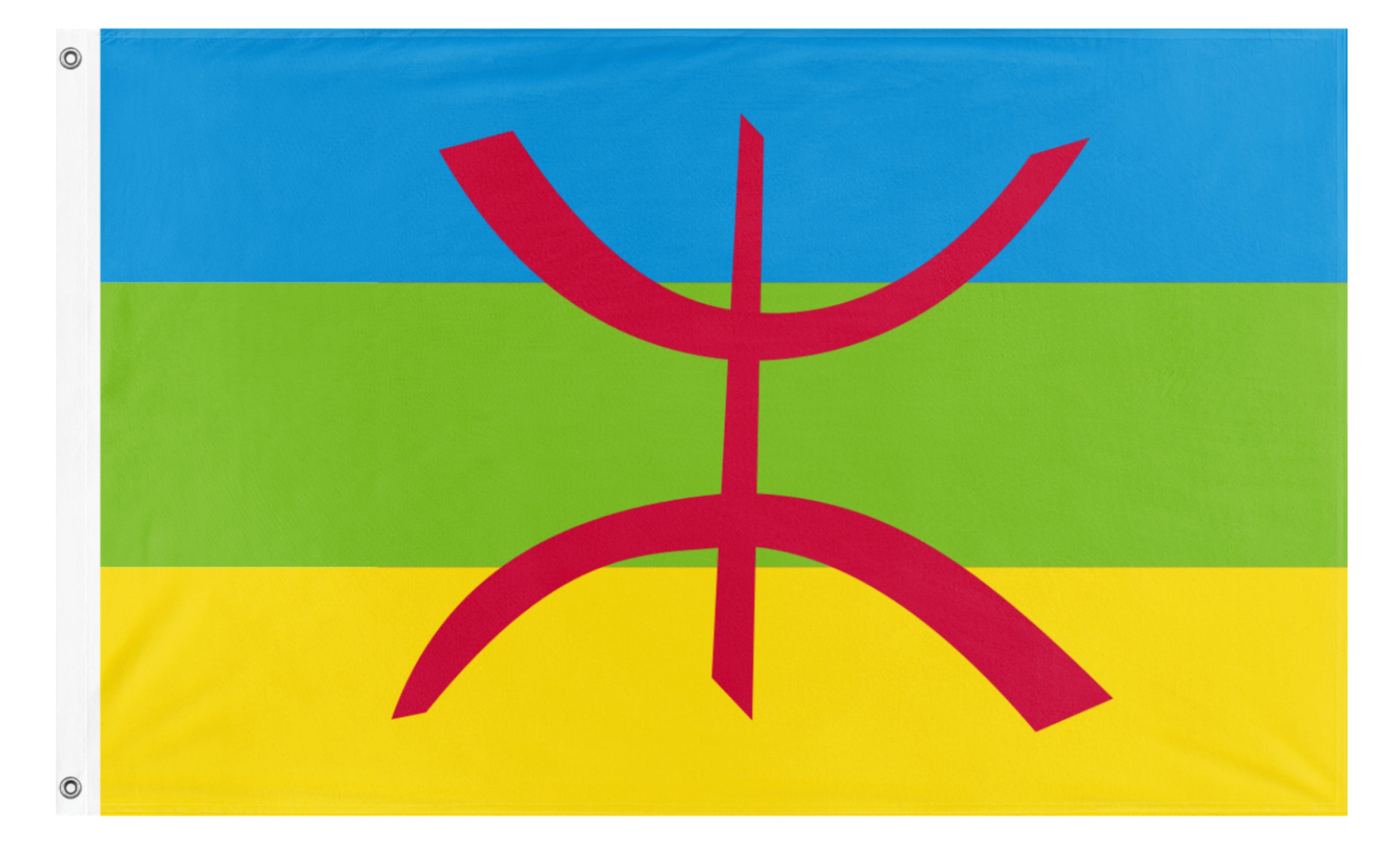 ✒️ The flag is composed of blue, green, and yellow horizontal bands of the same height, and a Tifinagh letter yaz or aza.[1][2] Each colour corresponds to an aspect of Tamazgha, the territory inhabited by the Berbers in North Africa: Blue represents the sea. Green represents the mountains. Yellow represents the desert. The red of the letter z (ⵣ in Tifinagh) represents resistance and the martyrs/free man of the Imazighen. The letter z represents the word Amazigh, the root of which it is taken from. (Wikipedia)