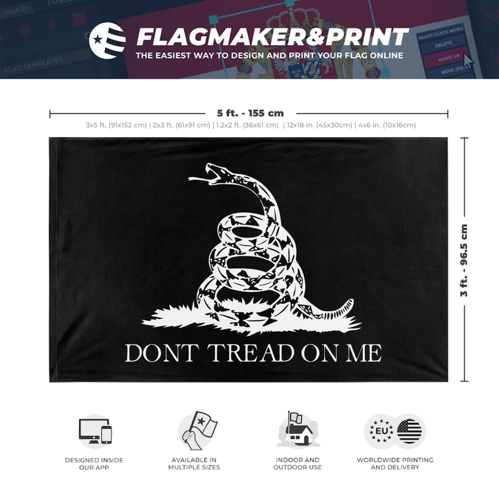 Our integrated flag maker app allows anyone to design and print their own flag. After finishing your design, you can print your flag in three easy steps.