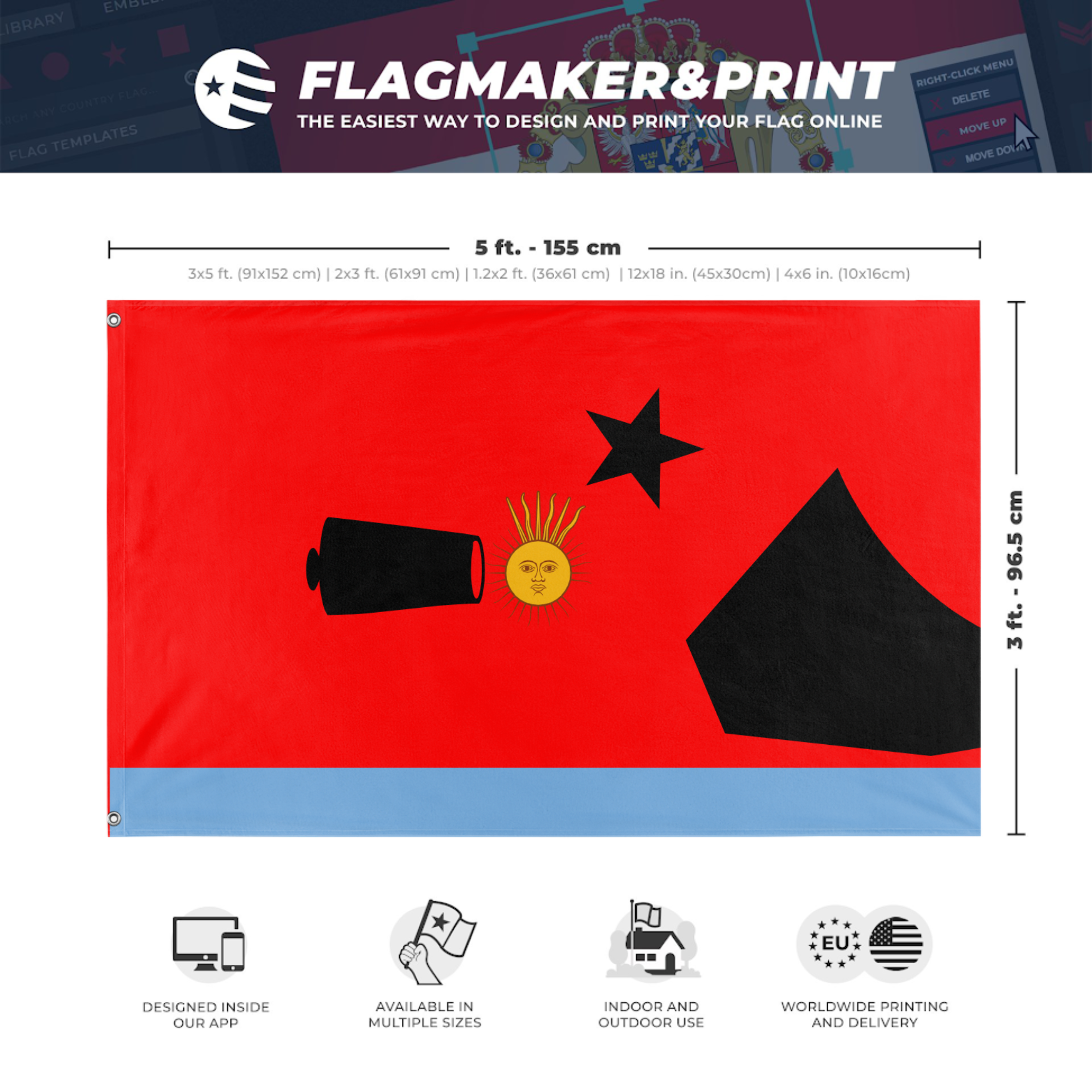 Our integrated flag maker app allows anyone to design and print their own flag. After finishing your design, you can print your flag in three easy steps.