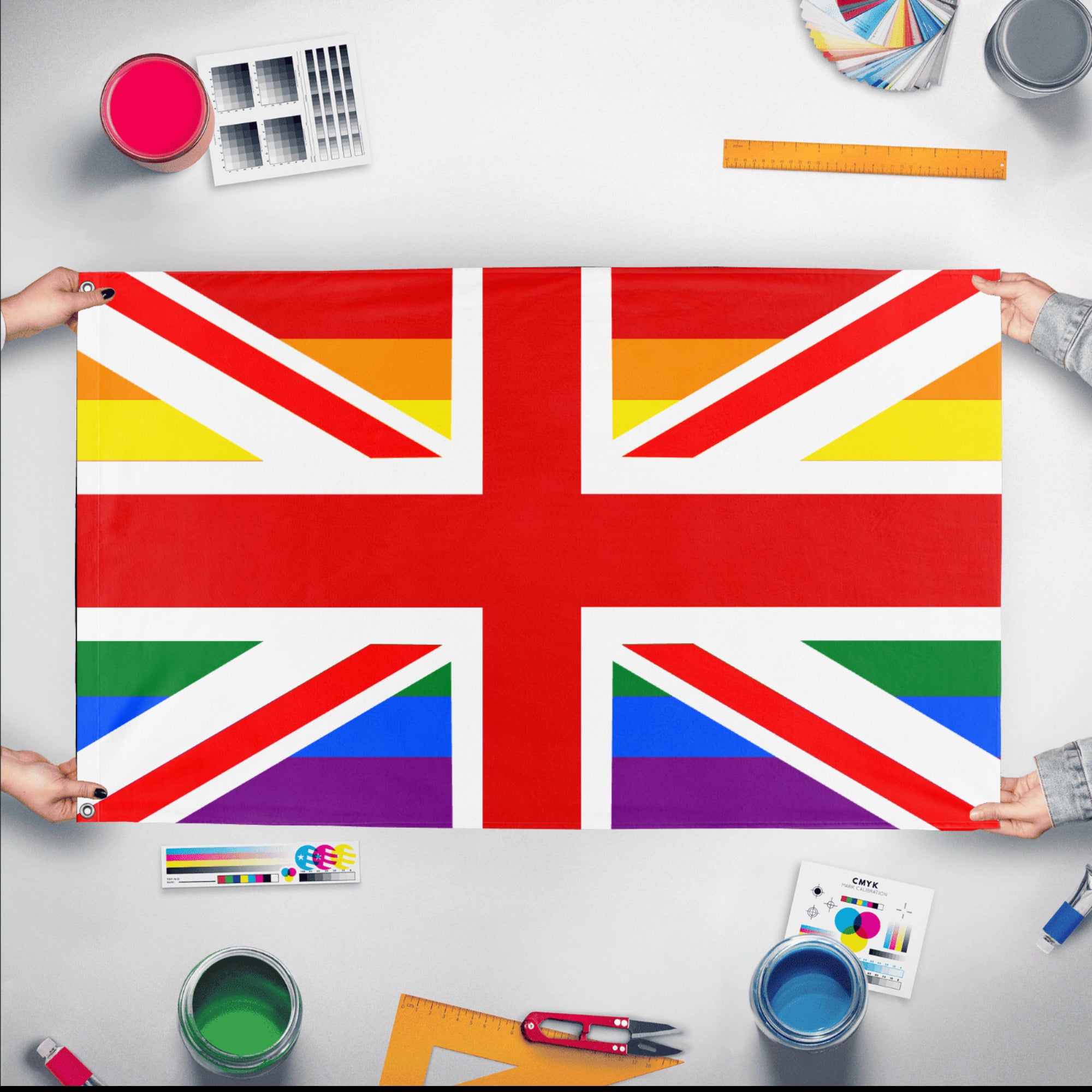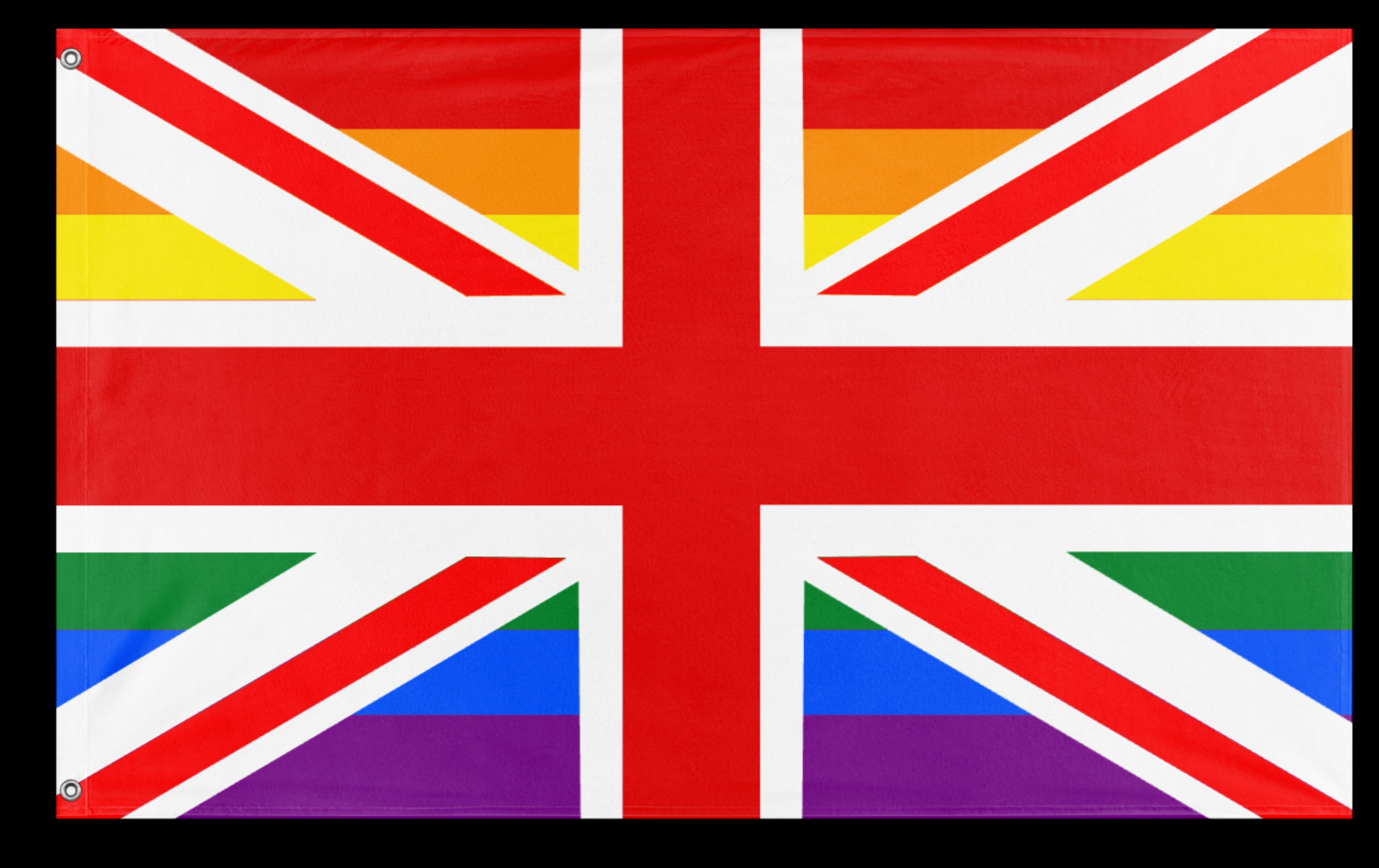 ✒️ The British Union Jack Pride Flag is a variation of the United Kingdom's national flag designed to incorporate elements of LGBTQ+ pride. Typically, it features the traditional Union Jack overlaid with the rainbow stripes of the Pride flag, symbolizing both national identity and support for LGBTQ+ rights. Variations may include the Progress Pride elements or different stylizations to reflect intersectionality and inclusivity within the LGBTQ+ community. The flag is commonly used at Pride events across the UK to express solidarity, national pride, and the ongoing pursuit of equality for LGBTQ+ individuals.