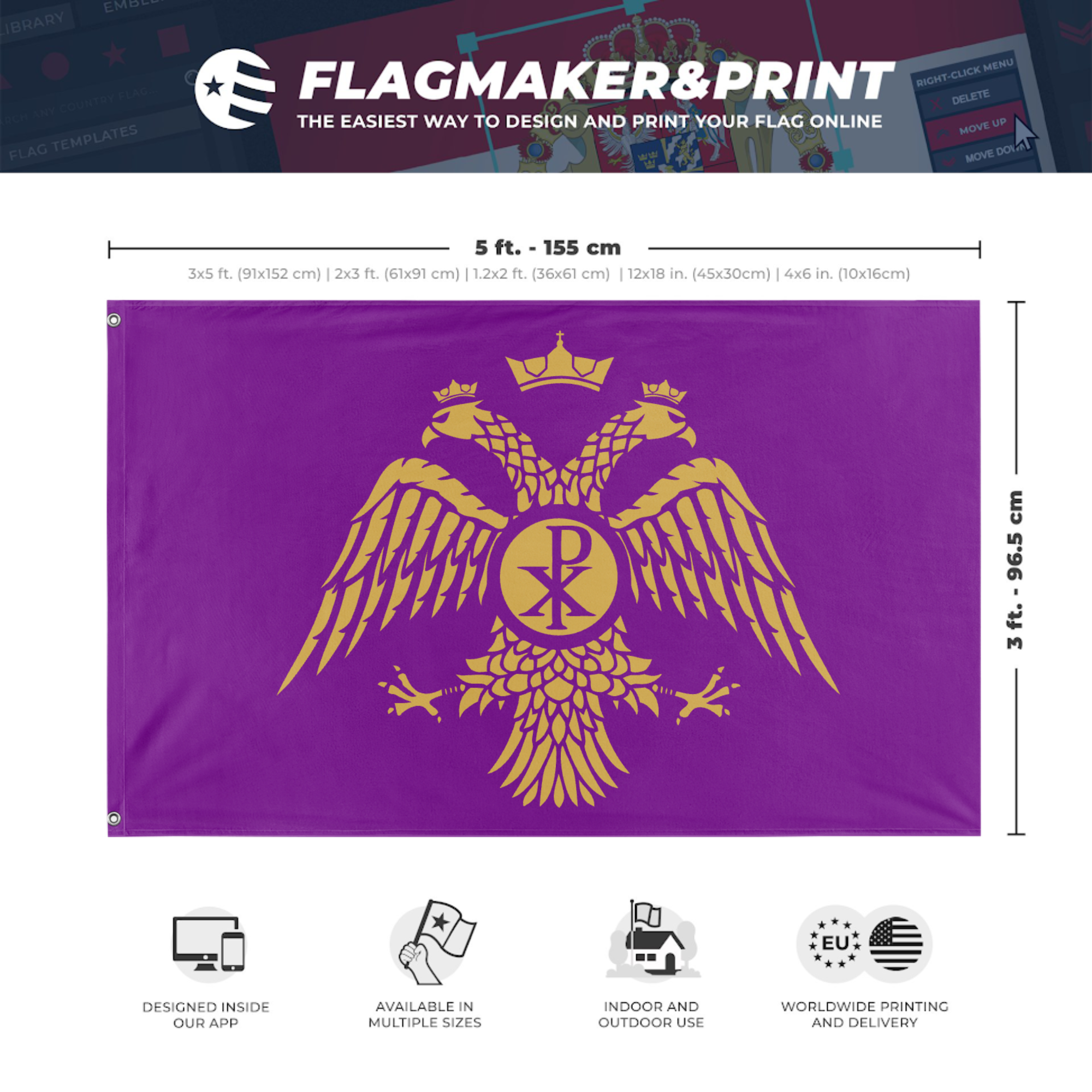 The Byzantine Empire flag depicted here features a gold double-headed eagle displayed on a purple field, a color long associated with imperial authority in the Eastern Roman (Byzantine) Empire. At the center of the eagle is a roundel bearing the Chi-Rho symbol, one of the earliest Christograms, representing Jesus Christ. Above the eagle are three crowns, symbolizing imperial sovereignty and the union of secular and divine authority. The purple background, often referred to as Tyrian purple, was historically reserved for emperors and the imperial court, reinforcing the flag’s association with supreme power and legitimacy. The design aligns with the concept of a Pax Christi field, emphasizing Christian order and divine peace under imperial rule.