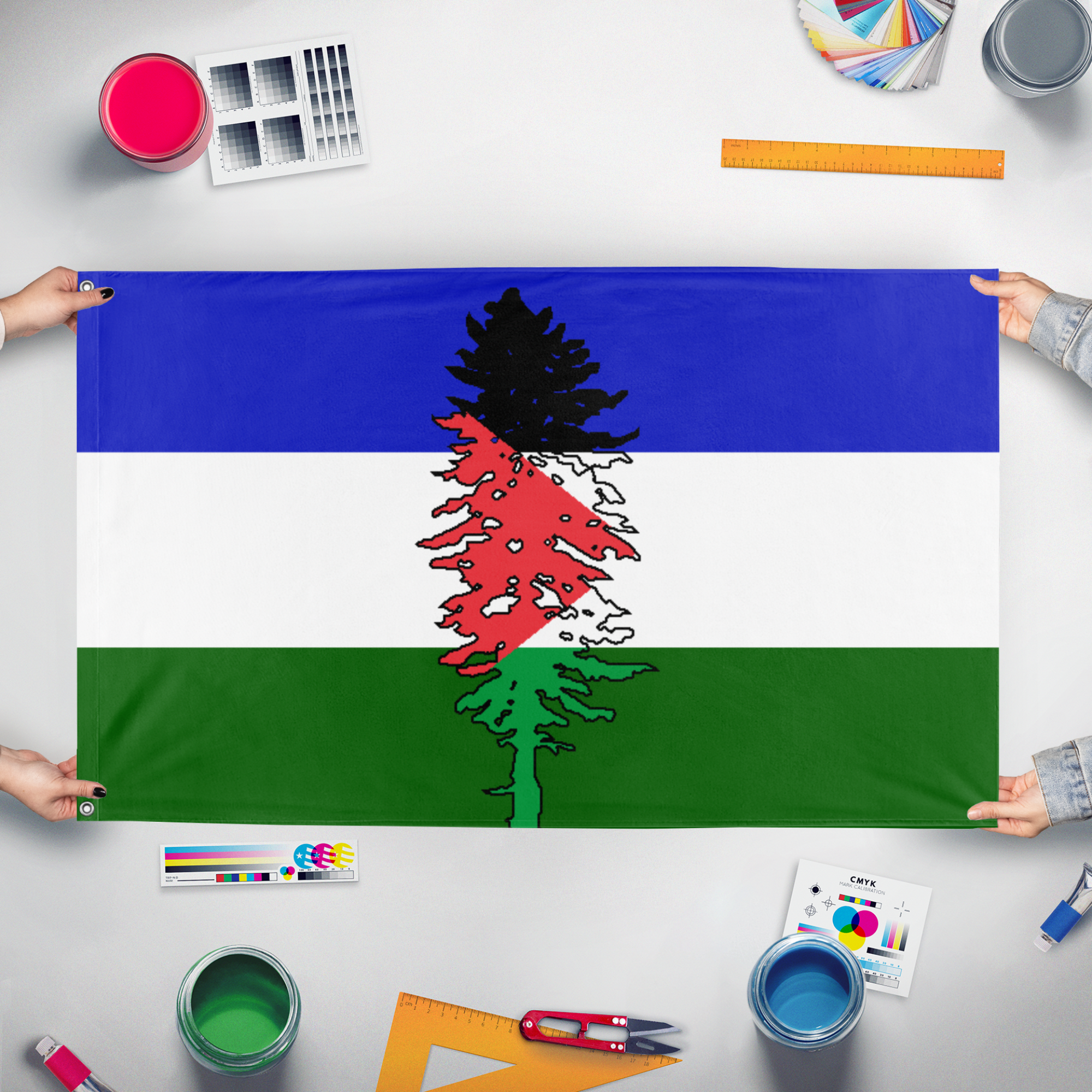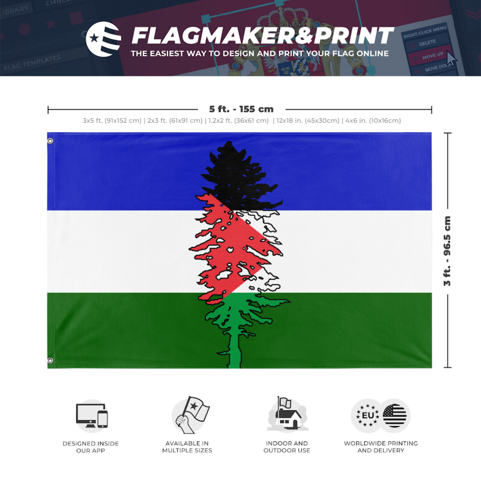 Our integrated flag maker app allows anyone to design and print their own flag. After finishing your design, you can print your flag in three easy steps.