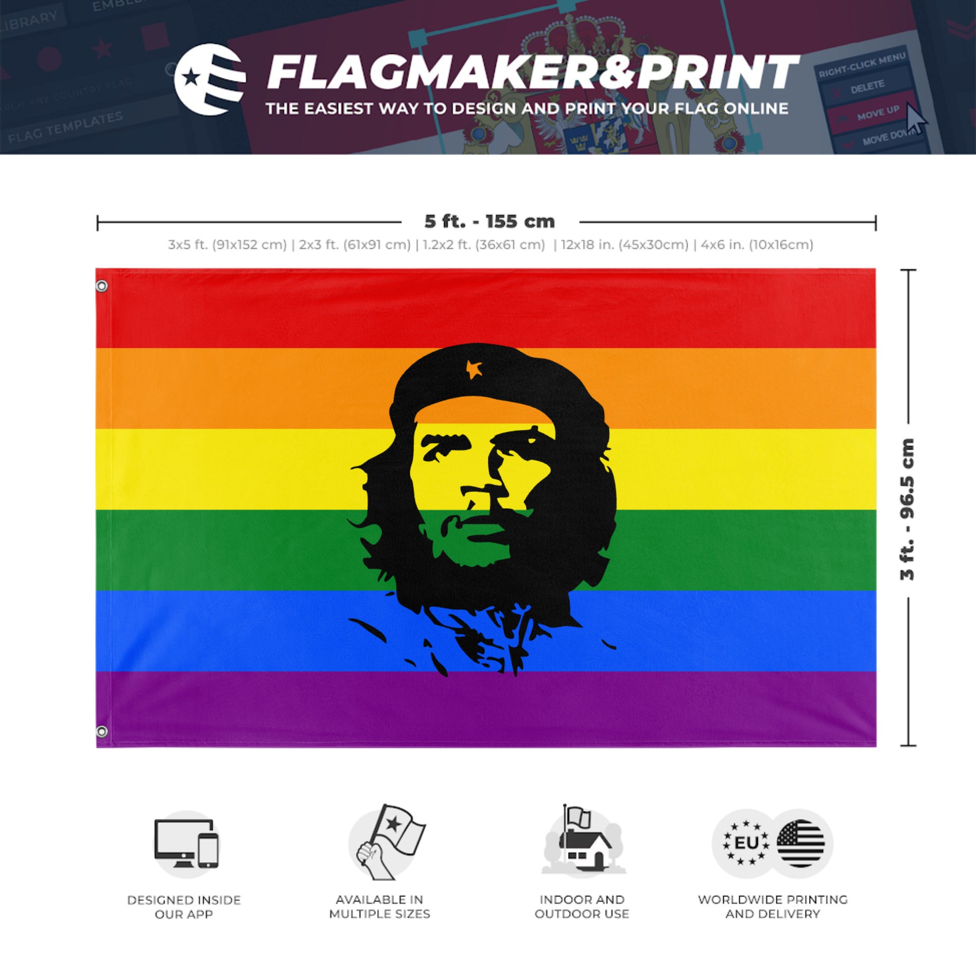 ✒️ The Che Guevara Pride Flag is a contemporary, symbolic fusion of revolutionary and LGBTQ+ iconography, combining the iconic image of Che Guevara with the colors and themes associated with the Pride movement. While not an officially recognized flag within either political or LGBTQ+ communities, it is often used in digital spaces and protest art to express solidarity between leftist revolutionary ideals and queer liberation. The flag seeks to represent the intersection of anti-capitalist, anti-imperialist resistance with gender and sexual diversity, emphasizing a vision of inclusive social justice. Its usage remains largely informal and is interpreted variably across activist and artistic contexts.