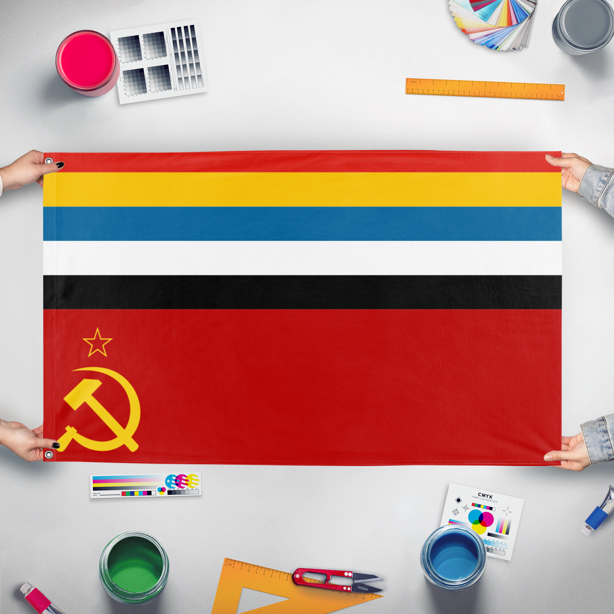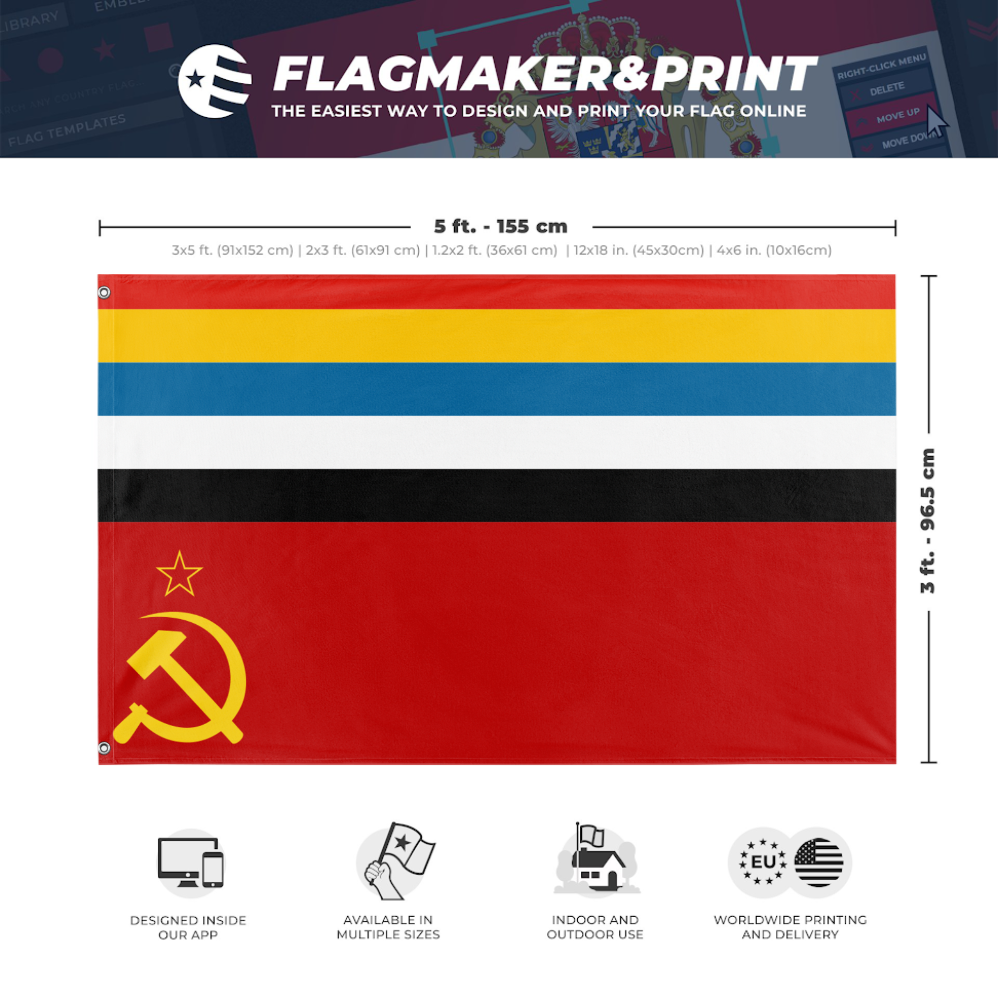 Our integrated flag maker app allows anyone to design and print their own flag. After finishing your design, you can print your flag in three easy steps.