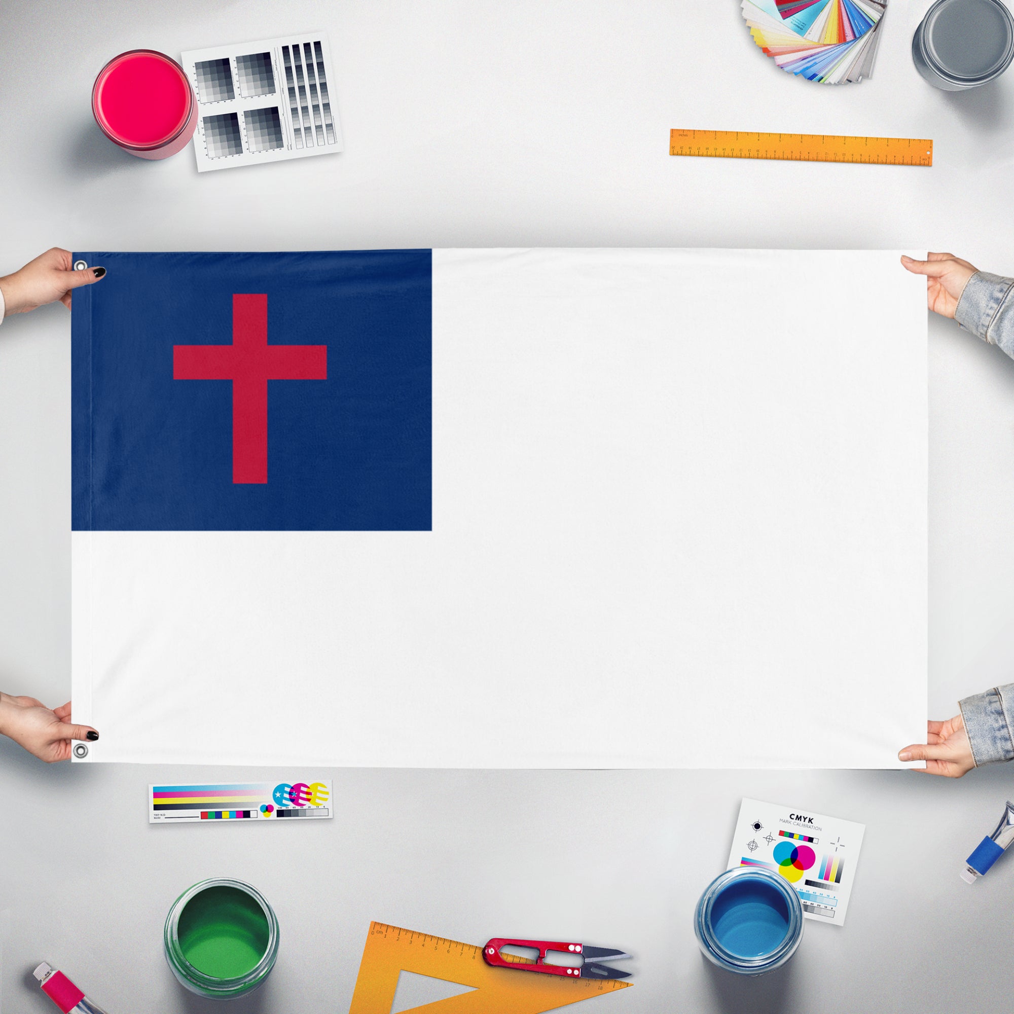 ✒️ The Christian Flag is an ecumenical flag designed in the early 20th century to represent all of Christianity and Christendom. Its design consists of a white field, symbolizing the purity, peace, and innocence of Jesus, with a blue canton in the upper hoist corner. The blue canton represents the waters of baptism, the faithfulness of Christ, and heaven. Within the canton is a red Latin cross, a prominent symbol of Christianity, which signifies the blood of Christ shed for the redemption of humanity and his sacrificial love. The flag is intentionally designed without patents or copyrights, making it free for use by any individual, church, or organization. The history of the Christian Flag began on September 26, 1897, at Brighton Chapel on Coney Island in Brooklyn, New York. Charles C. Overton, a Sunday school superintendent, was forced to give an impromptu speech when a guest speaker failed to arrive. Using a nearby American flag as a visual aid, he discussed the symbolism of flags and proposed that Christians should have their own banner. Overton, along with missionary leader Ralph Diffendorfer, later promoted the design, which gradually gained acceptance. The U.S. Federal Council of Churches officially adopted the flag on January 23, 1942. Today, it is used worldwide by many Protestant, Evangelical, and some Catholic and Orthodox denominations as a symbol of Christian unity and allegiance to Christ.