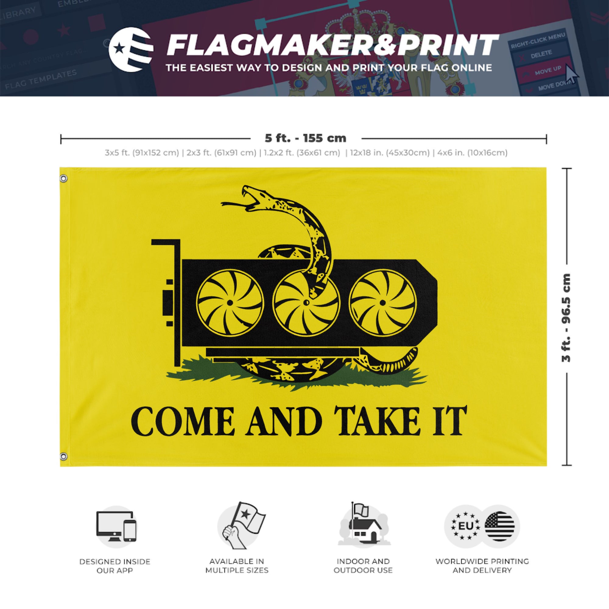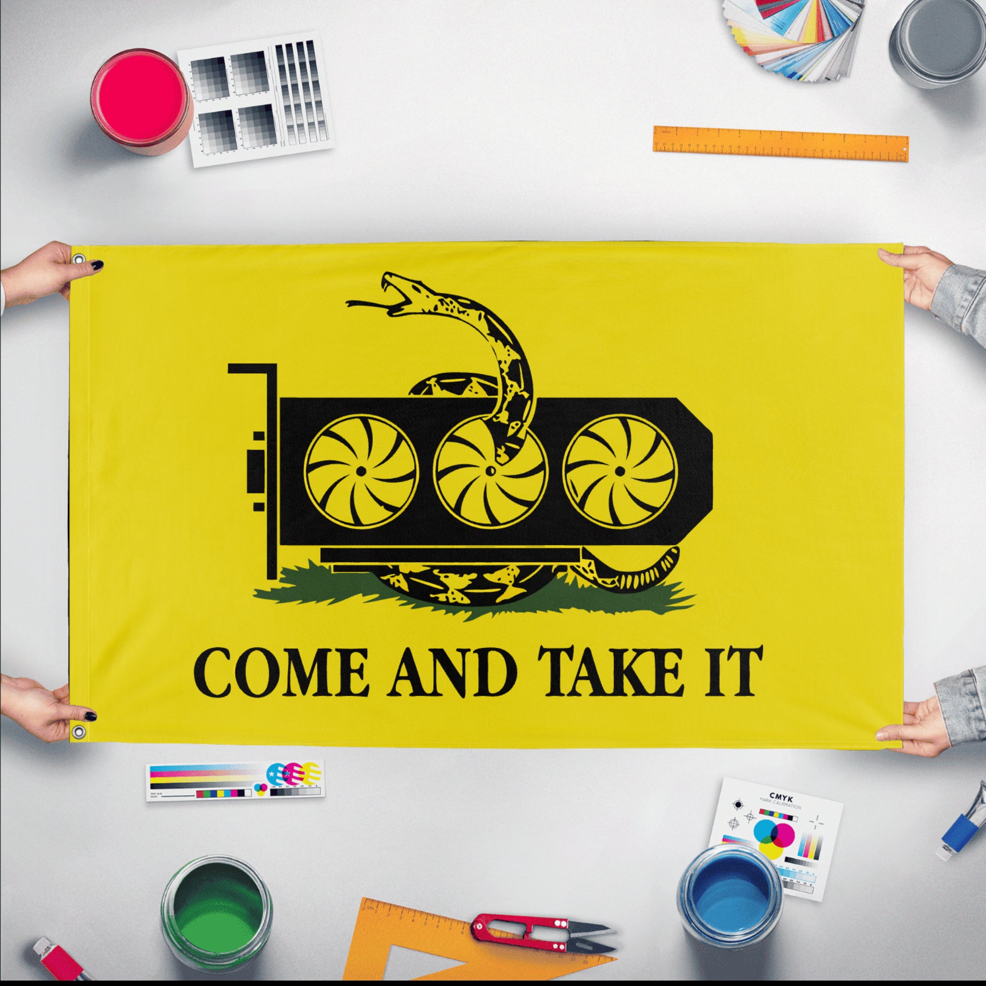 ✒️ The Come and Take It GPU Gadsden Flag combines the iconic imagery of the historic Gadsden Flag with a modern technological twist. Featuring the classic coiled rattlesnake and the phrase “Don’t Tread on Me,” the flag replaces the traditional cannon with a stylized graphics processing unit (GPU) to symbolize the defense of personal computing hardware. This adaptation reflects themes of digital freedom, resistance to hardware restrictions, and the protection of individual rights within the tech and cryptocurrency communities. It has become a popular emblem among gamers, miners, and technology advocates who value autonomy and open access to technology.