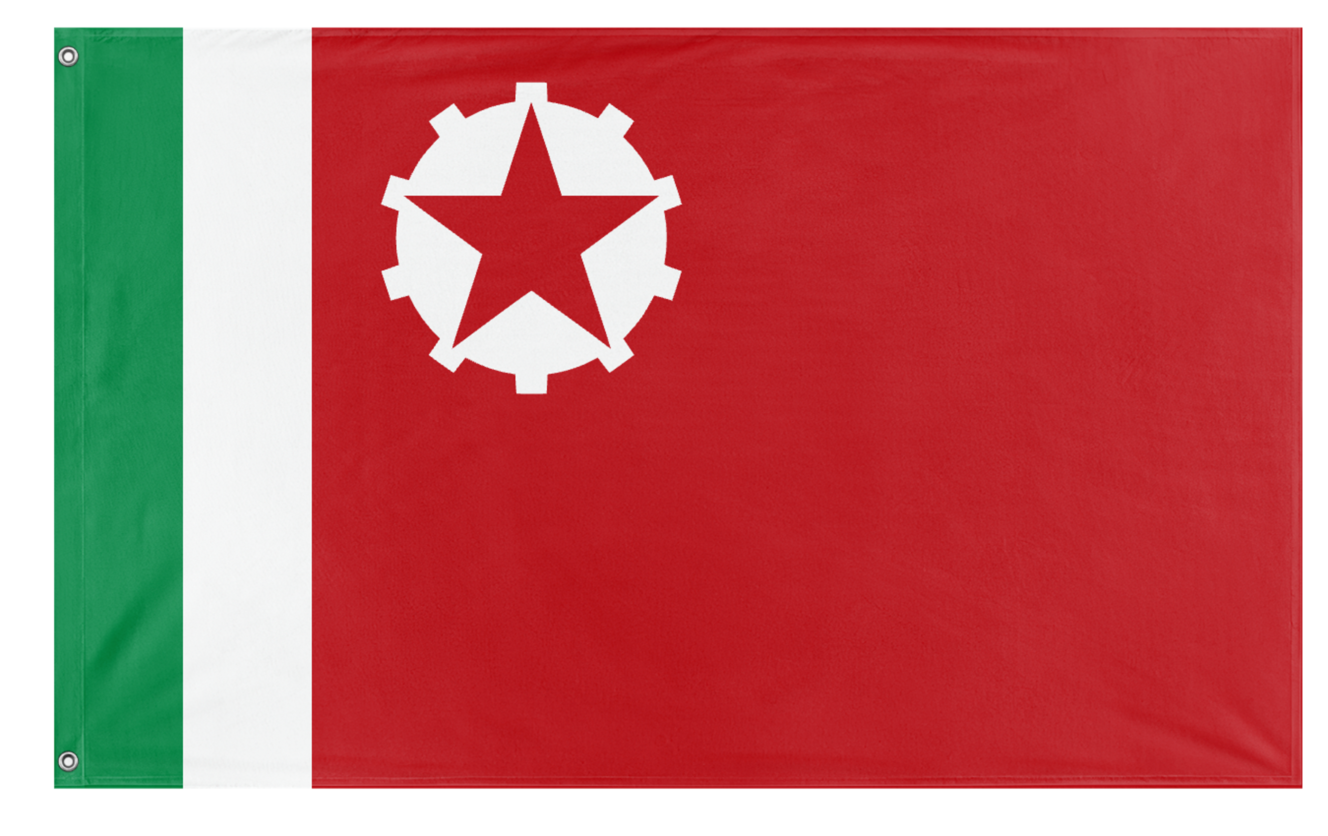 The Communist Flag of Italy, authored by Silver-Base224, is a distinctive vexillological design rooted in alternative history narratives. The flag features a prominent red field, which occupies the majority of the fly, symbolizing revolutionary struggle and socialist ideology. At the hoist, the design retains a vertical bicolor of green and white, serving as a compressed canton that nods to the traditional Italian Tricolore. Within the upper portion of the red field, a white industrial gear or cogwheel encircles a solid red five-pointed star, a combination that represents the unified strength of the industrial proletariat and the guiding principles of international communism.