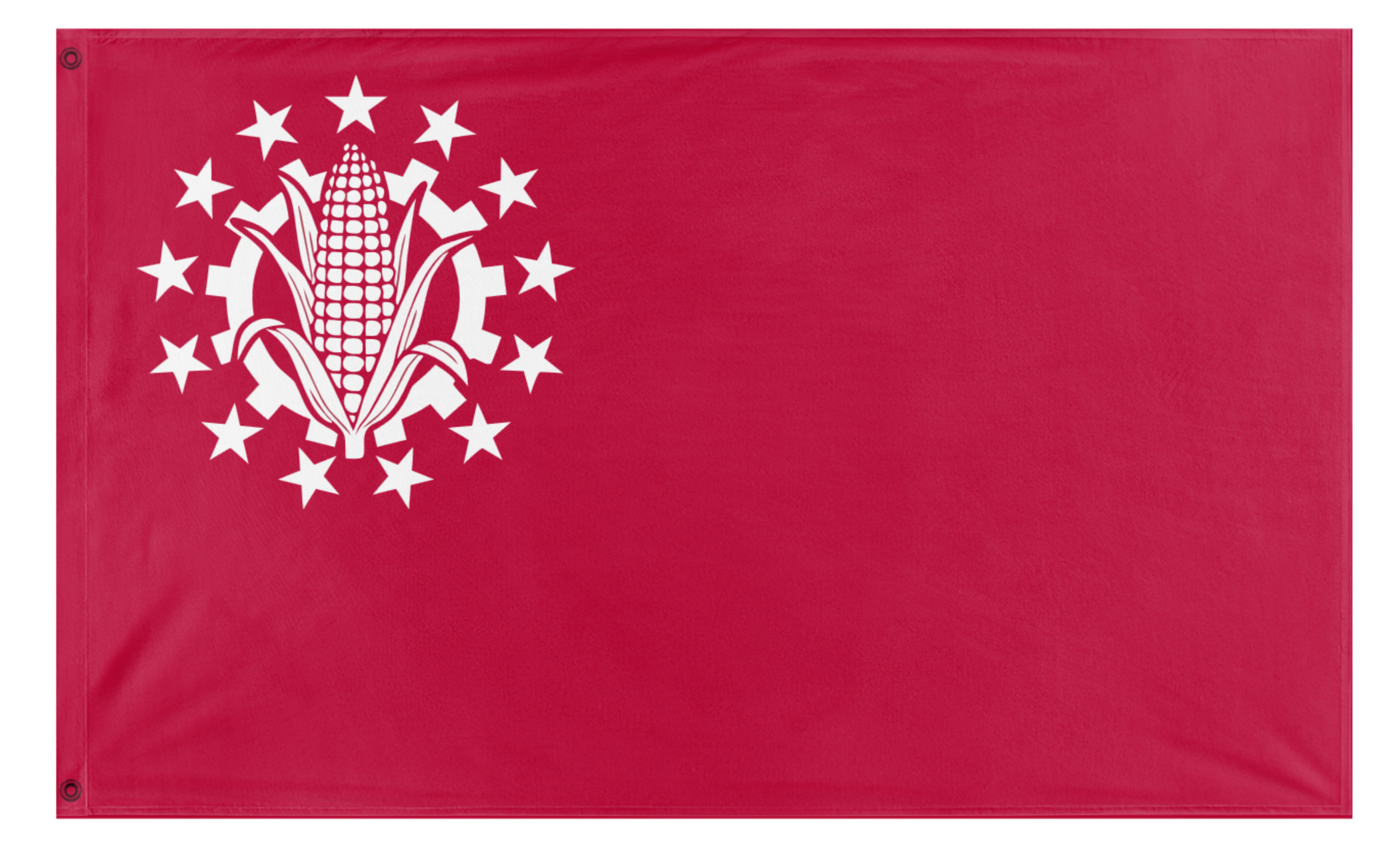 This design originated as part of a collaborative creative exercise on the r/vexillology subreddit by the user Silver-Base, reimagining national flags under communist symbolism. The concept was subsequently selected and purchased for broader use, intended to represent a fictional “Communist United States” where agrarian and industrial labor form the core of political identity. Its visual language draws on historical revolutionary motifs adapted to a hypothetical political alternate history, and it has been discussed in online vexillology communities for its heraldic balance and symbolic cohesion.