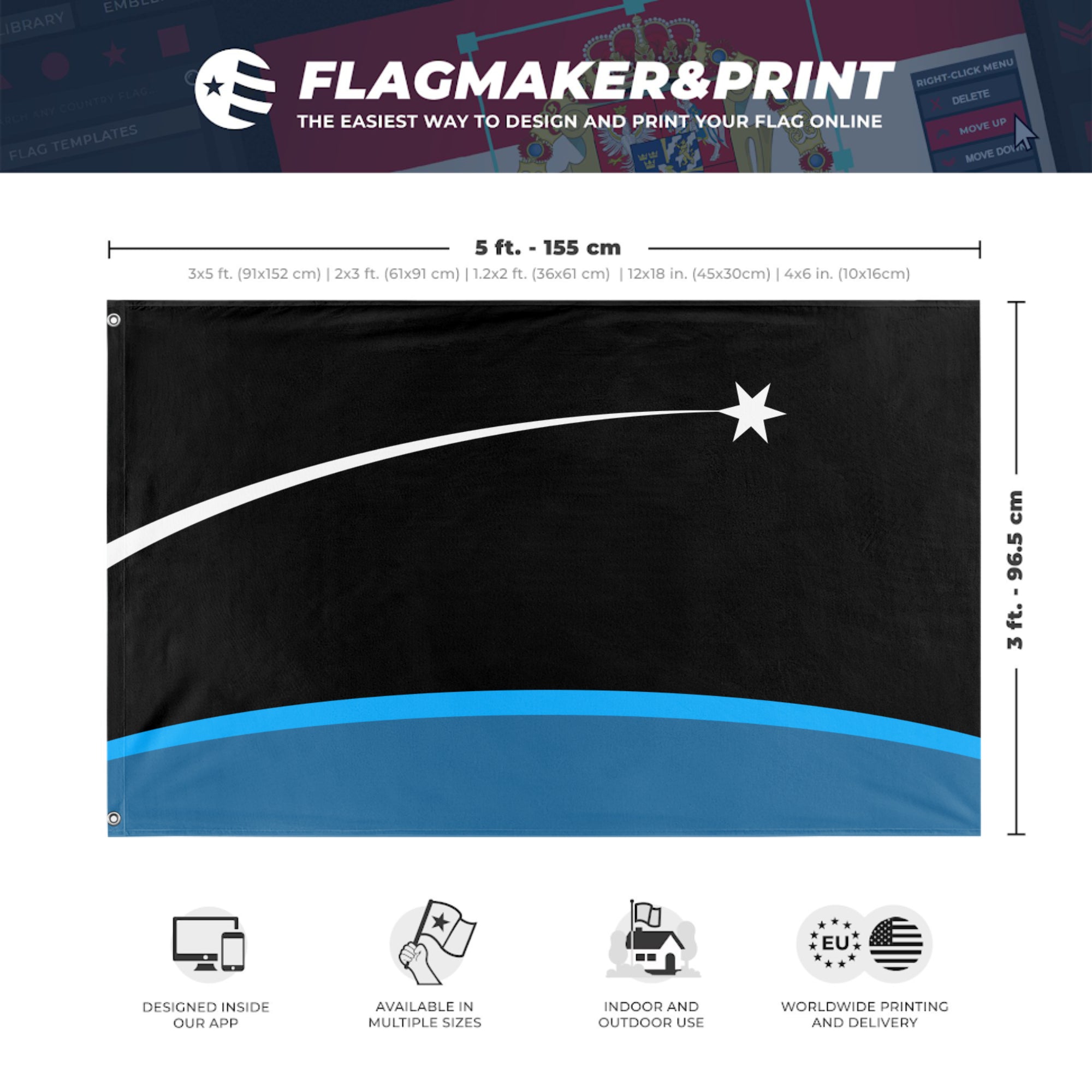 Our integrated flag maker app allows anyone to design and print their own flag. After finishing your design, you can print your flag in three easy steps.