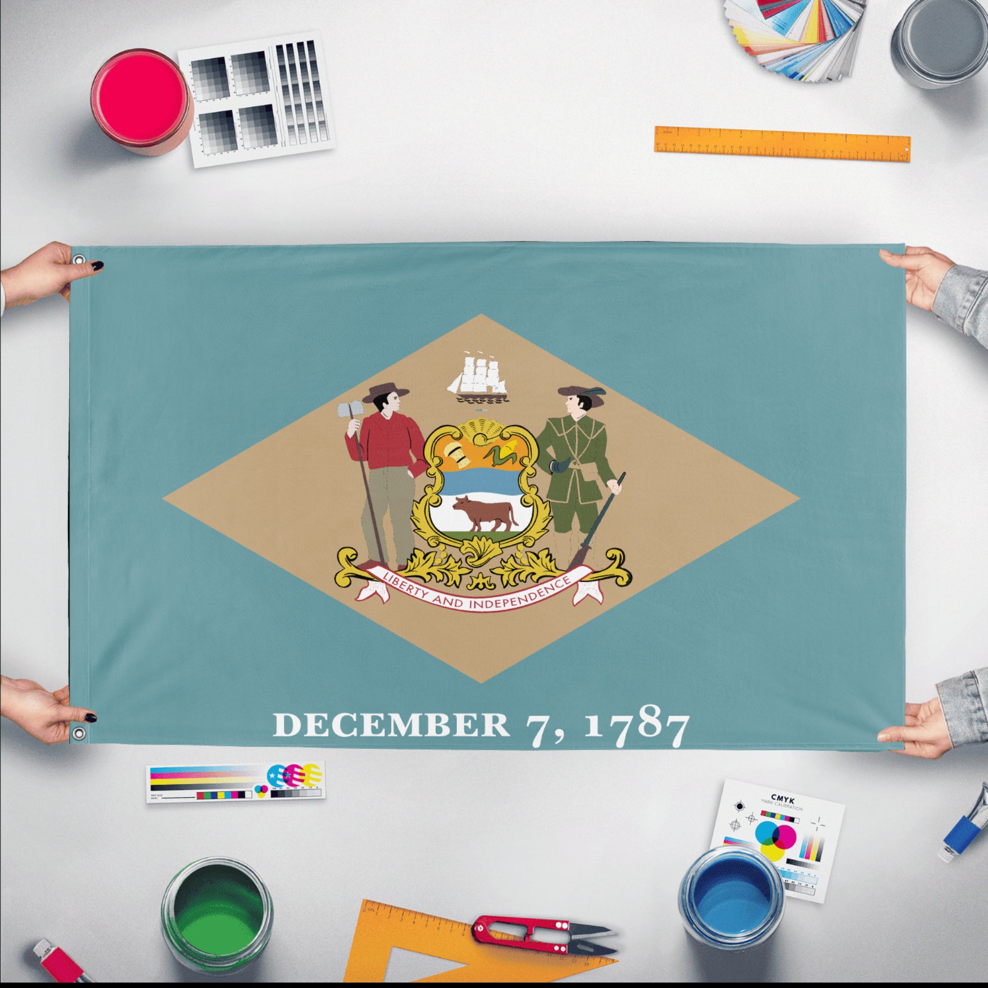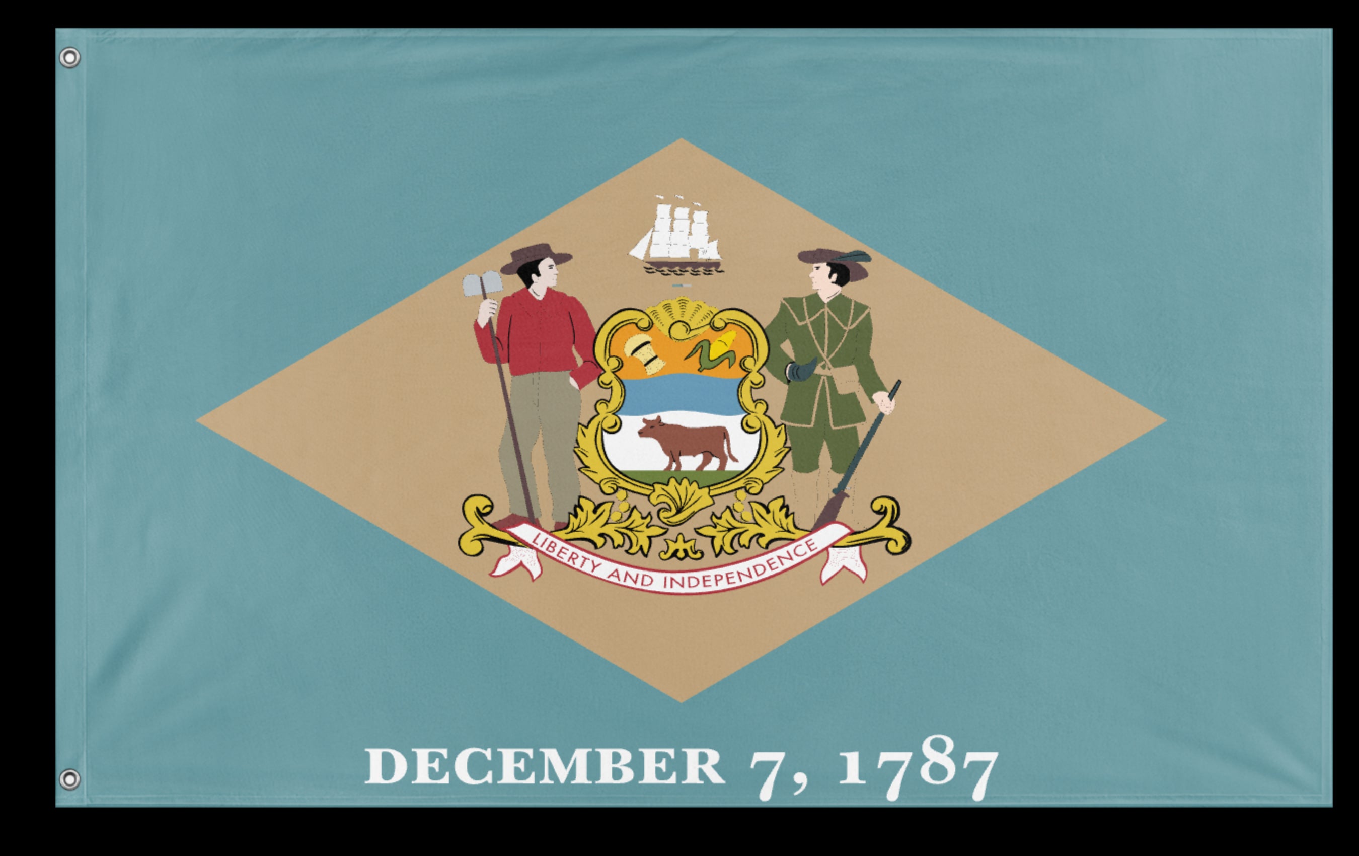 ✒️ The state flag of Delaware features a buff-colored diamond on a colonial blue field, with the state's coat of arms displayed in the center of the diamond. Beneath the diamond is the date "December 7, 1787," marking the day Delaware became the first state to ratify the U.S. Constitution. The coat of arms includes a soldier and a farmer flanking a shield, which contains images of wheat, corn, and an ox representing agriculture, and a ship symbolizing commerce. Above the shield is a sailing ship, and below it is the state motto: "Liberty and Independence." Adopted in 1913, the flag’s colors and design reflect Delaware’s colonial heritage and its pivotal role in the founding of the United States.