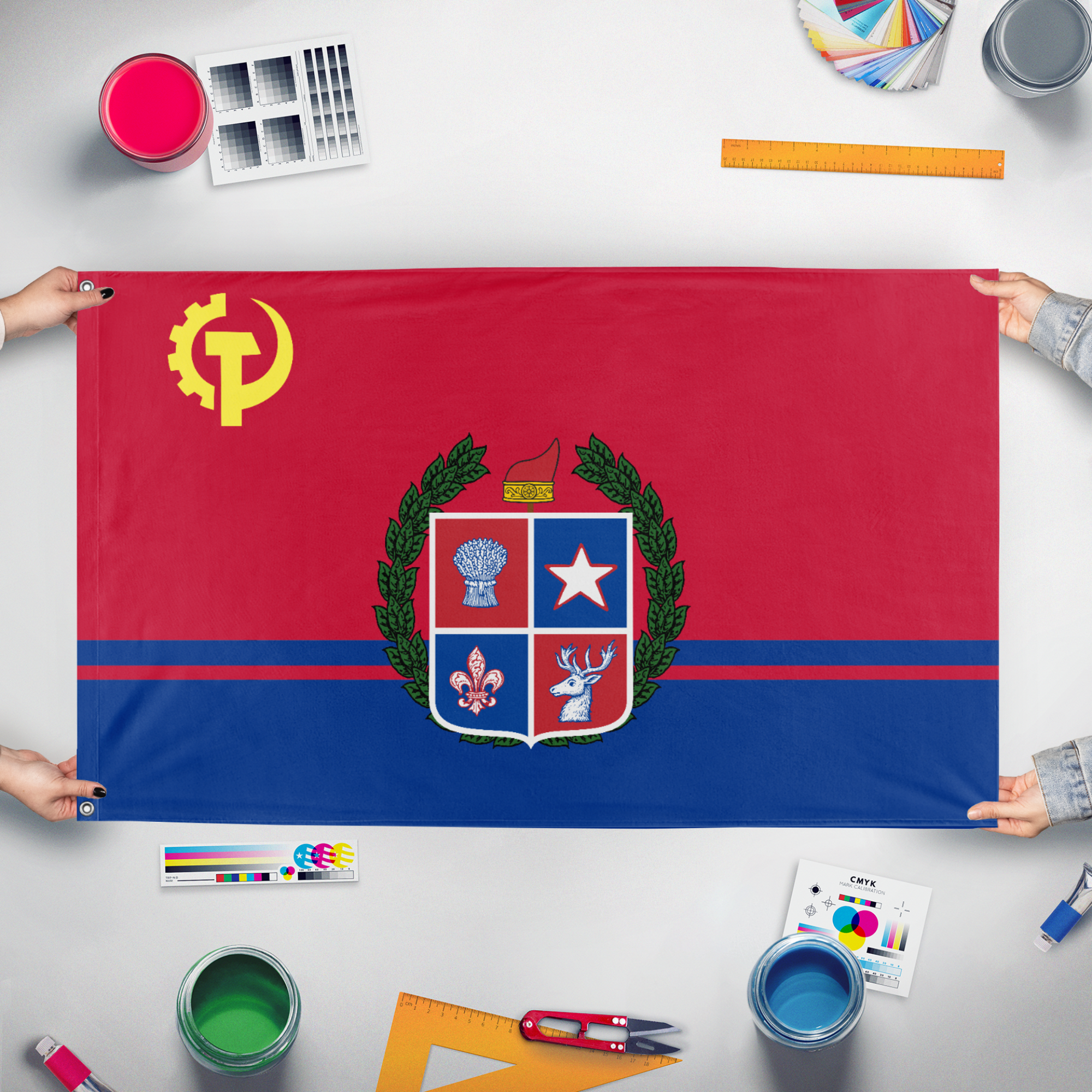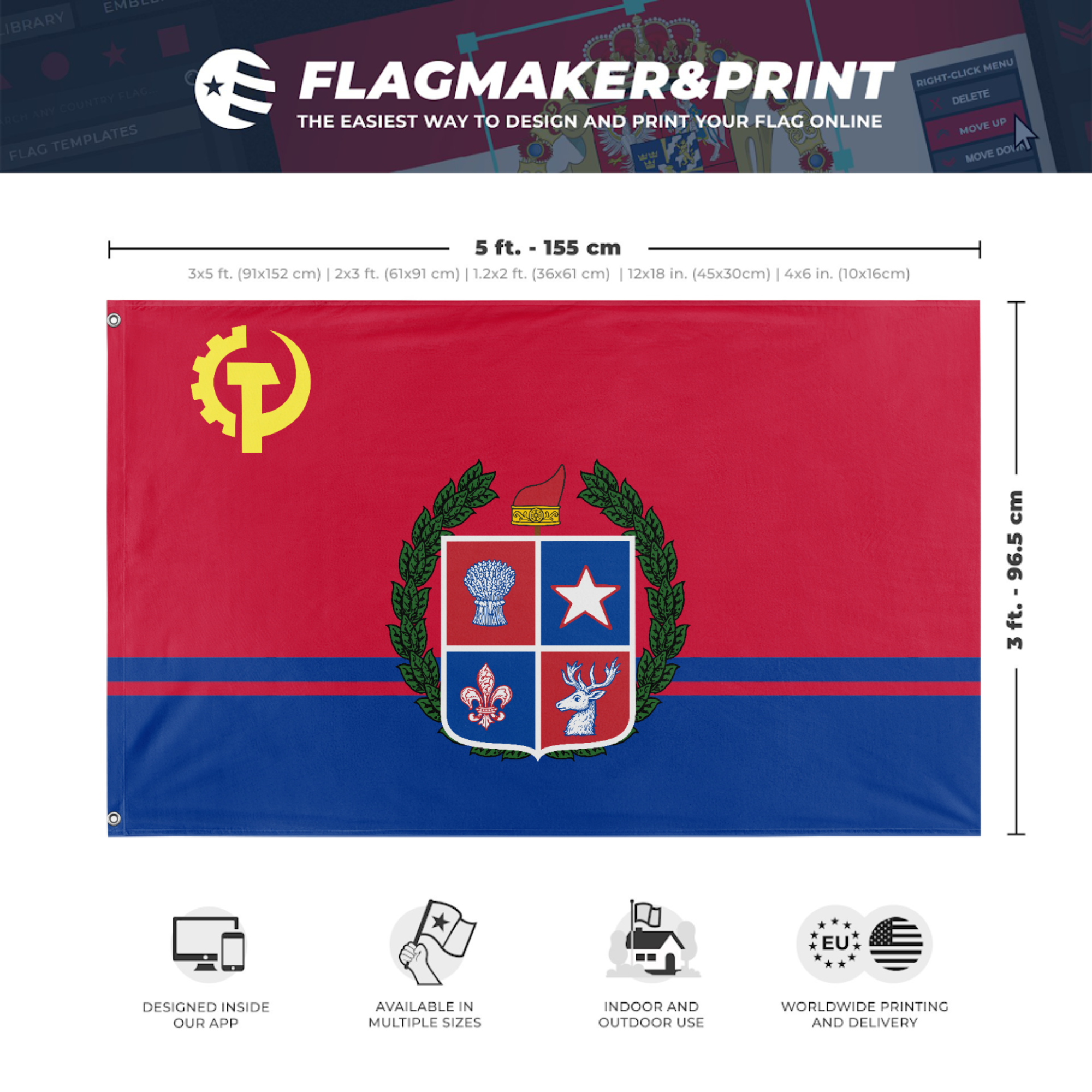 Our integrated flag maker app allows anyone to design and print their own flag. After finishing your design, you can print your flag in three easy steps.