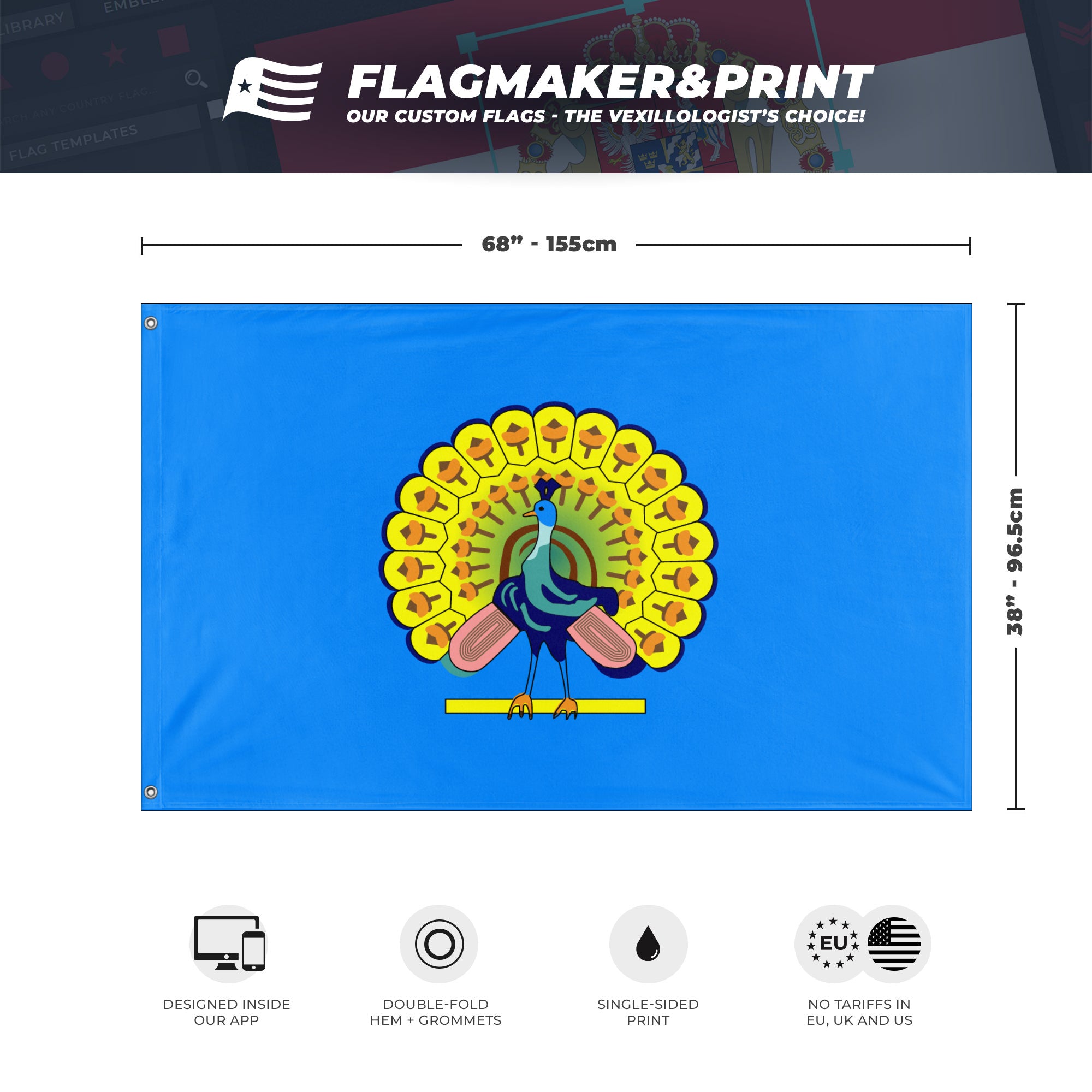 Our integrated flag maker app allows anyone to design and print their own flag. After finishing your design, you can print your flag in three easy steps.