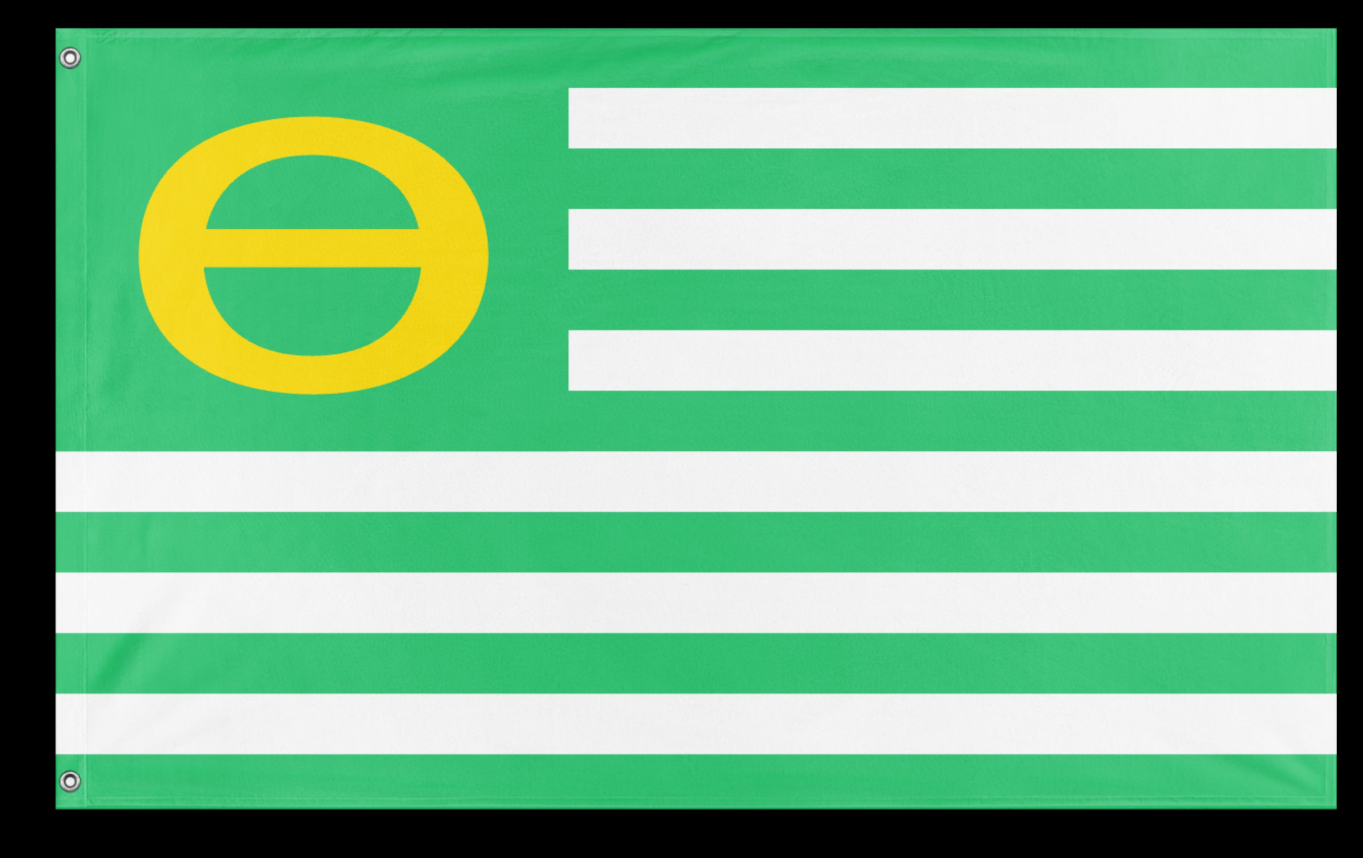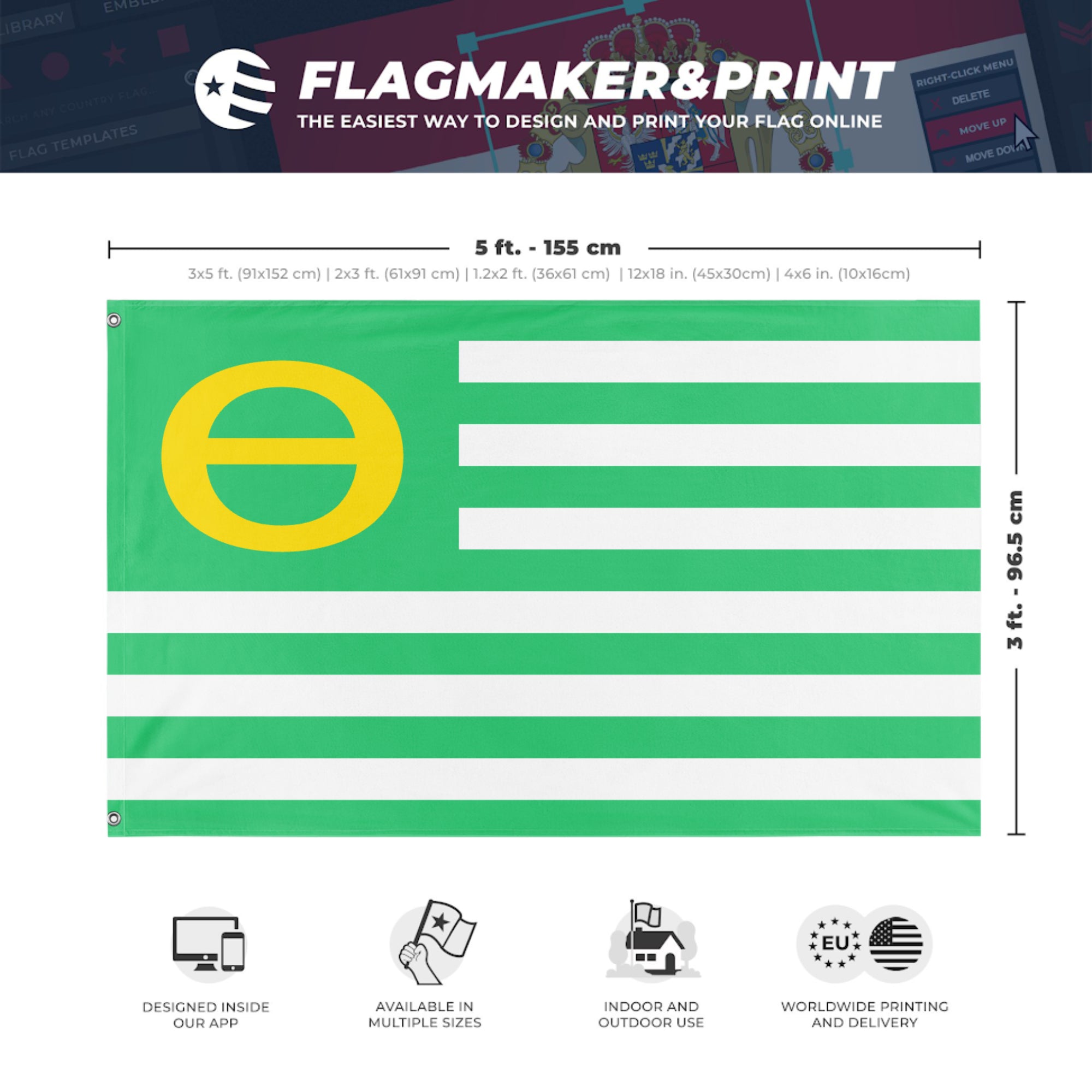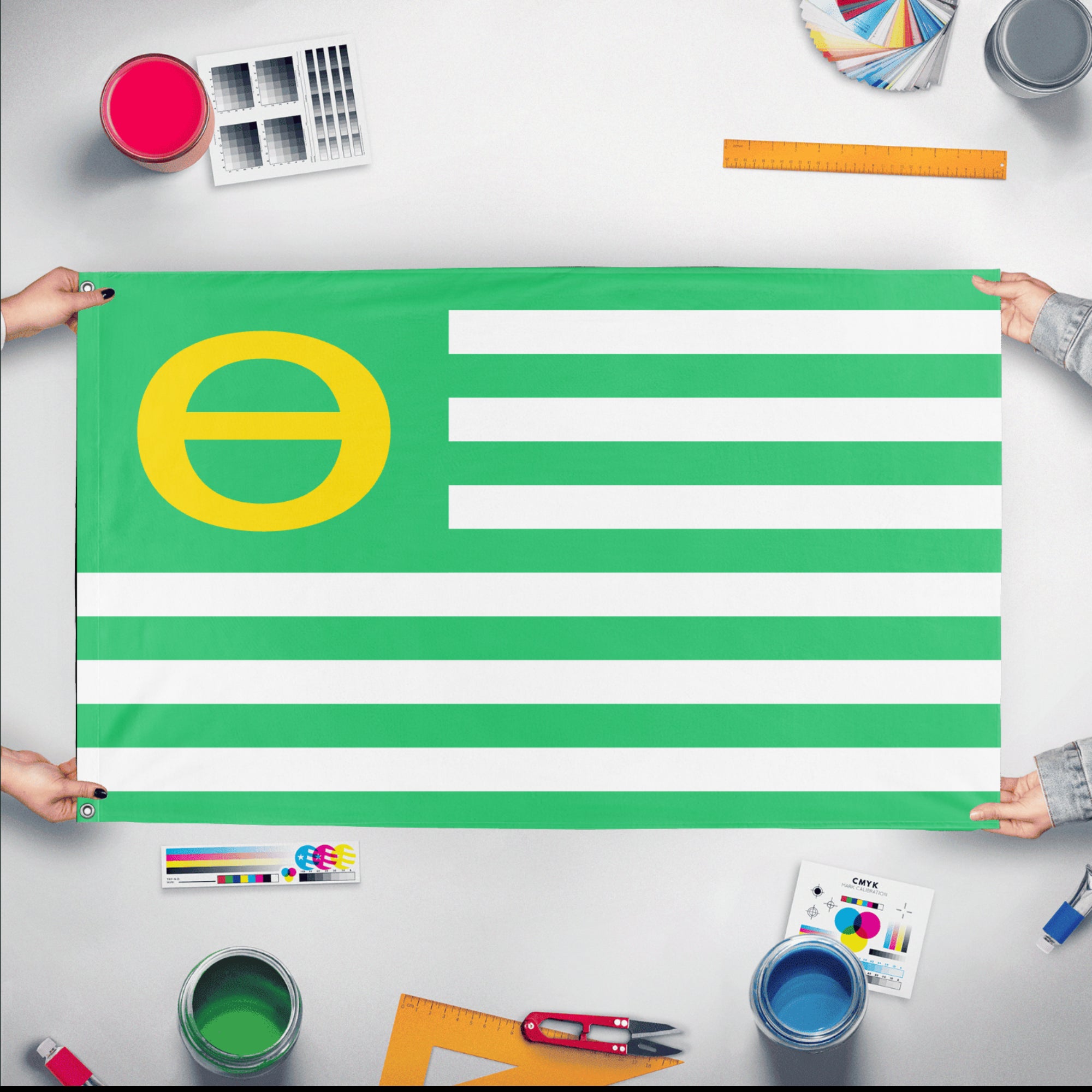 ✒️ The Ecology Flag is a symbol that gained prominence in the early 1970s, particularly among American environmentalists. Designed by Jack Shepherd and based on a symbol created by Ron Cobb, it typically features thirteen alternating green and white horizontal stripes, with a green canton in the upper hoist corner bearing a yellow or white Theta symbol (Θ). The green stripes and canton are said to represent unspoiled land and clean air, while the white stripes symbolize clean air. The Theta symbol, formed by superimposing the letters "E" (for environment) and "O" (for organism), is also associated with the Greek word thanatos (death), serving as a warning about threats to the environment. The flag's design deliberately mirrors that of the United States flag to emphasize the importance of ecological concerns within a national context, and it was notably used during the first Earth Day in 1970.