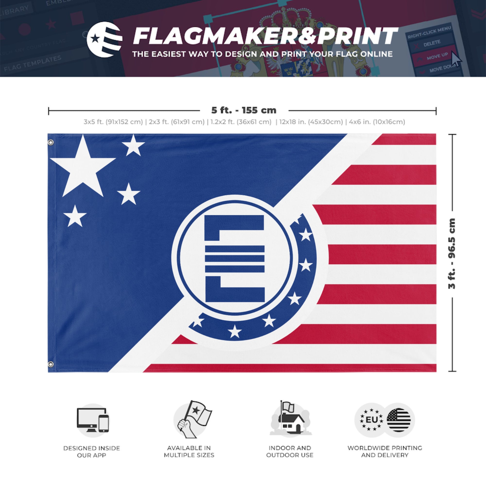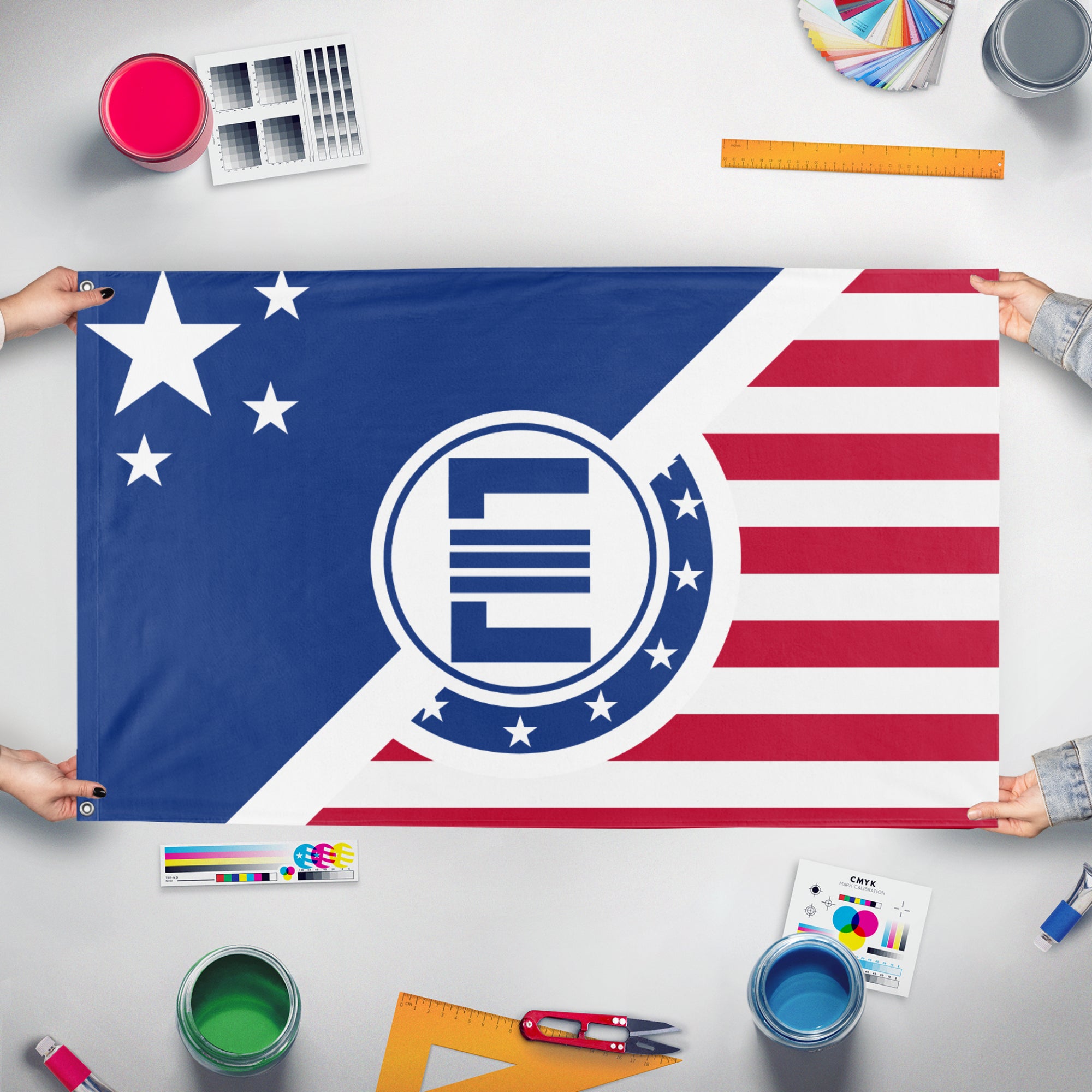 Our integrated flag maker app allows anyone to design and print their own flag. After finishing your design, you can print your flag in three easy steps.