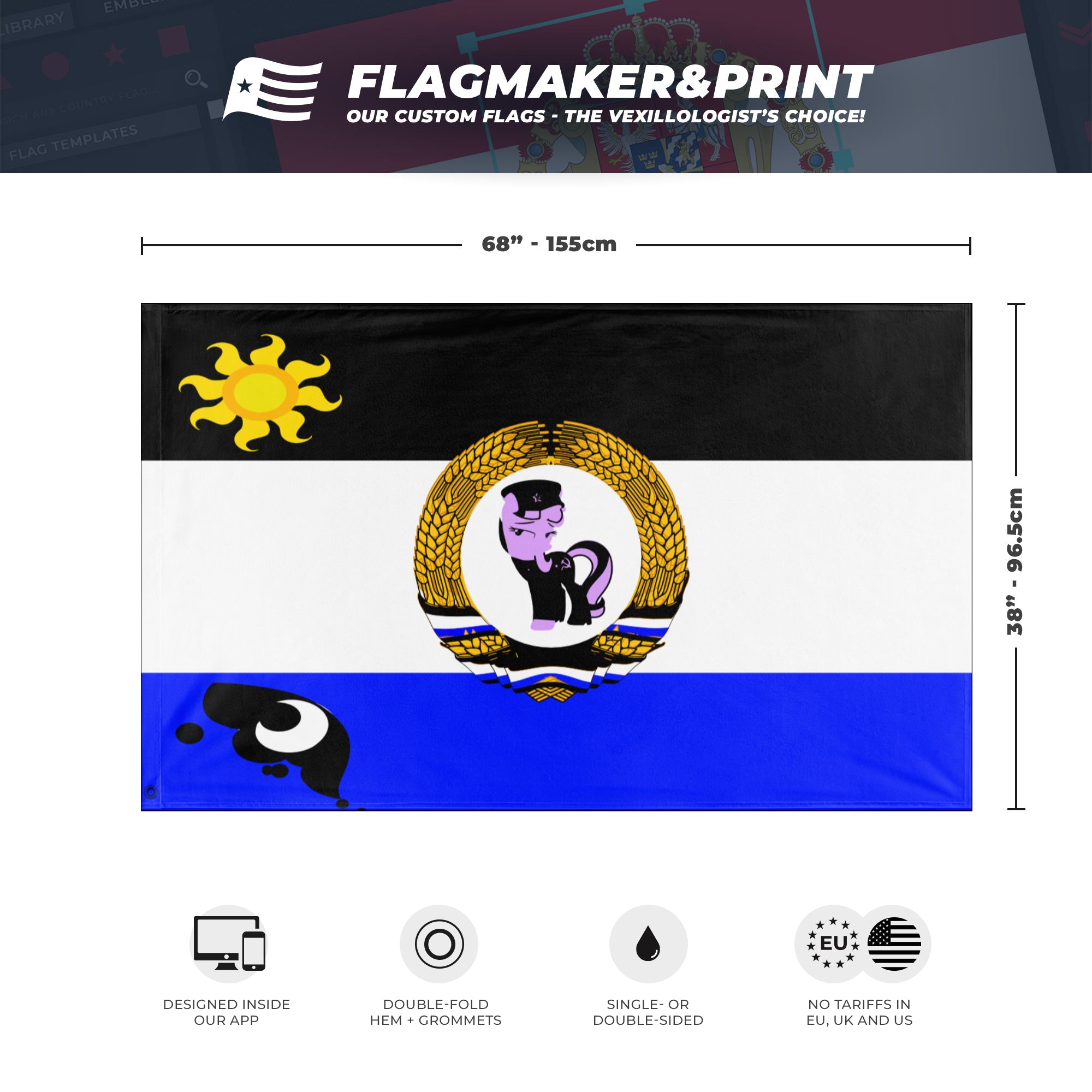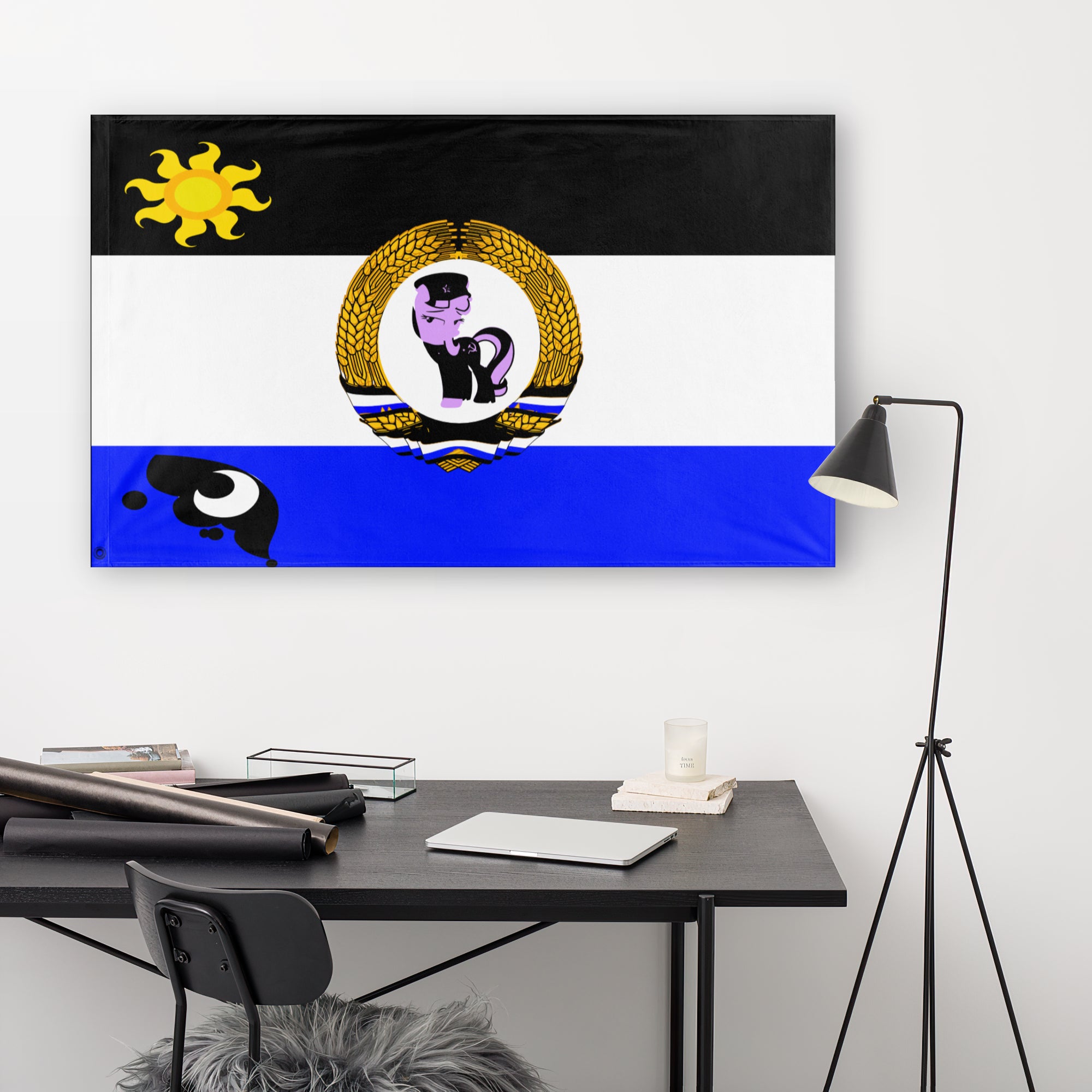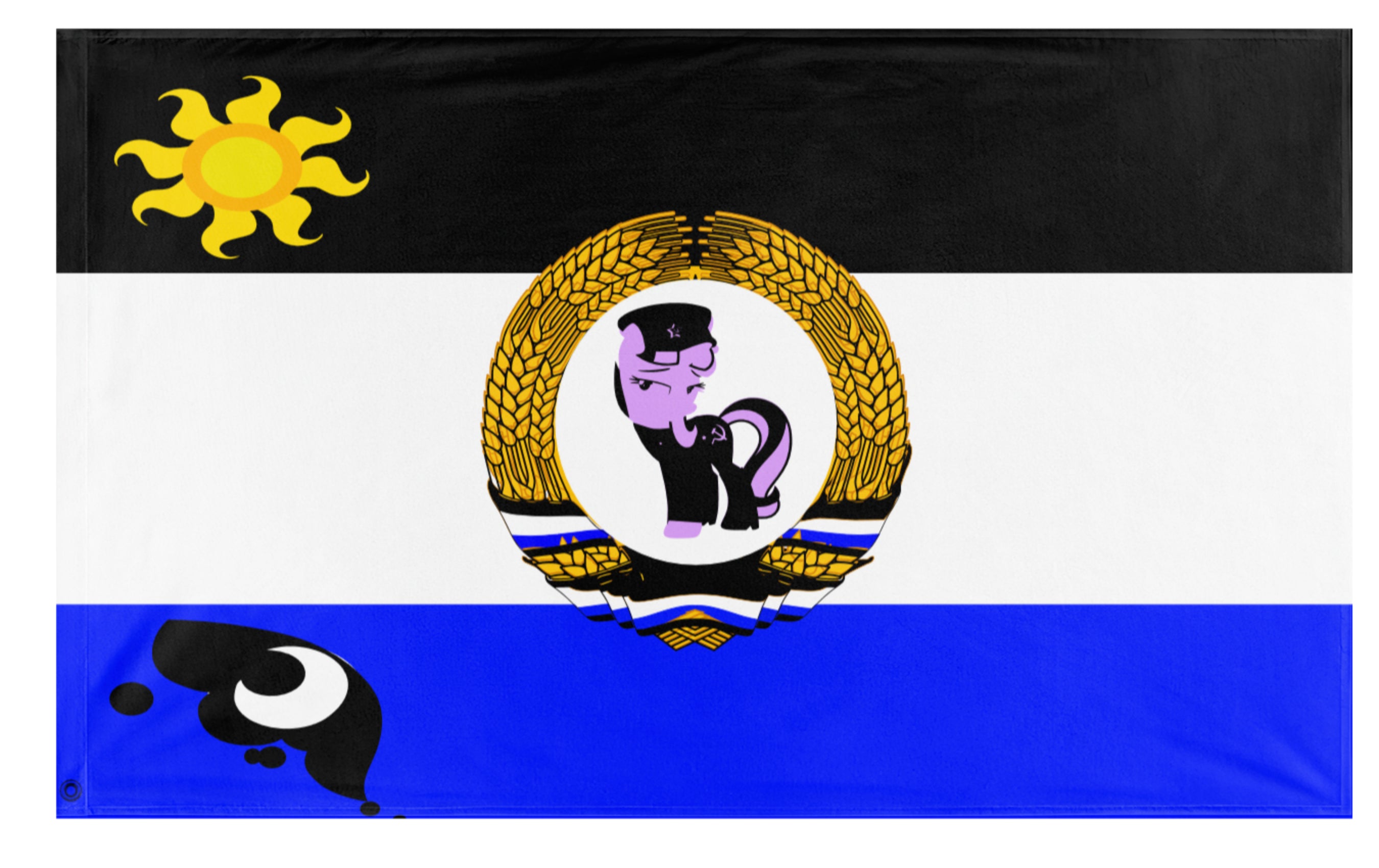 Black, White and Blue Equistrian Democratic Republic Flag, with Starlight Glimmer as the leader. Sun, Celestia`s `cutie mark`. Moon, Luna`s `Cutie Mark`.