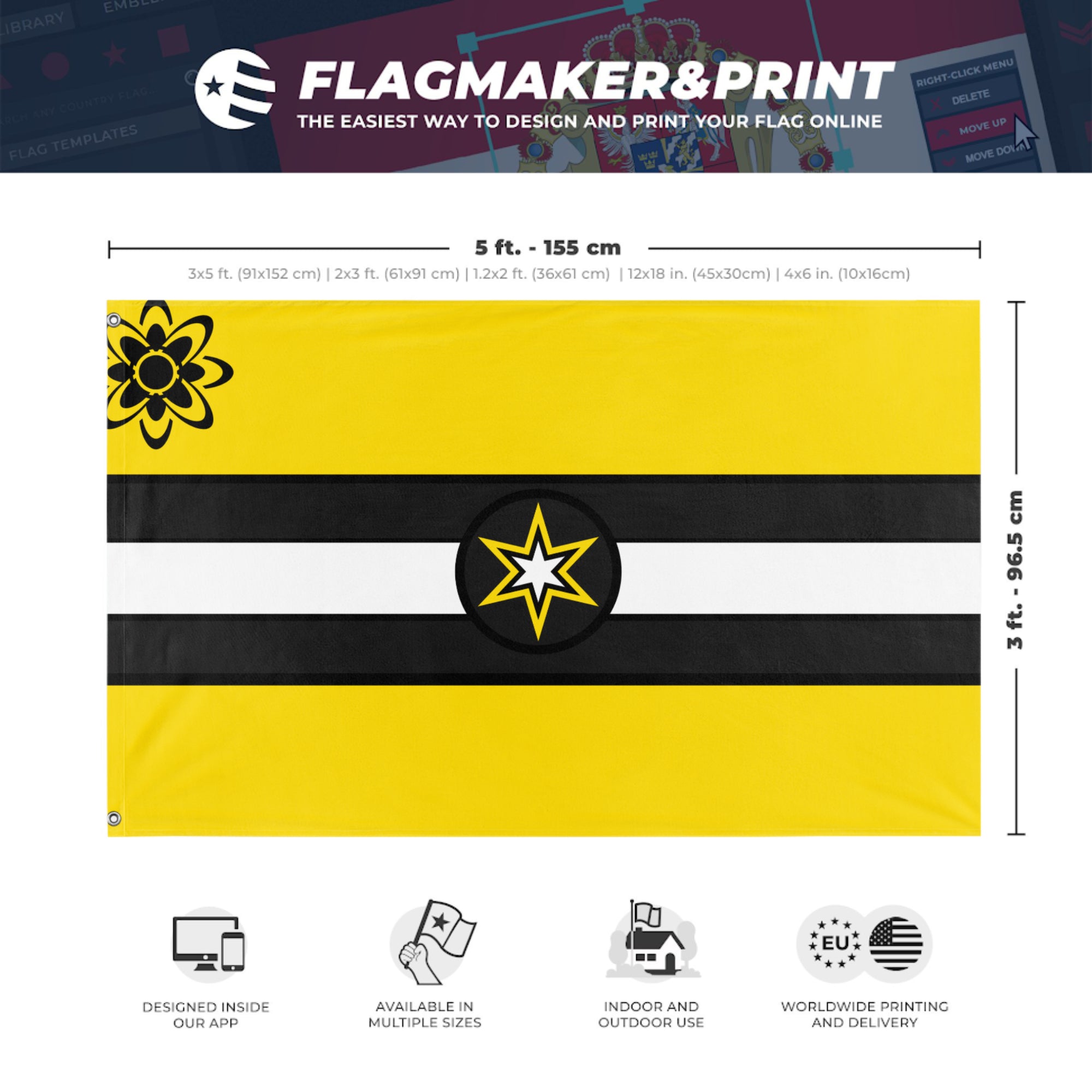 Our integrated flag maker app allows anyone to design and print their own flag. After finishing your design, you can print your flag in three easy steps.