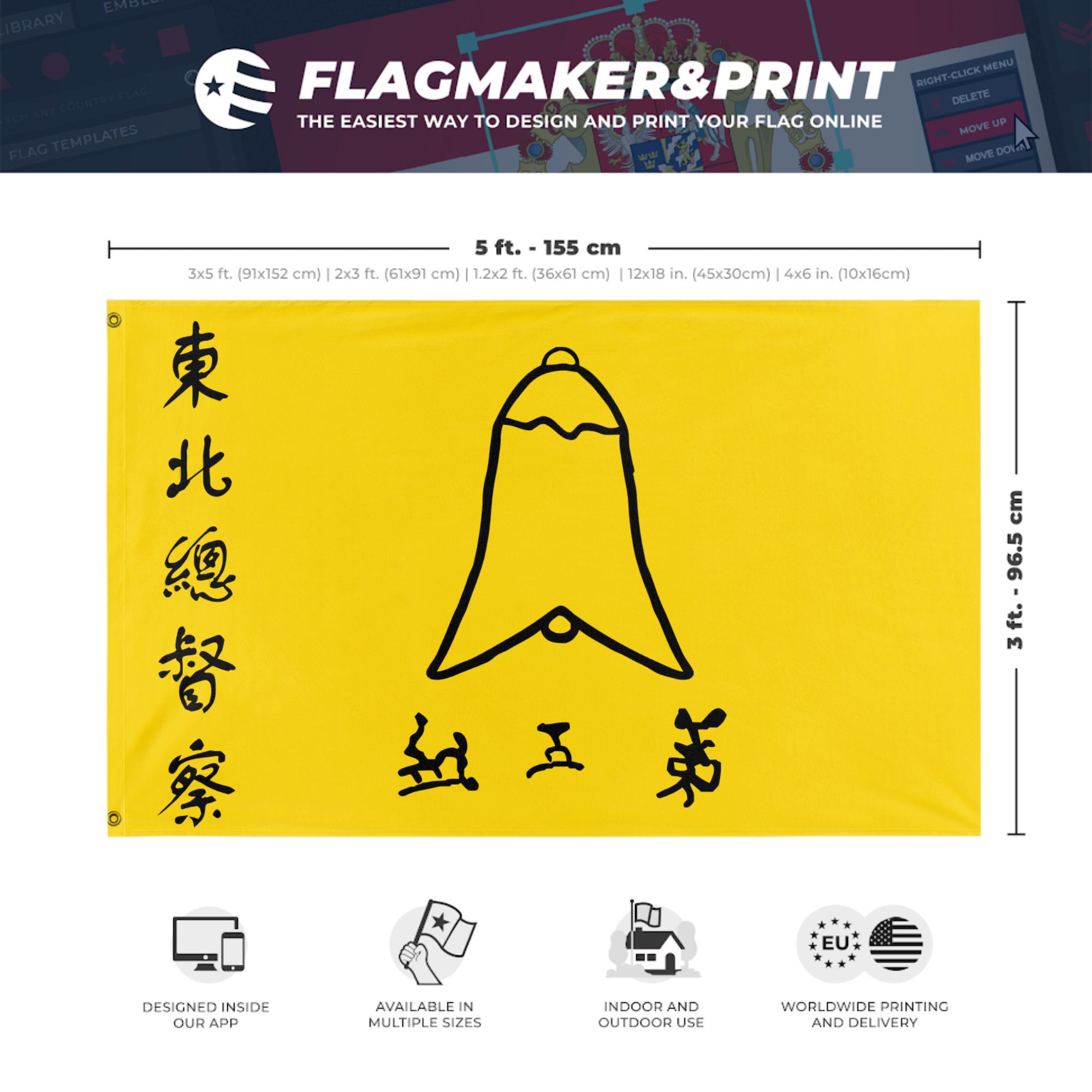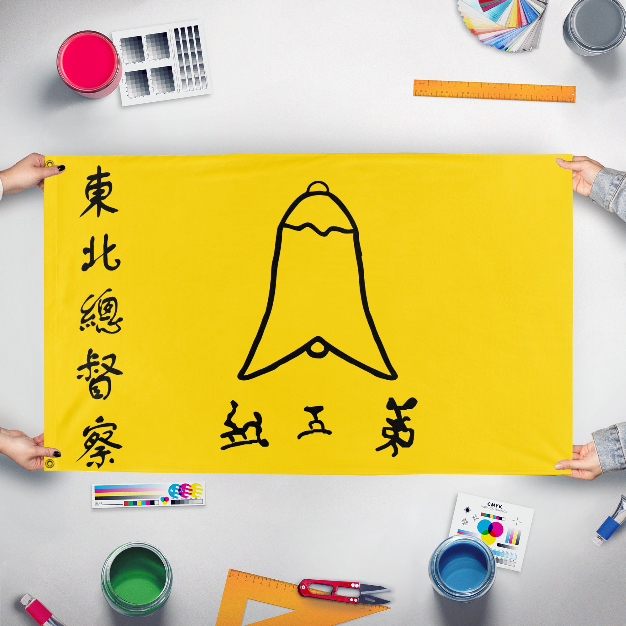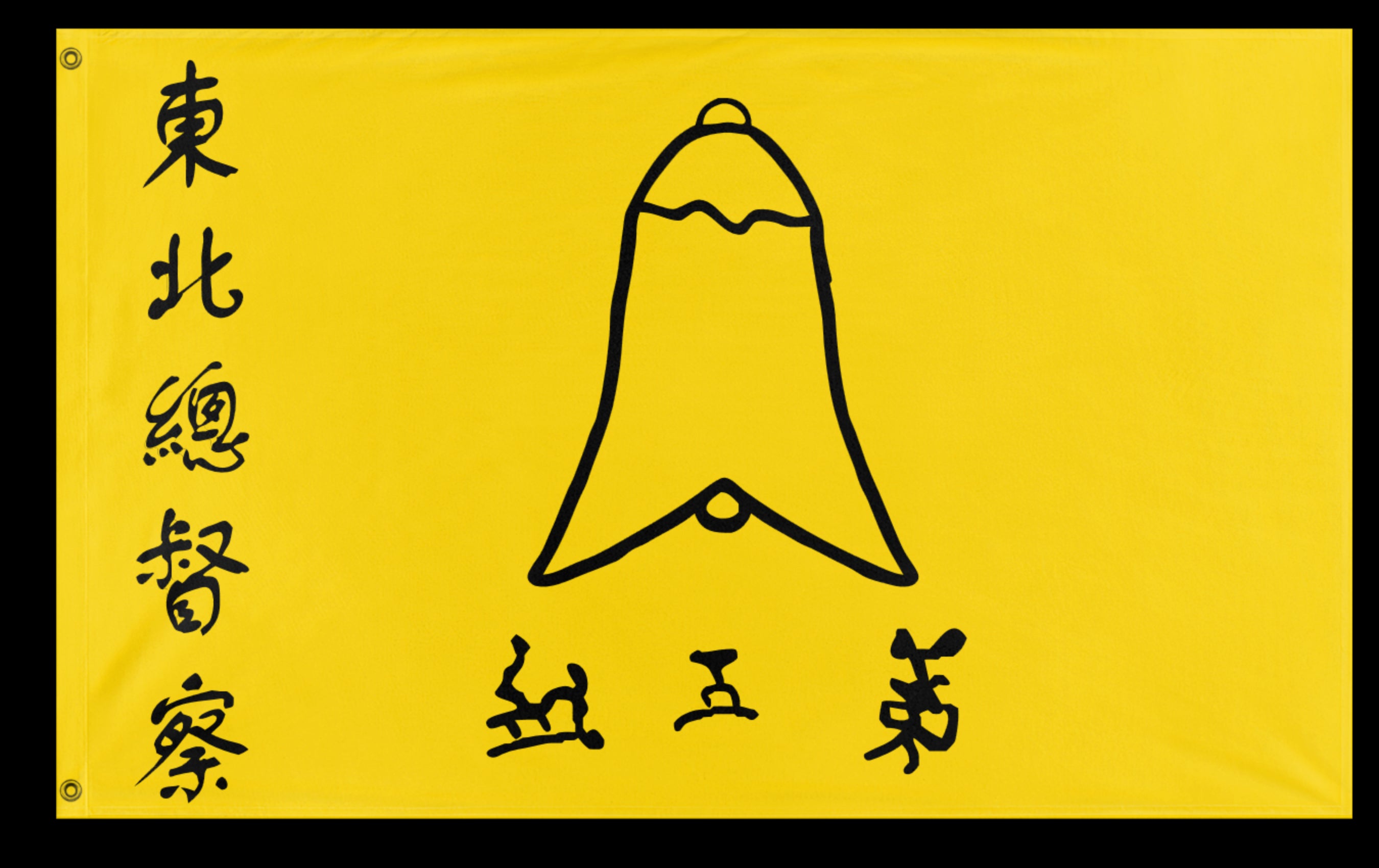 ✒️ The Flag of the Fengtian Clique is a historical banner representing the powerful Chinese warlord faction that controlled Manchuria (Northeast China) during the Warlord Era. The flag is characterized by its solid yellow field, a color symbolically linked to the Manchu people and the former Qing dynasty. Its design features black calligraphic inscriptions and a central emblem. The vertical text on the hoist (left) side reads "東北總督察" (Dōngběi Zǒngdūchá), which translates to "Inspector-General of the Northeast," referencing the clique's leadership. The central charge is a stylized outline of a traditional Qing official's hat (guan), further asserting its claim to regional governance, while additional characters are inscribed horizontally at the bottom.