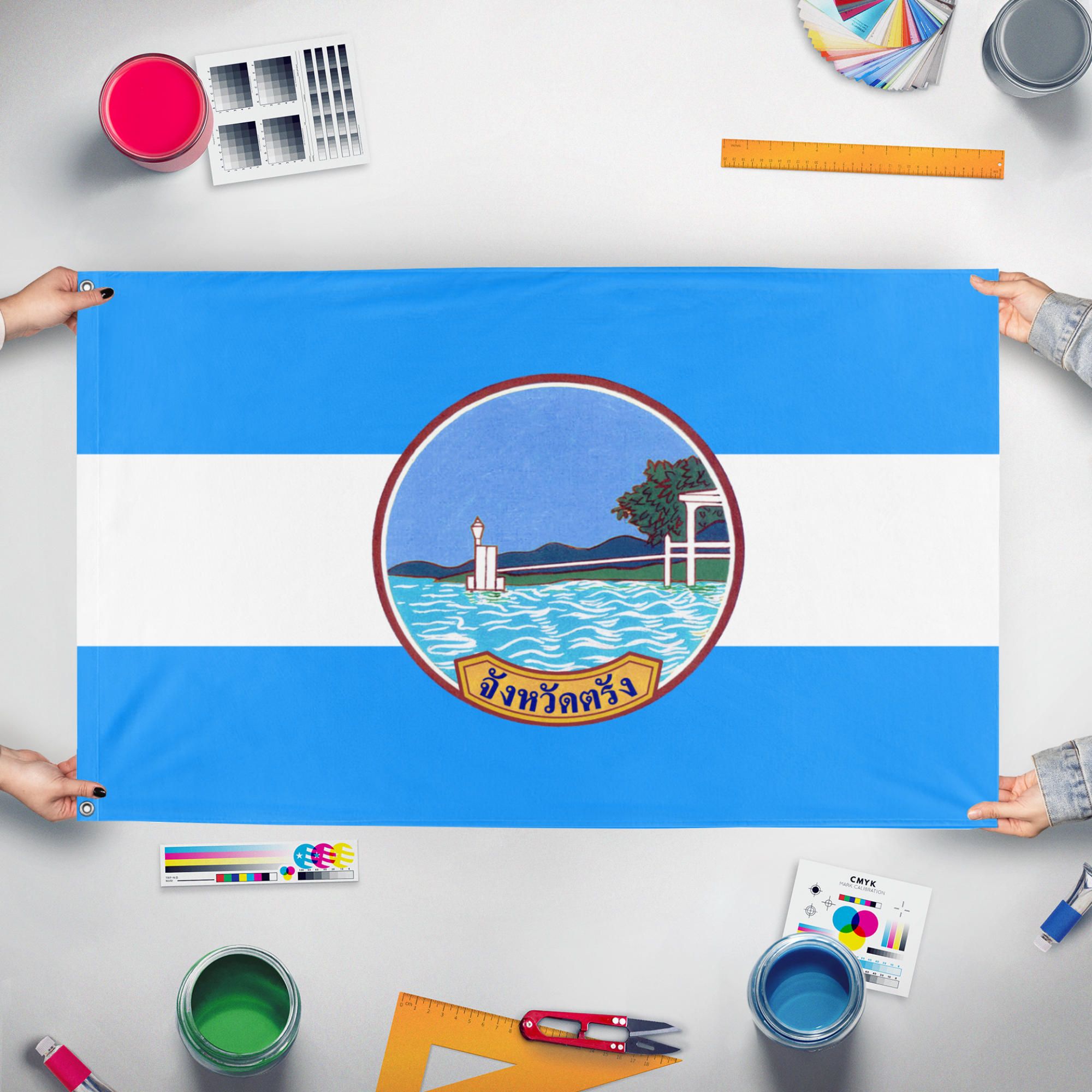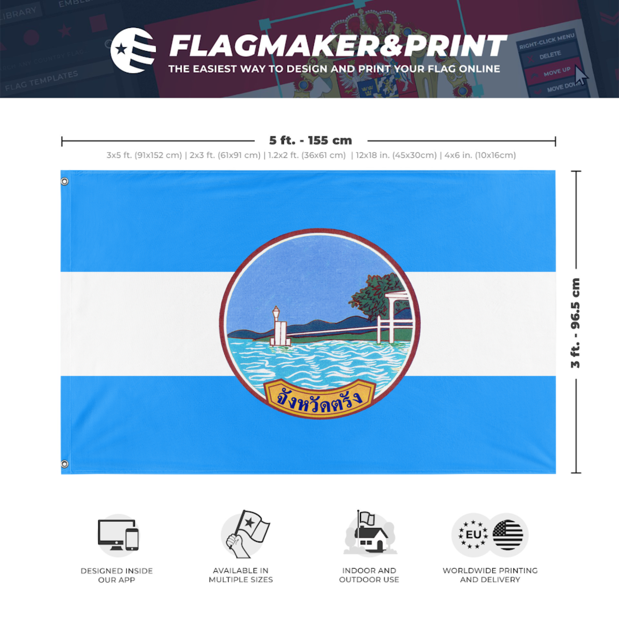 Our integrated flag maker app allows anyone to design and print their own flag. After finishing your design, you can print your flag in three easy steps.