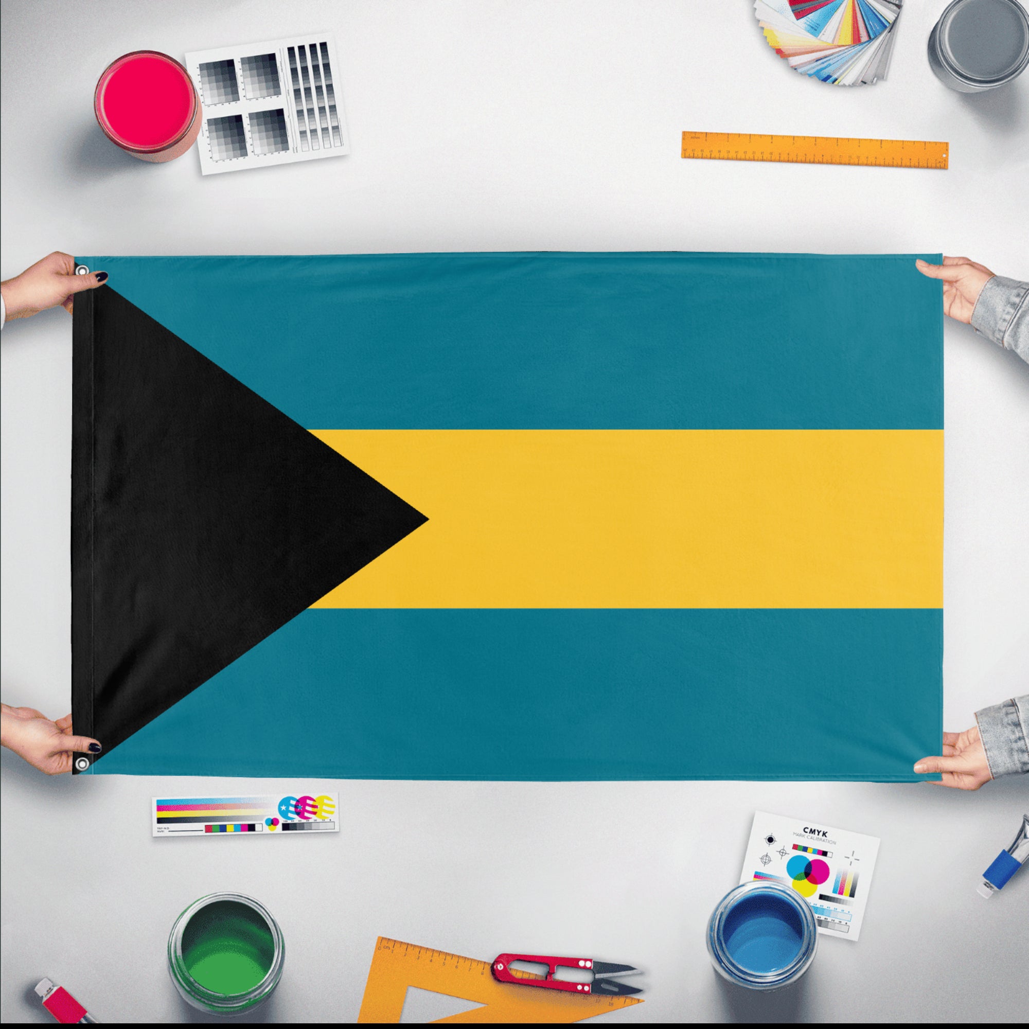 ✒️ The flag of the Bahamas consists of three horizontal bands of aquamarine, gold, and aquamarine, with a black equilateral triangle positioned at the hoist. The aquamarine stripes symbolize the surrounding Caribbean Sea, while the gold band represents the natural resources of the islands, particularly the sun and sandy beaches. The black triangle signifies the strength and will of the Bahamian people. Adopted on July 10, 1973, coinciding with the nation’s independence from the United Kingdom, the flag reflects the country’s identity and heritage.