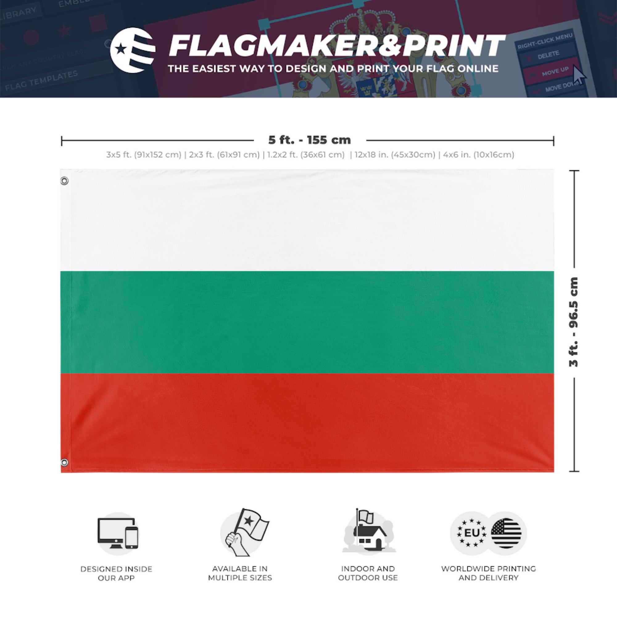 Our integrated flag maker app allows anyone to design and print their own flag. After finishing your design, you can print your flag in three easy steps.