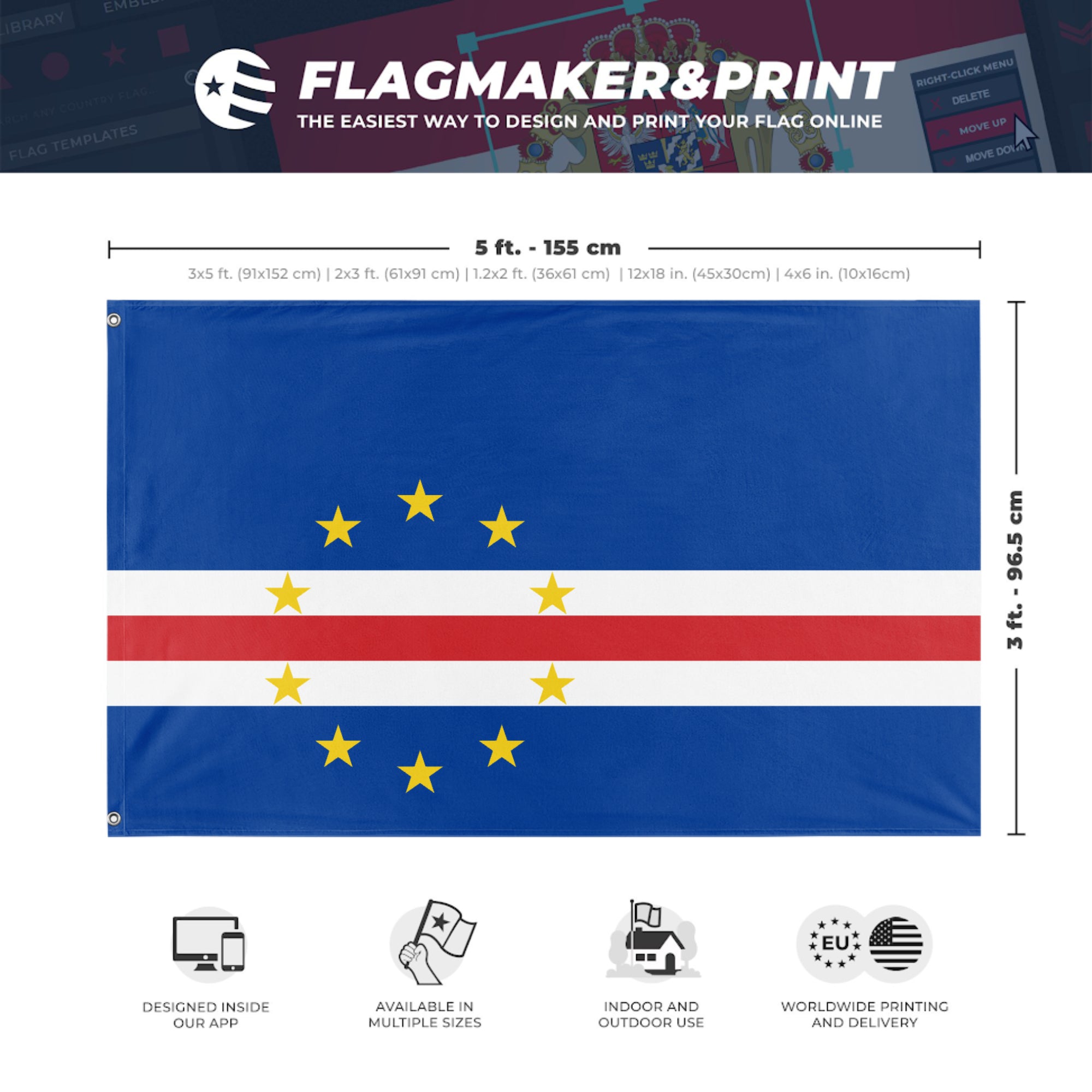 ✒️ The flag of Cabo Verde features five horizontal bands of blue, white, and red, with a circle of ten yellow five-pointed stars positioned slightly off-center toward the hoist. The blue field symbolizes the Atlantic Ocean and the sky, while the white and red stripes represent peace and the nation’s struggle for independence. The ten stars stand for the main islands of the archipelago. Officially adopted on September 22, 1992, the flag reflects Cabo Verde’s maritime heritage, unity, and national identity.