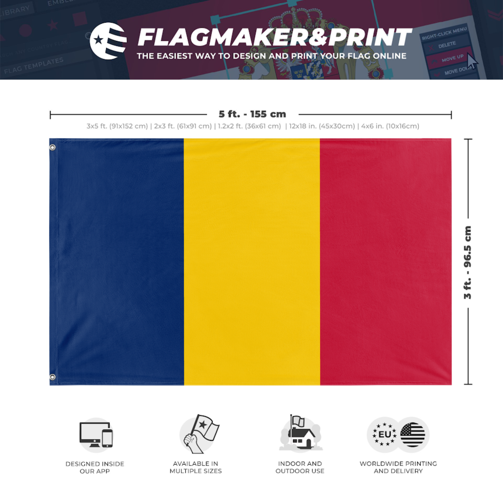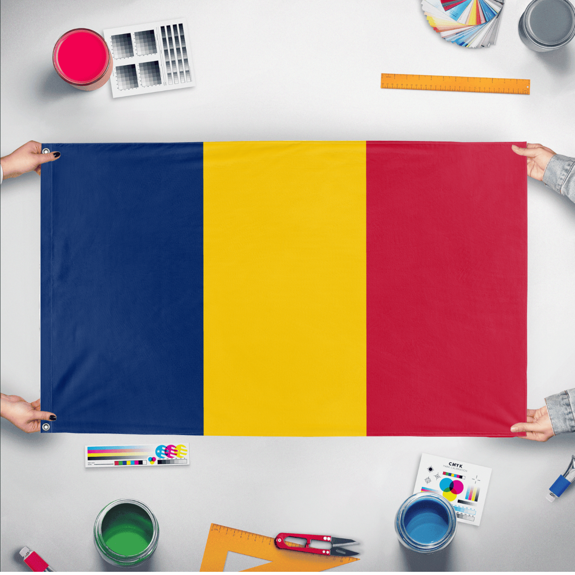Our integrated flag maker app allows anyone to design and print their own flag. After finishing your design, you can print your flag in three easy steps.