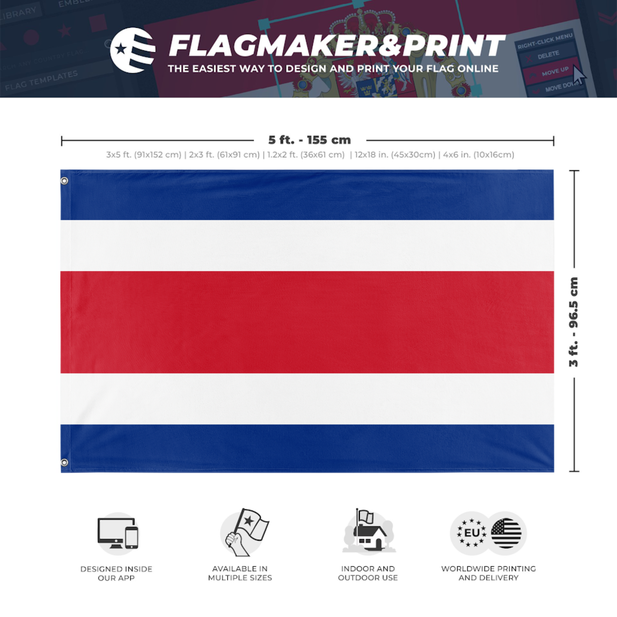 Our integrated flag maker app allows anyone to design and print their own flag. After finishing your design, you can print your flag in three easy steps.