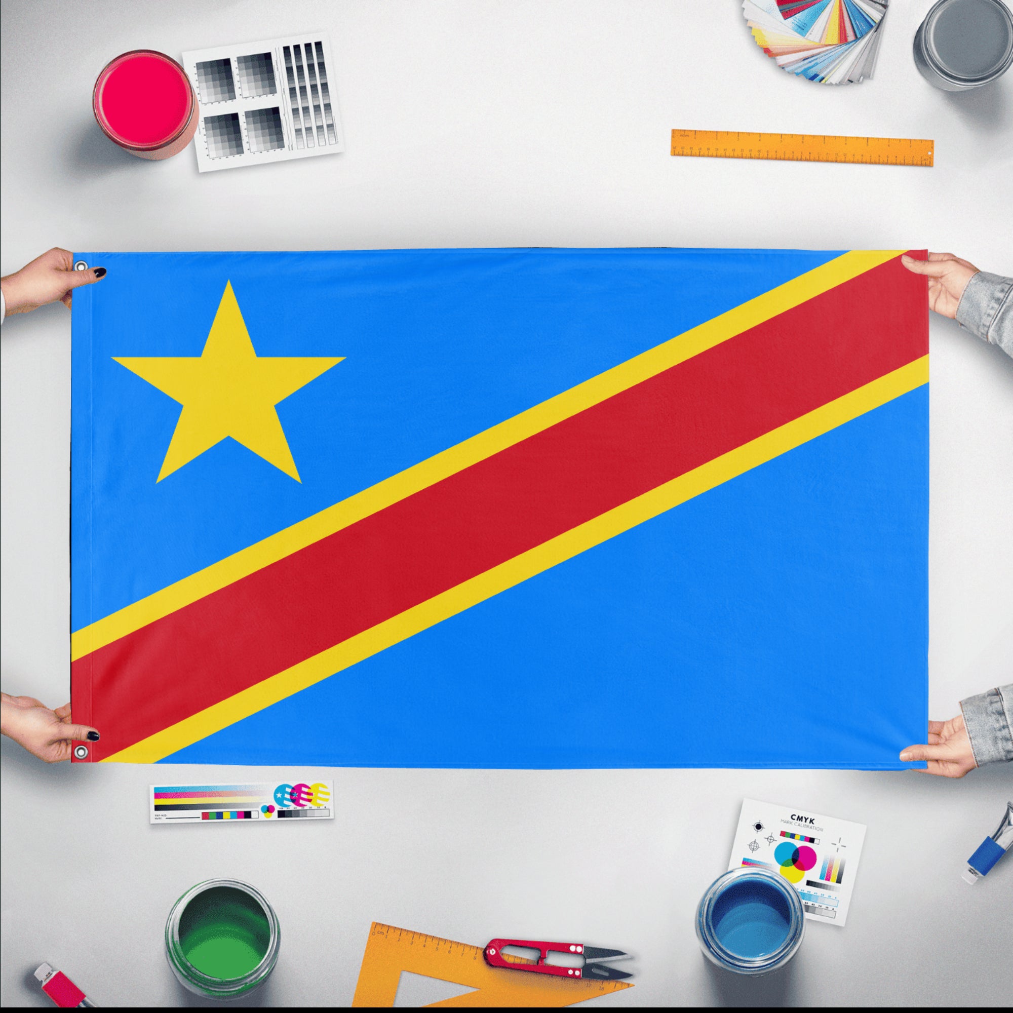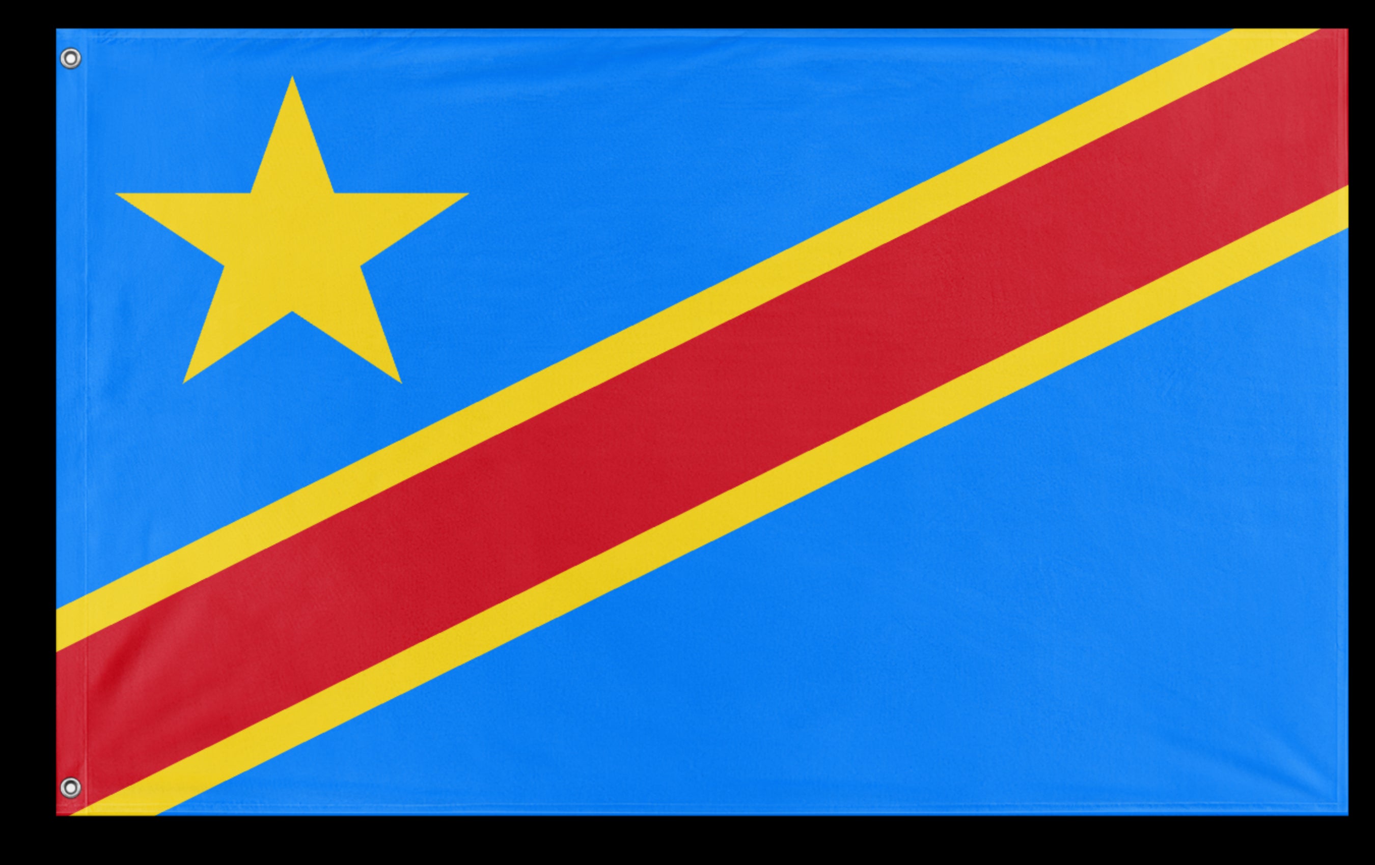 ✒️ The flag of the Democratic Republic of the Congo features a sky blue field with a yellow five-pointed star in the upper hoist corner and a diagonal red stripe bordered by narrow yellow stripes running from the lower hoist to the upper fly side. The blue symbolizes peace and hope, the red represents the blood of the country’s martyrs, and the yellow signifies the nation’s wealth and prosperity. Officially adopted on February 20, 2006, the flag reflects the country’s aspirations for peace, unity, and development following years of conflict.
