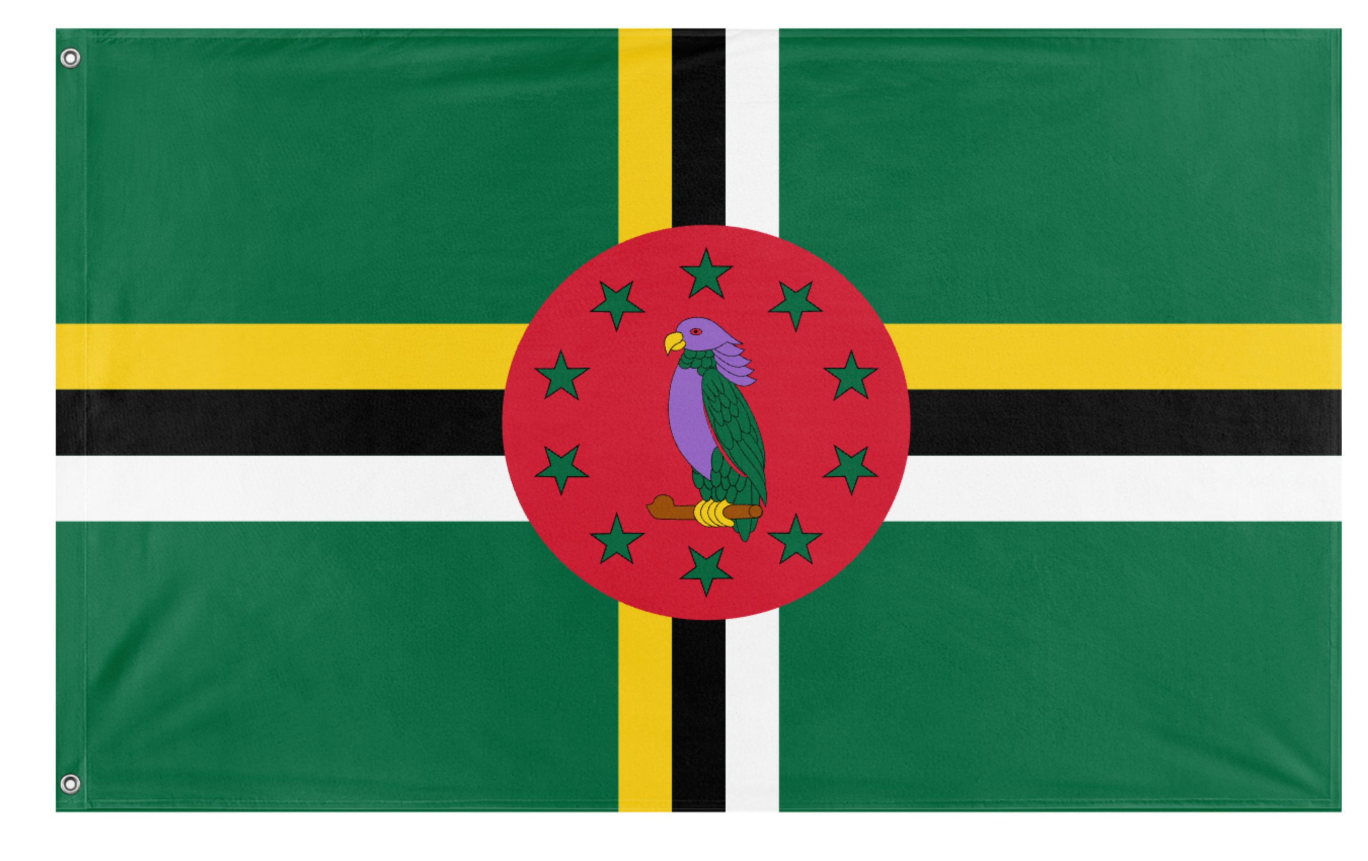 ✒️ The flag of Dominica features a green field with a centered cross of three bands—yellow, black, and white—extending to the edges. At the center of the cross is a red circle bearing a purple Sisserou parrot encircled by ten green five-pointed stars. The green symbolizes the island’s lush vegetation, the cross represents the Trinity and the island’s Christianity, while the yellow, black, and white bands reflect the native people, soil, and purity. The Sisserou parrot is a national symbol of Dominica, and the ten stars represent the country’s ten parishes. Officially adopted on November 3, 1978, the flag embodies Dominica’s natural beauty, heritage, and unity.