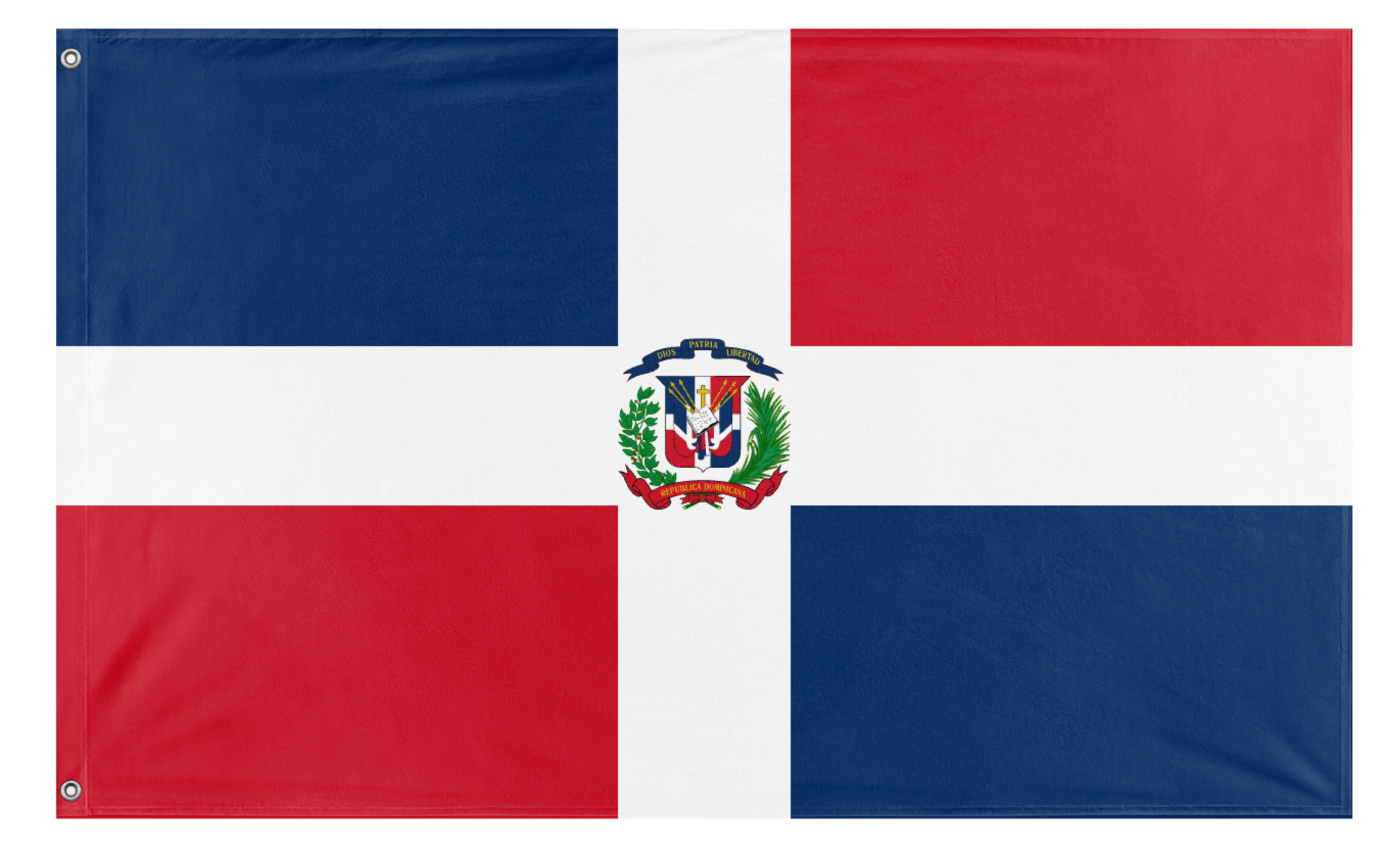 ✒️ The flag of the Dominican Republic features a centered white cross that divides the flag into four rectangles—two blue and two red. The blue symbolizes liberty, the red stands for the blood of heroes, and the white cross represents salvation. At the center of the cross is the national coat of arms, which includes a shield flanked by olive and palm branches and a ribbon bearing the national motto, "Dios, Patria, Libertad" ("God, Fatherland, Liberty"). Officially adopted on November 6, 1844, the flag reflects the country's struggle for independence, Christian heritage, and national identity.