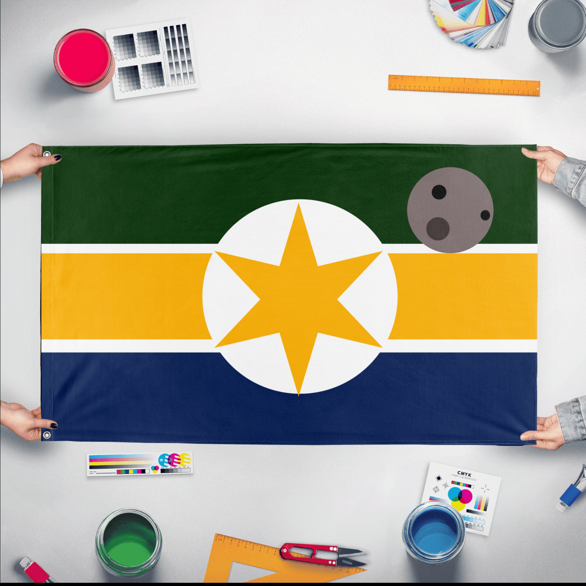Our integrated flag maker app allows anyone to design and print their own flag. After finishing your design, you can print your flag in three easy steps.