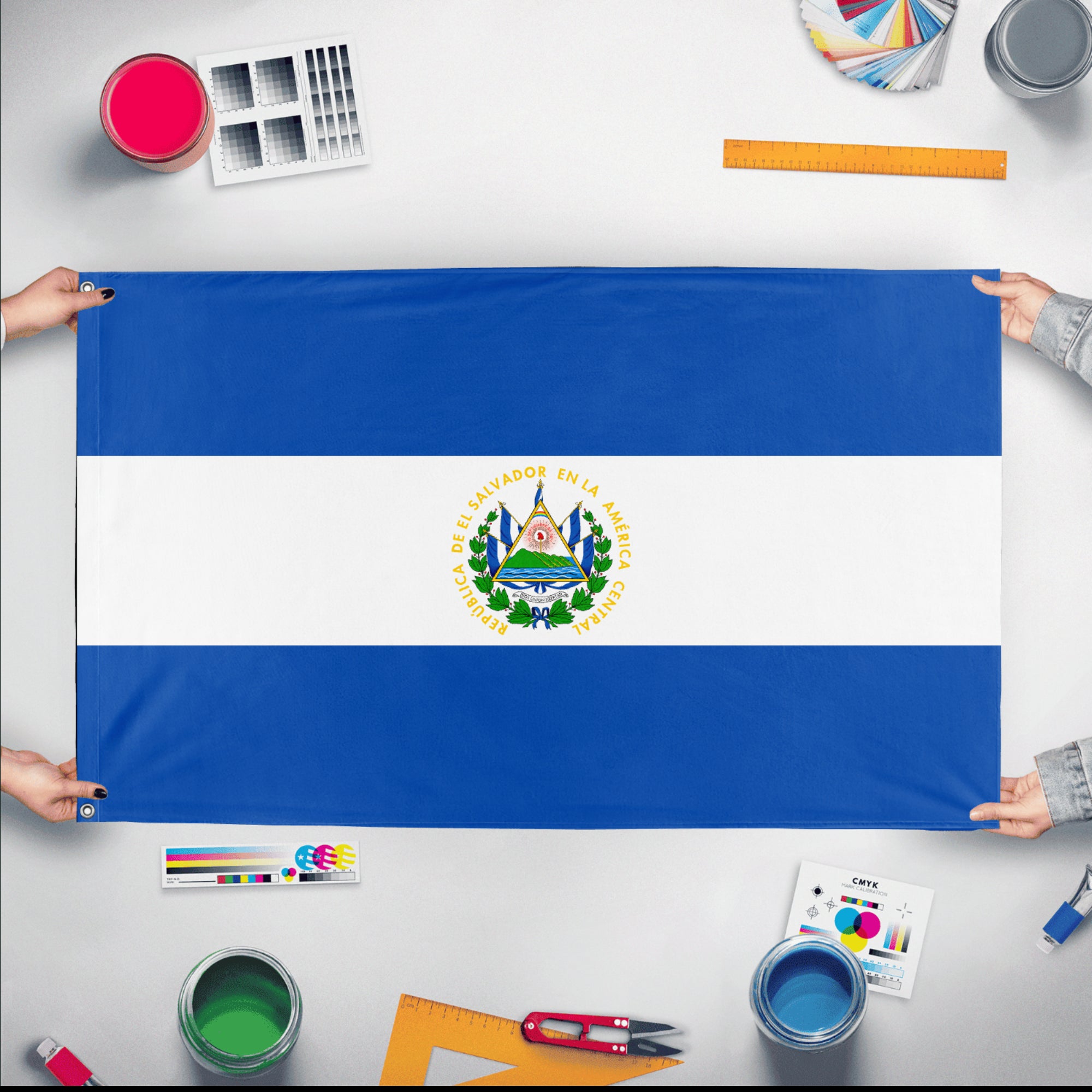 ✒️ The flag of El Salvador features three horizontal stripes of blue, white, and blue, with the national coat of arms centered on the white band. The blue stripes represent the Pacific Ocean and the Caribbean Sea, symbolizing the country’s geographical location, while the white stripe stands for peace and unity. The coat of arms includes a triangle containing five volcanoes, representing the five member states of the United Provinces of Central America, along with symbols of liberty and sovereignty. Officially adopted on May 27, 1912, the flag embodies El Salvador’s history, independence, and national pride.
