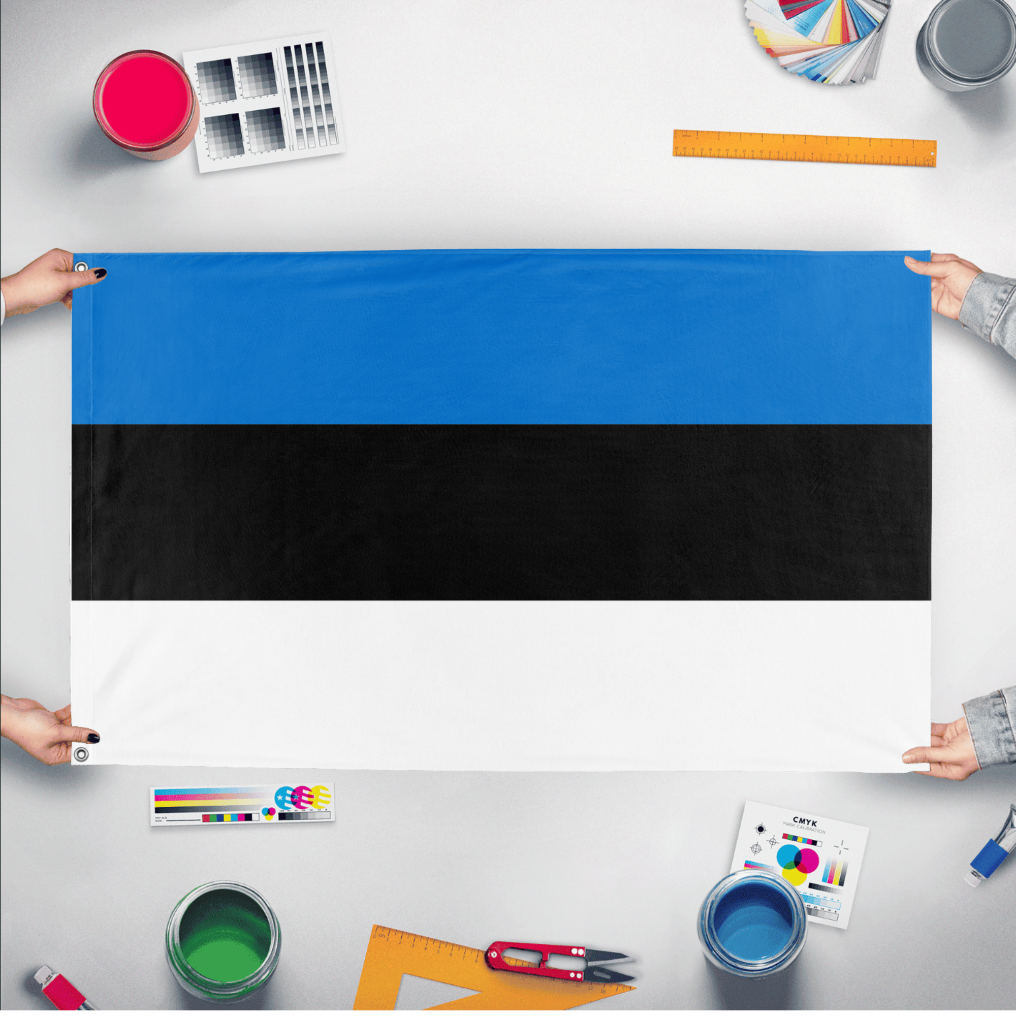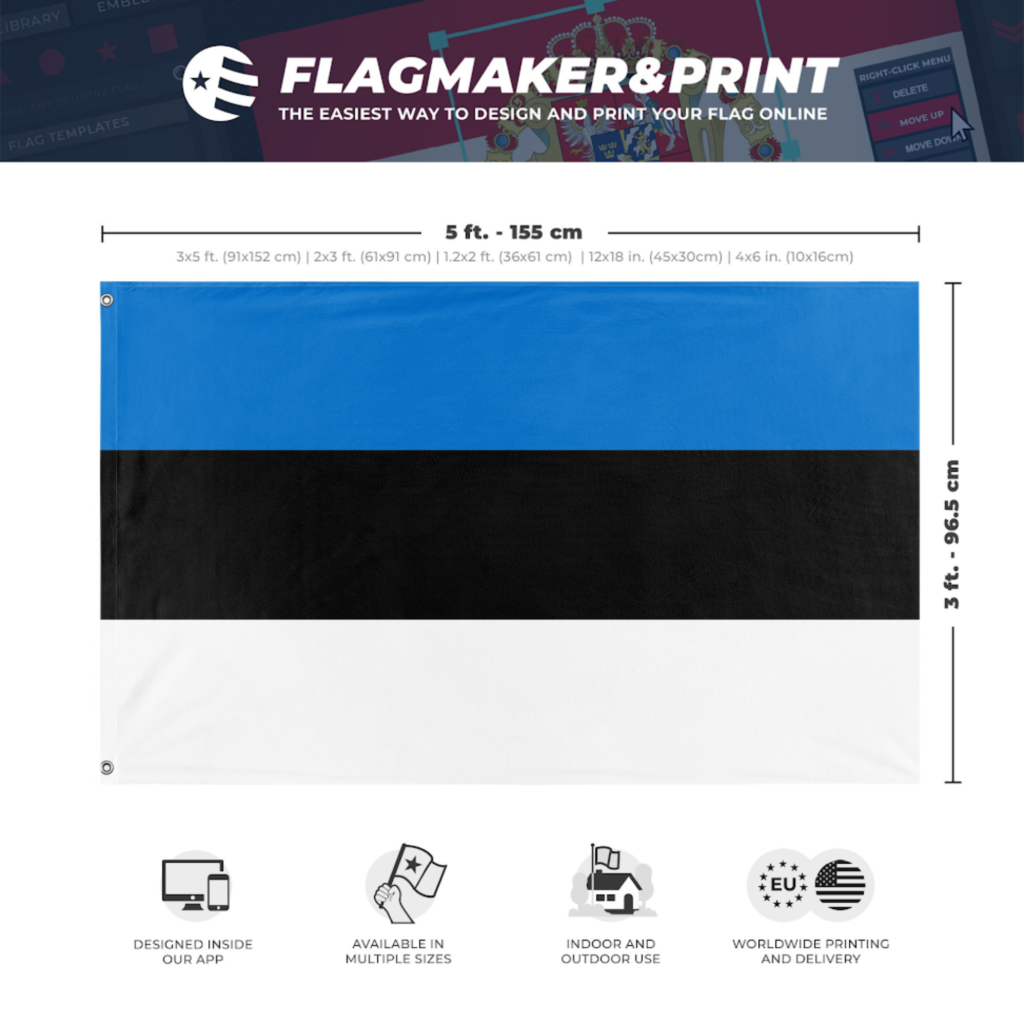 Our integrated flag maker app allows anyone to design and print their own flag. After finishing your design, you can print your flag in three easy steps.