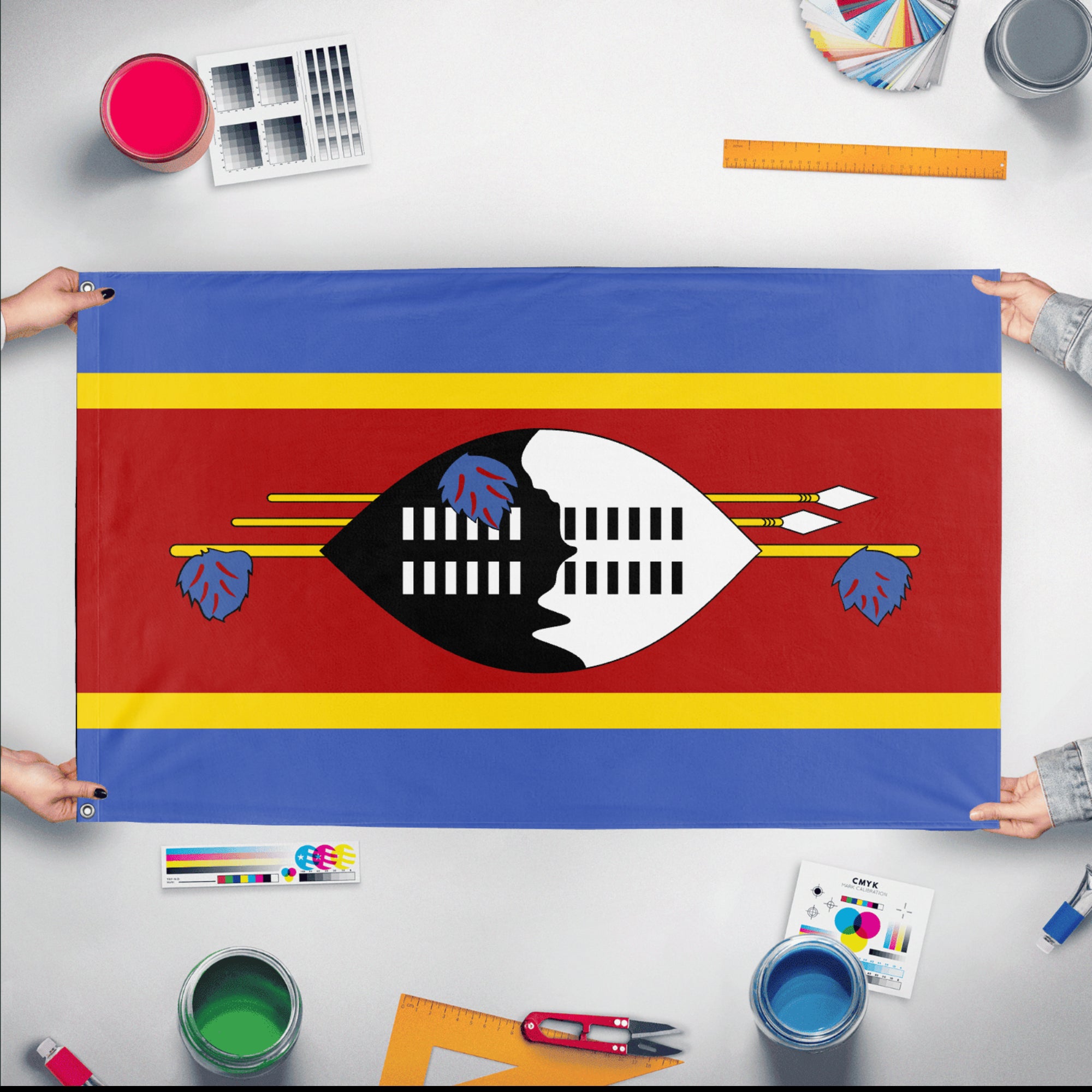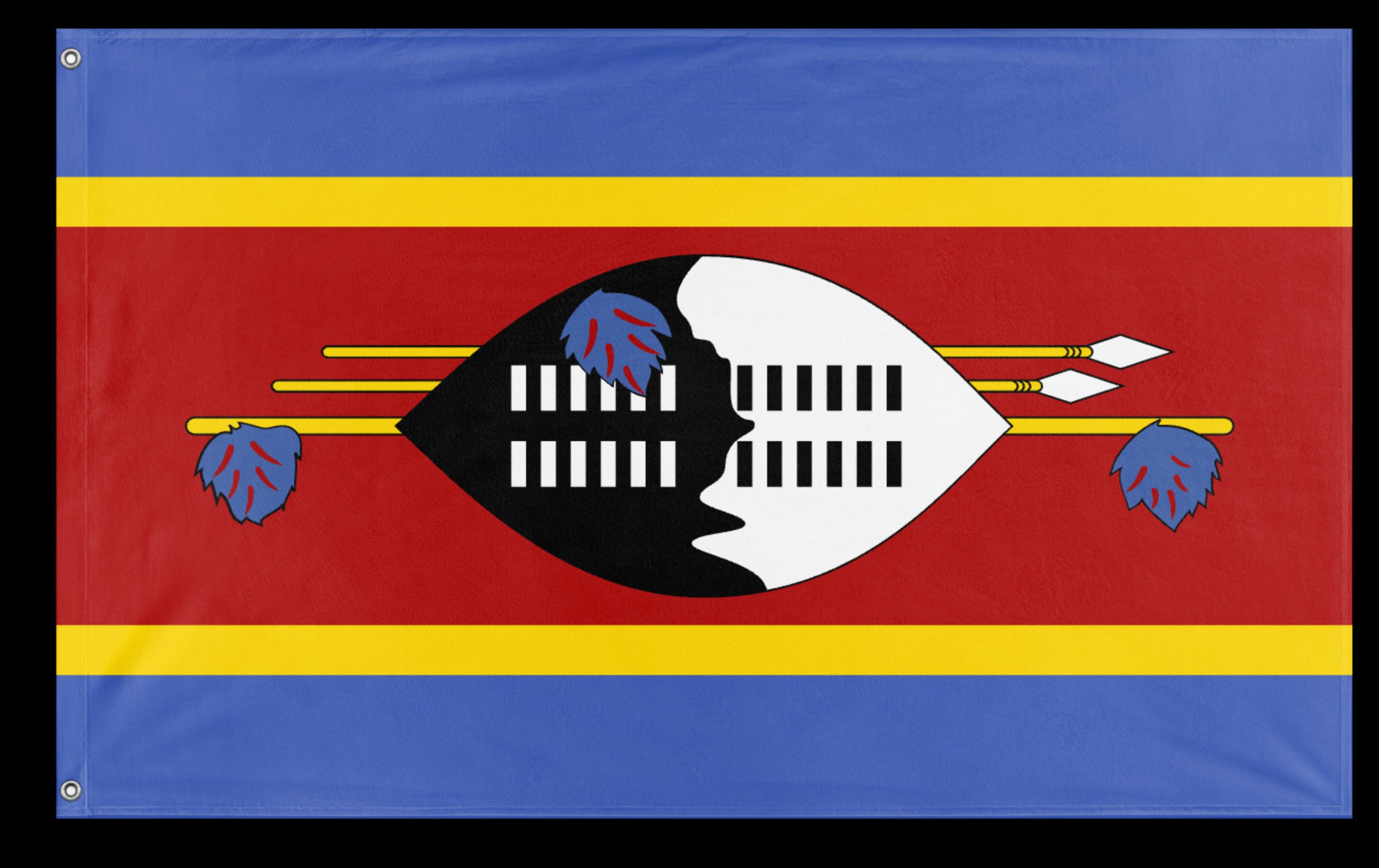 ✒️ The flag of Eswatini features a horizontal triband of blue, yellow, and blue, separated by a broad red band with thin yellow stripes. Centered on the red band is a traditional Nguni shield, crossed by two spears and a staff adorned with feather tassels, symbolizing protection from the country’s enemies. The red represents past struggles for independence, the blue stands for peace and stability, and the yellow signifies the country’s natural resources. Officially adopted on October 6, 1968, the flag reflects Eswatini’s cultural heritage, sovereignty, and national pride.